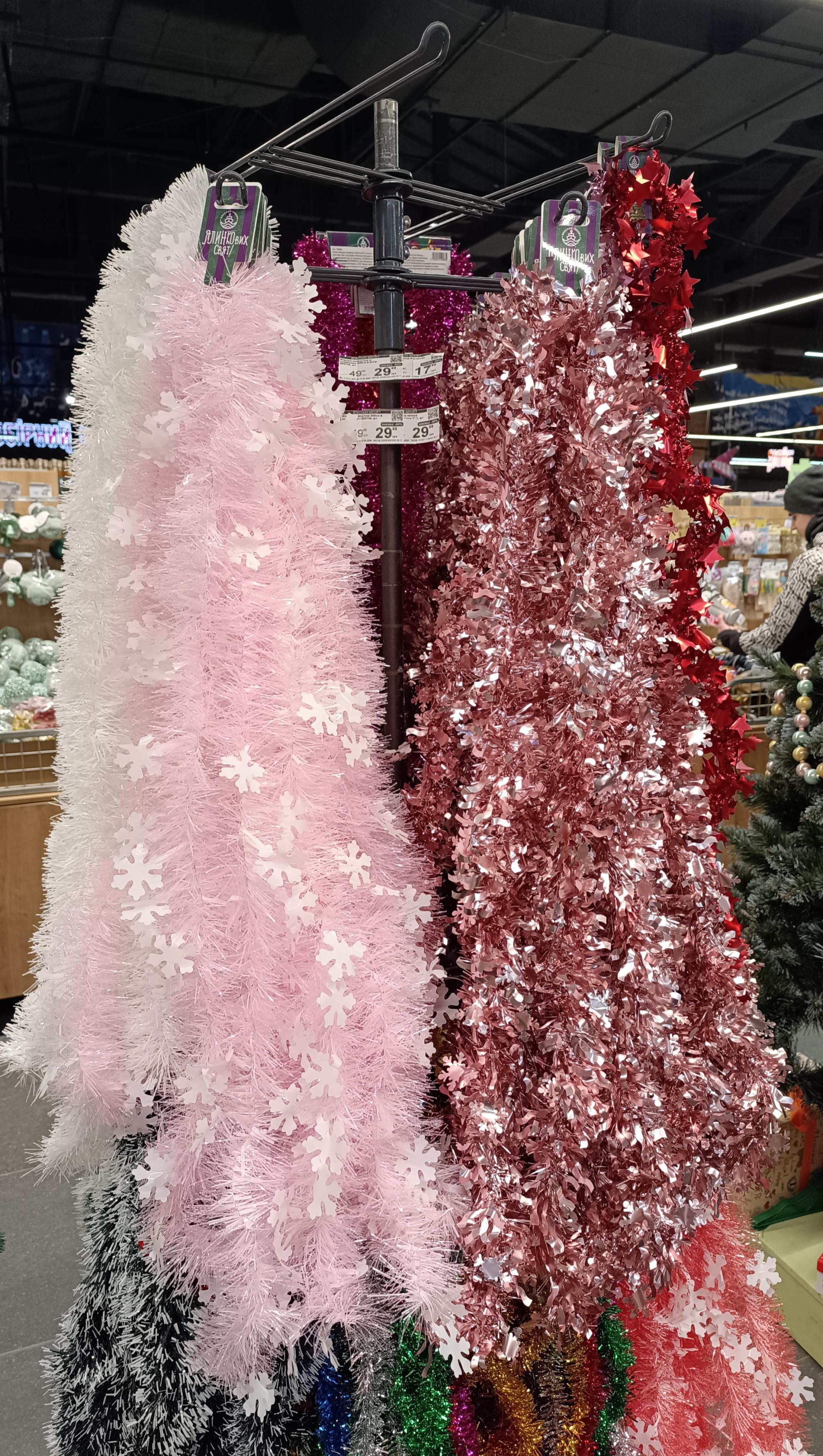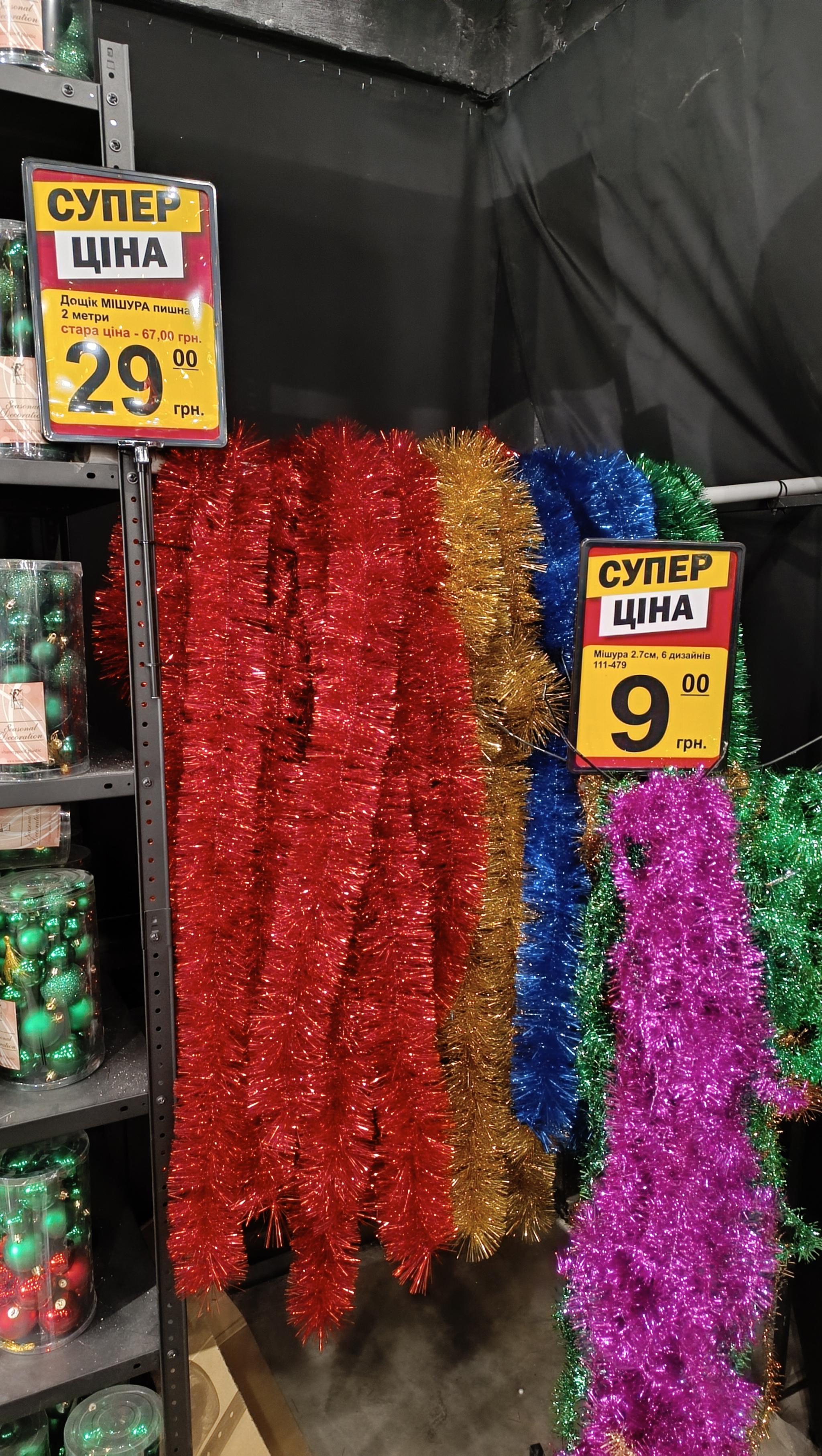 Різнокольорове намисто на ялинку в «Аврорі» вартує 44 і 55 гривень за 3 і 5 метрів відповідно. Новорічний дощик від 22 до 39 гривень за один. В ArtDekor дощик по 9 і 29 гривень. Великий вибір таких товарів і у «Сільпо», зокрема, по 17-49 гривень за штуку.