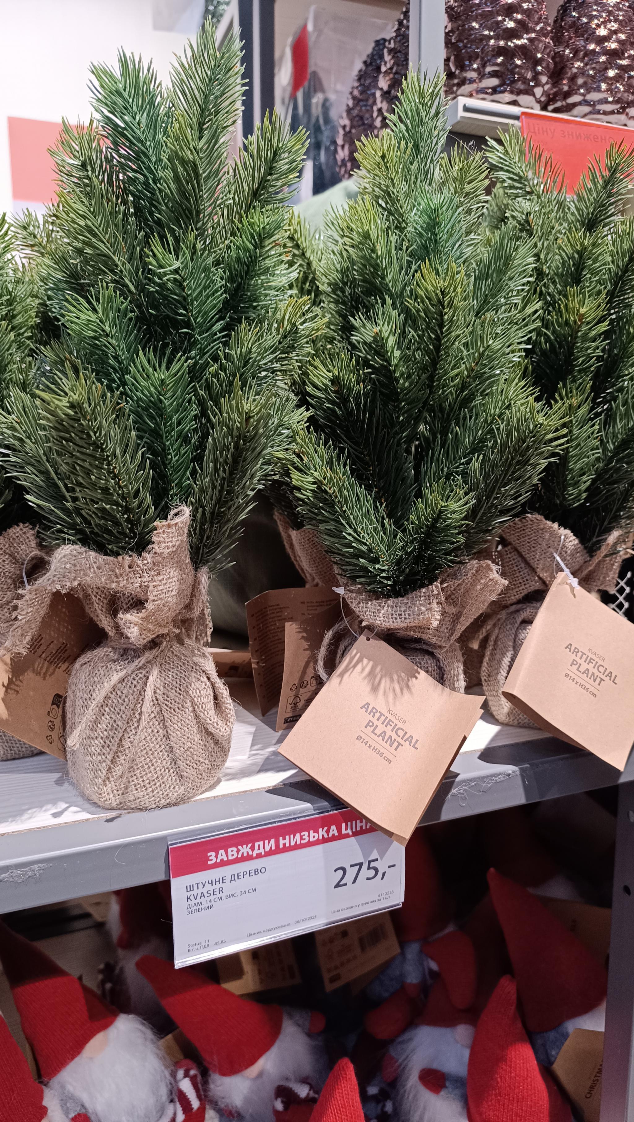 Не дорогу і невеличку штучну ялинку можна придбати в магазині «Аврора». До прикладу, ялинка зі штучним снігом на дерев’яній підставці вартуватиме 149 грн за 30 сантиметрів, і 179 гривень за 50 см, штучна сосна — 129 грн. Також є настільні декоративні ялиночки в діапазоні 39 — 129 гривень.