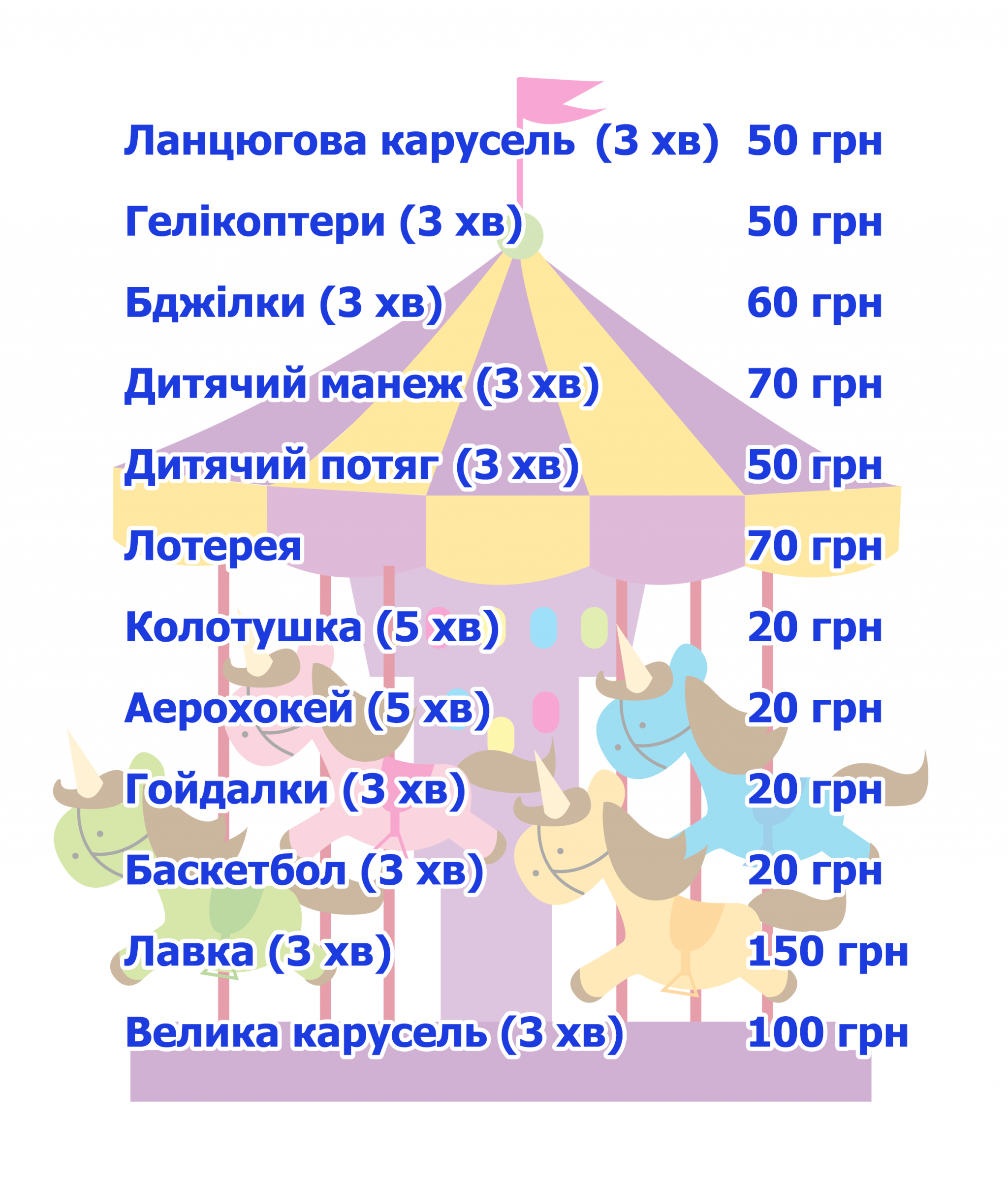 - Показуємо на фото головні розваги, розповідаємо про ціни та графік роботи.