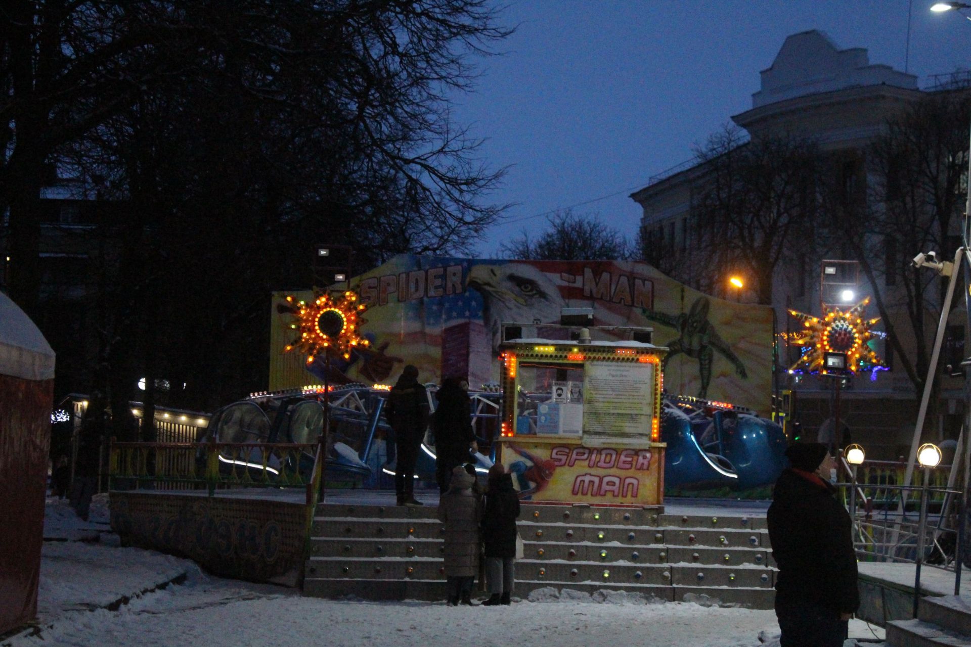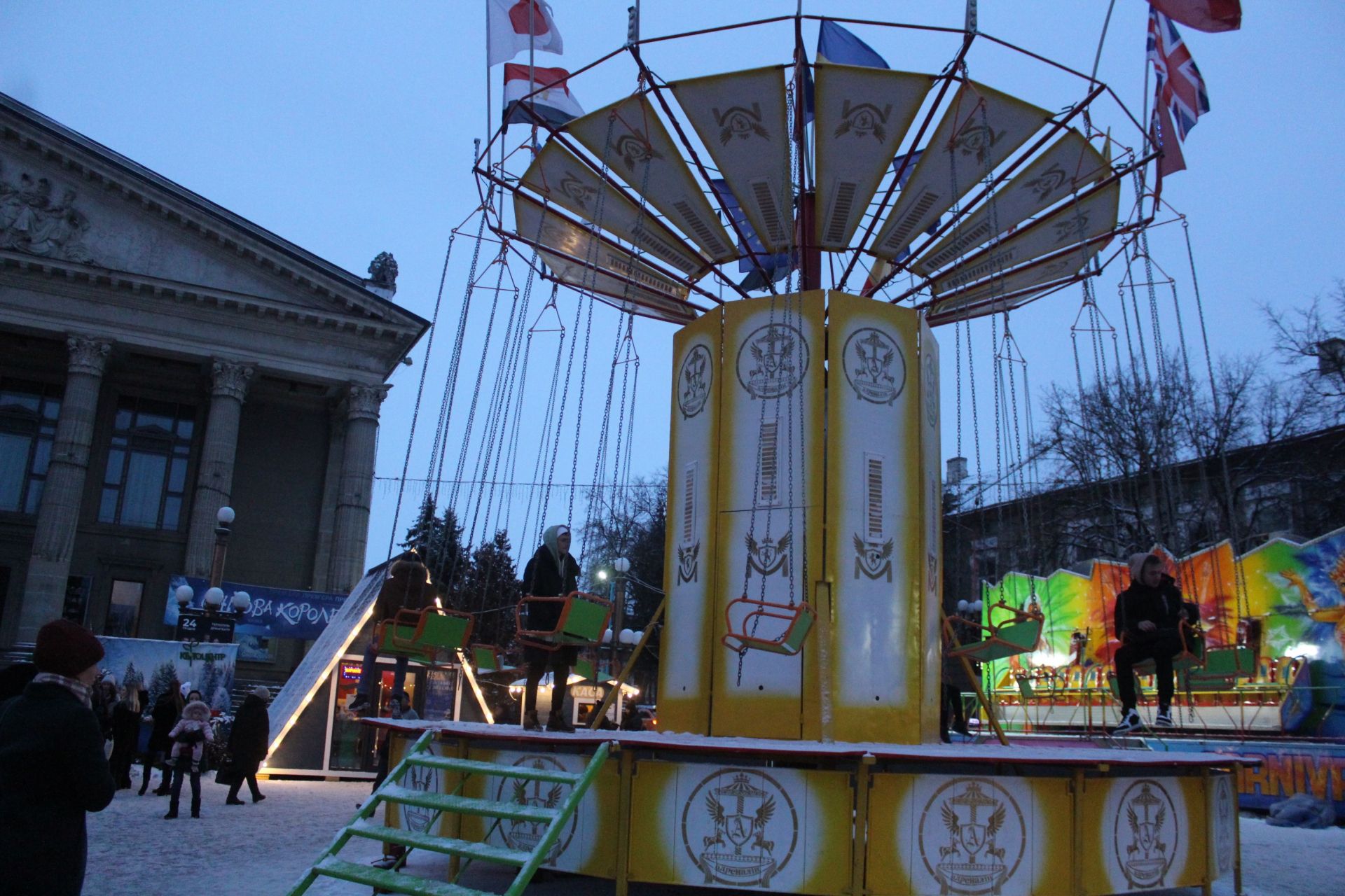 На Театральному майдані розмістили чимало атракціонів. Деякі, на час нашого репортажу, працювали. Деякі — чекали своїх відвідувачів. Вибрати цього року є з чого. Атракціони розмістили і в напрямку вулиці Листопадова.