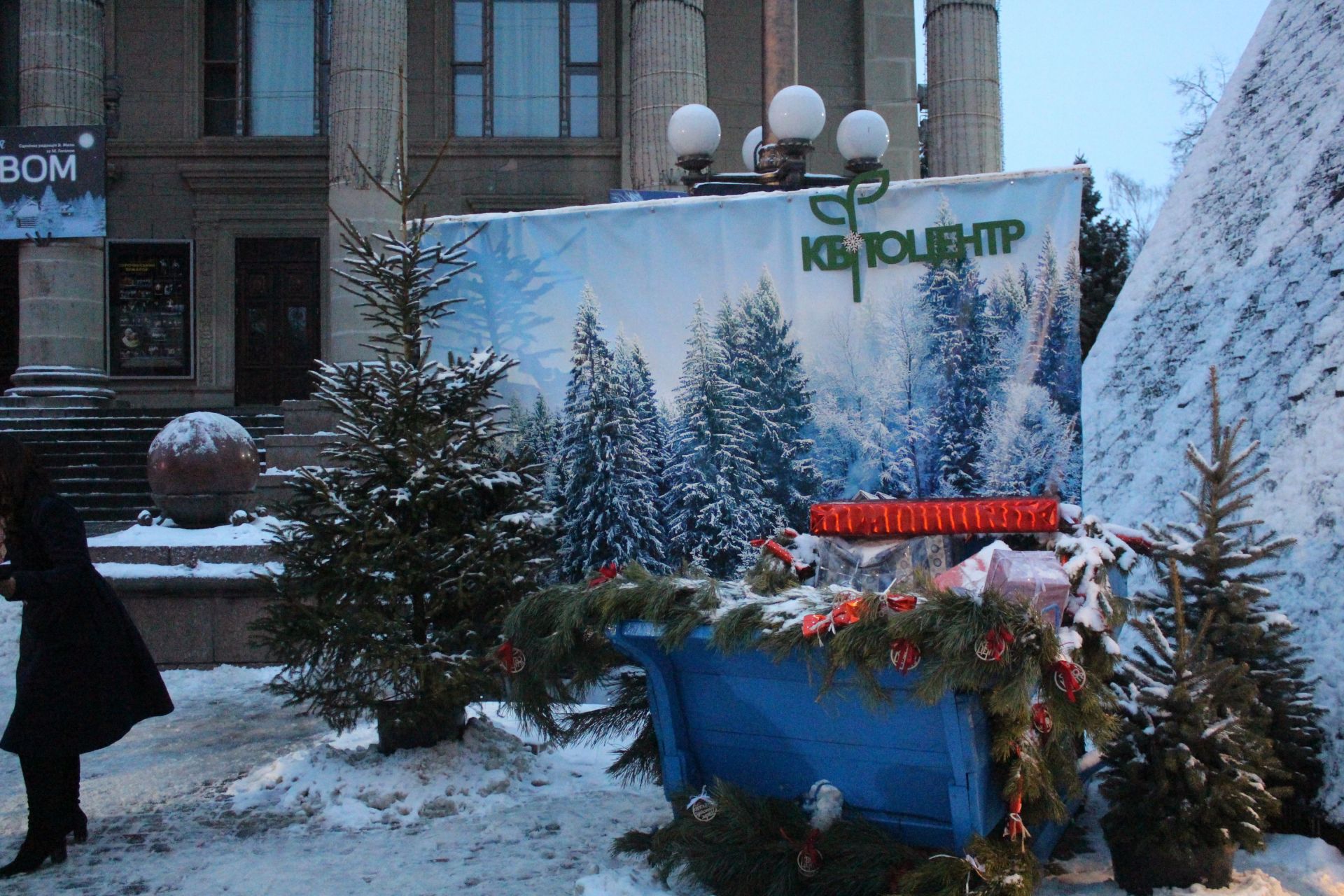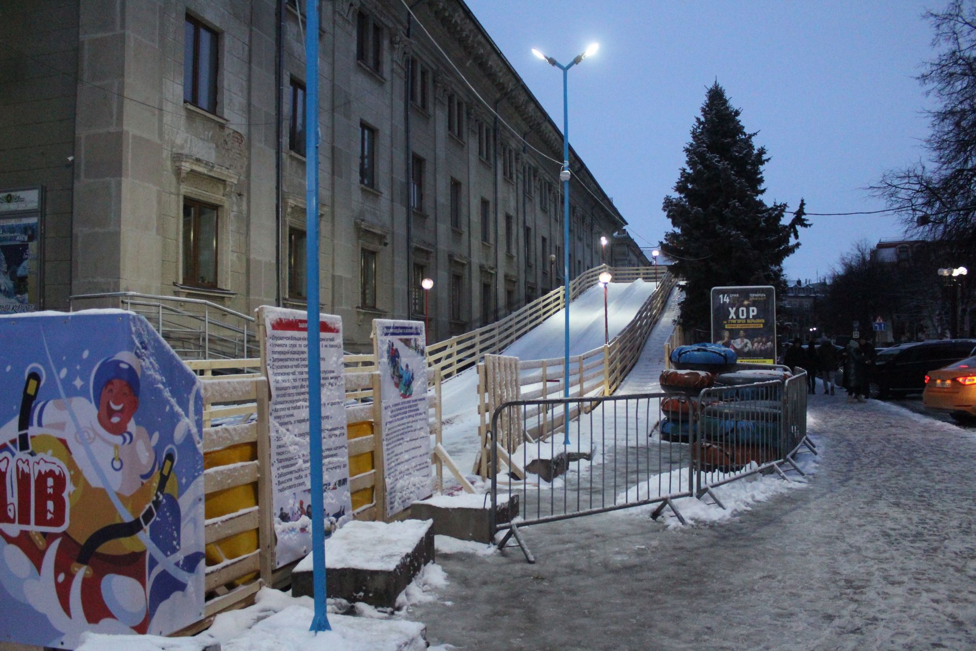 А от гірка для сноутюбів наразі пустує. Її встановили одразу біля будівлі драмтеатру. Відвідувачів тут на час репортажу не було.
