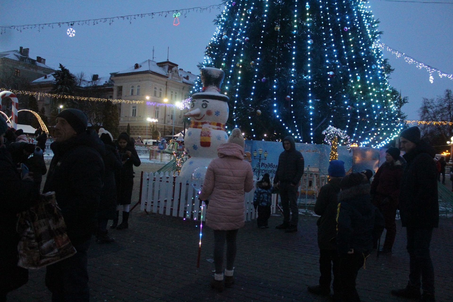 - У центрі Тернополя уже відчувається новорчіна атмосфера. Увечері Театральний майдан сяє тисячами вогників, а люди цілими сім'ями приходять до головної ялинки області.