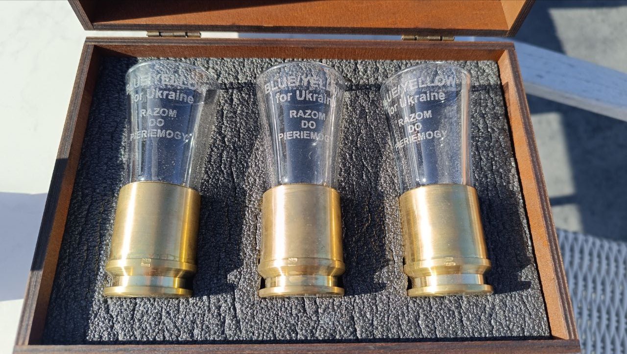 Келихи з латунних гільз поїдуть до Лондона. Їх придбав за 6500 грн Пол, колишній військовий, який зараз активно допомагає захисникам в Україні, зокрема, іноземцям.