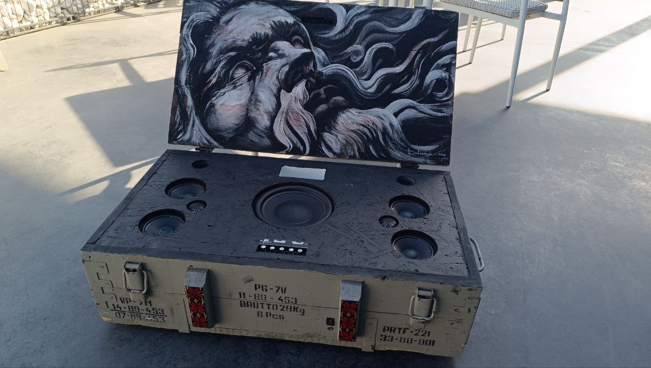 Акустичний центр від спецпідрозділу «Сафарі», зроблений військовослужбовцем Остапом Пацалюком та розфарбований художником Рустамом Давлетовим. Таку колонку за 10 тисяч гривень на благодійному аукціоні придбала підприємиця Ірина Демчук. Ще у 2022 році вона релокували до Тернополя своє виробництво із Сумщини.