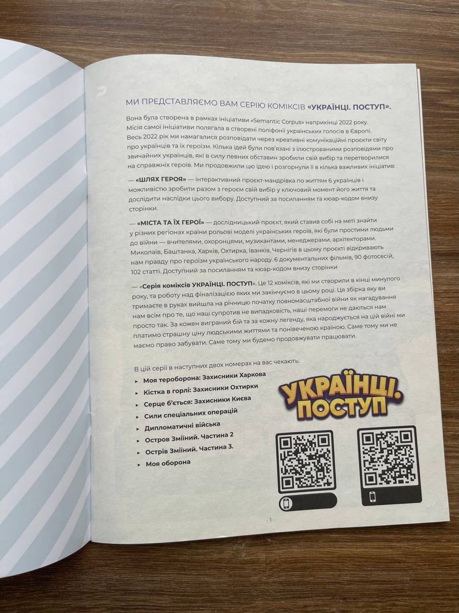 Довідка. Окрім коміксів, команда «Семантичного корпусу» спільно з партнерами відзняли 6 документальних фільмів, описали 90 історій простих українців, які стали справжніми героями у своїх громадах, створили понад 90 фотосесій в окремому проєкті «Міста та їх герої». Презентуватимуть доробки для українців та європейців вже у 2023 році, найближчим часом.