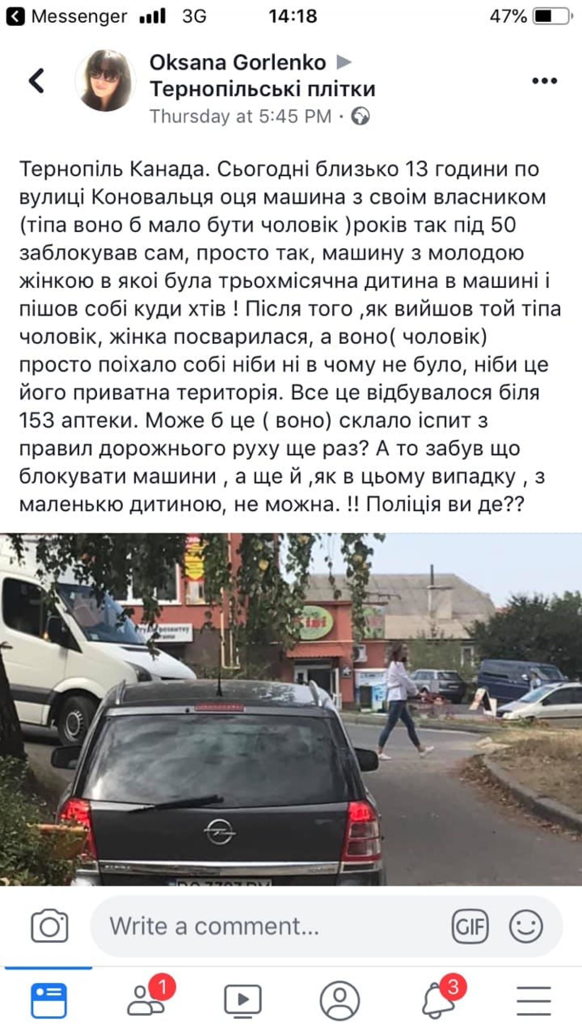 - Я чесно до нього уже не говорила на Ви. Запитала: “Ти що зробив?”, а він мені відповів: “Це, щоб навчити тебе читати”, - продовжує тернополянка. - Бо, бачте, на тій огорожі написано “В’їзд не перешкоджати”. Я кажу, що це взагалі за знак такий. І до того ж, він не стояв на дорозі, коли я заїжджала, я його не відсувала, нікому в‘їзд не перешкоджала і це не приватна власність. Я йому сказала, щоб він розблокував мені авто. Той сміявся. Я підійшла ближче, щоб сфотографувати його та авто, чую від нього запах алкоголю. І кажу, що все з ним ясно і що там говорити. Я почала звертатися до всіх людей, які були навколо, що жоден із чоловіків навіть не заступиться за жінку із дитиною. Тоді до нього хтось звернувся, він аж тоді від’їхав і ще з такою єхидною посмішкою.