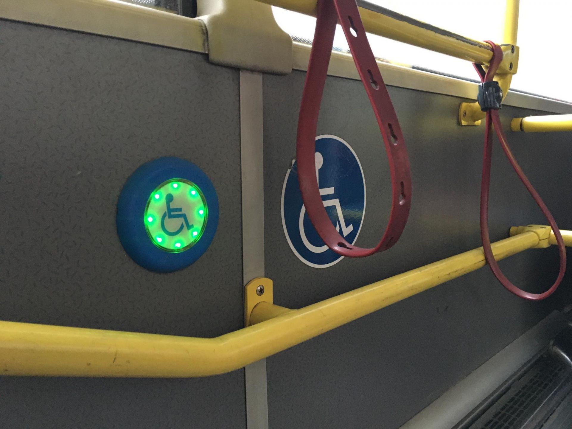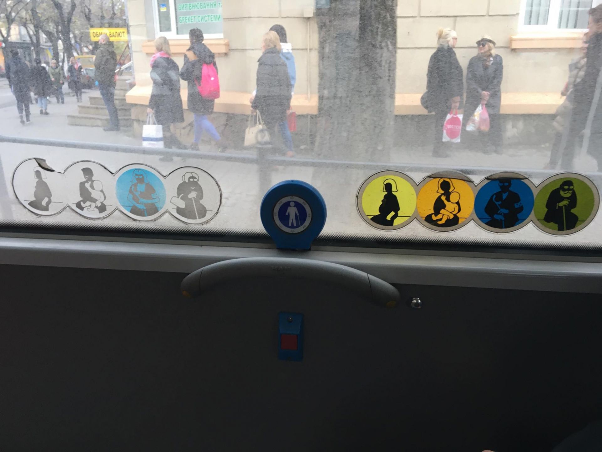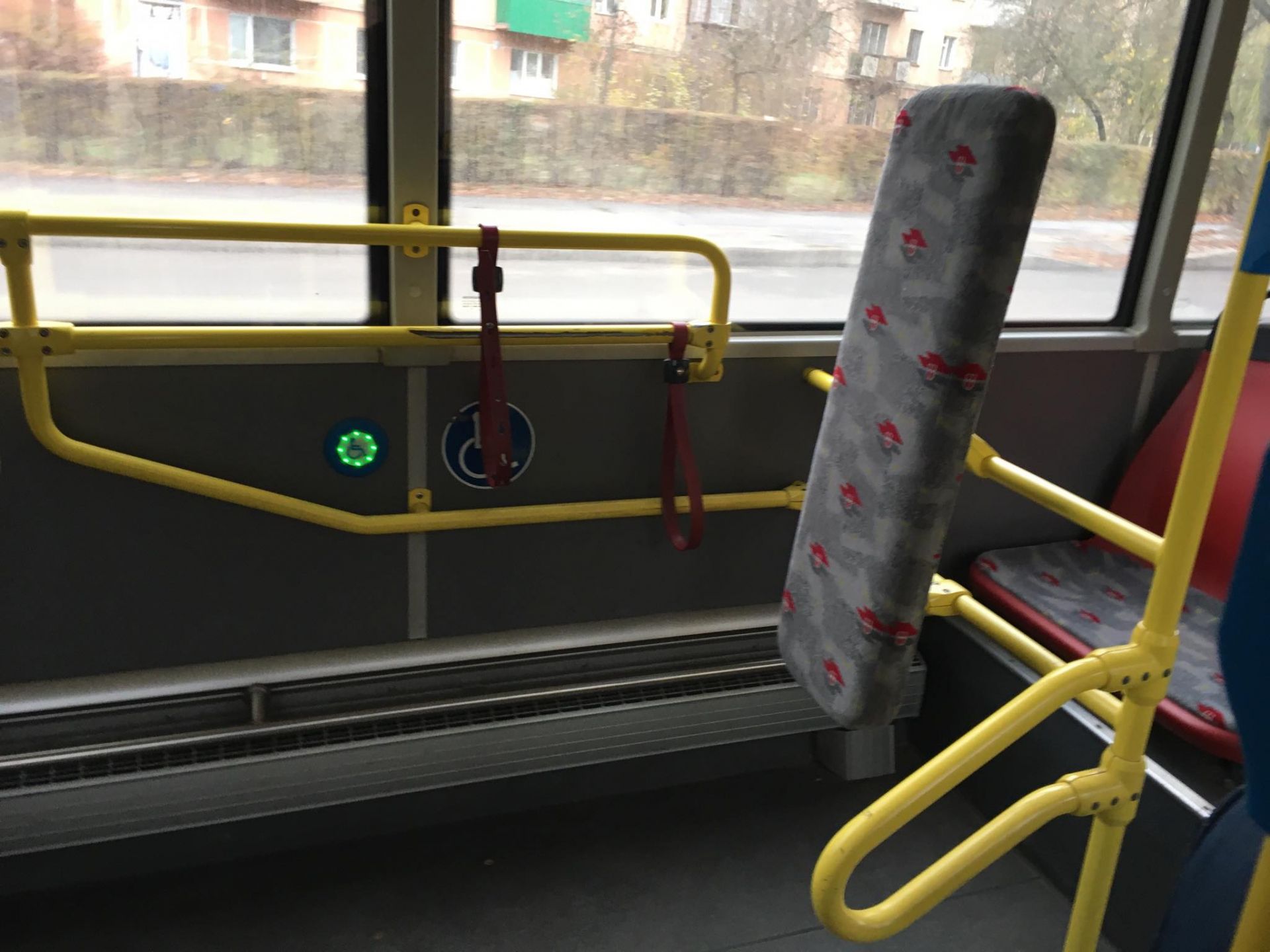 У автобусі є багато ручок для тримання, зручно заходити, бо низька підлога. А по салону є кілька кнопок для людей з інвалідністю.