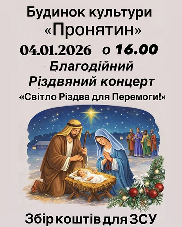 У Будинку культури «Пронятин» у неділю, 4 січня 2026 року, відбудеться благодійний різдвяний концерт «Світло Різдва для Перемоги». Початок заходу — о 16:00.