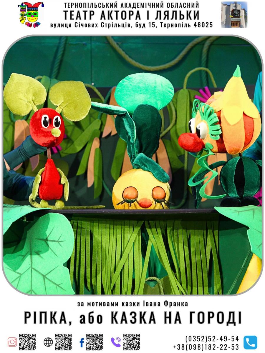 Ви бачили коли-небудь як розмовляє гарбуз, танцюють огірки, а морквини співають? Так, це можливо. Увесь цей овочевий урожай оживе на сцені нашого театру. Знайома усім з дитинства казка «Ріпка» відкриється для Вас по-новому.