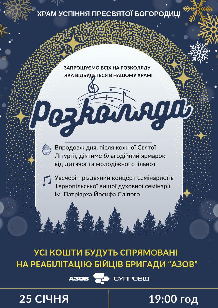 25 січня запрошують всіх на спільну Розколяду у храмі Успіння Пресвятої Богородиці. Після Літургій — благодійний ярмарок, о 19:00 — різдвяний концерт семінаристів. Усі кошти — на реабілітацію бійців бригади «Азов».