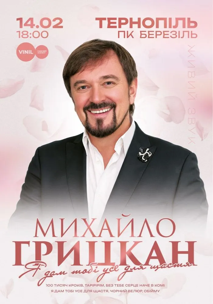 Хіти Михайла Грицкана вже встигли завоювати популярність у TikTok. Такі як «Тарірірім», «Без тебе серце наче в комі», «100 тисяч кроків», «Чорний велюр», «Я дам тобі усе для щастя» та «Обійму» створять неповторну атмосферу свята, чуттєвості та романтики.