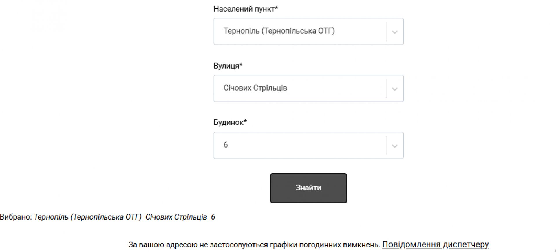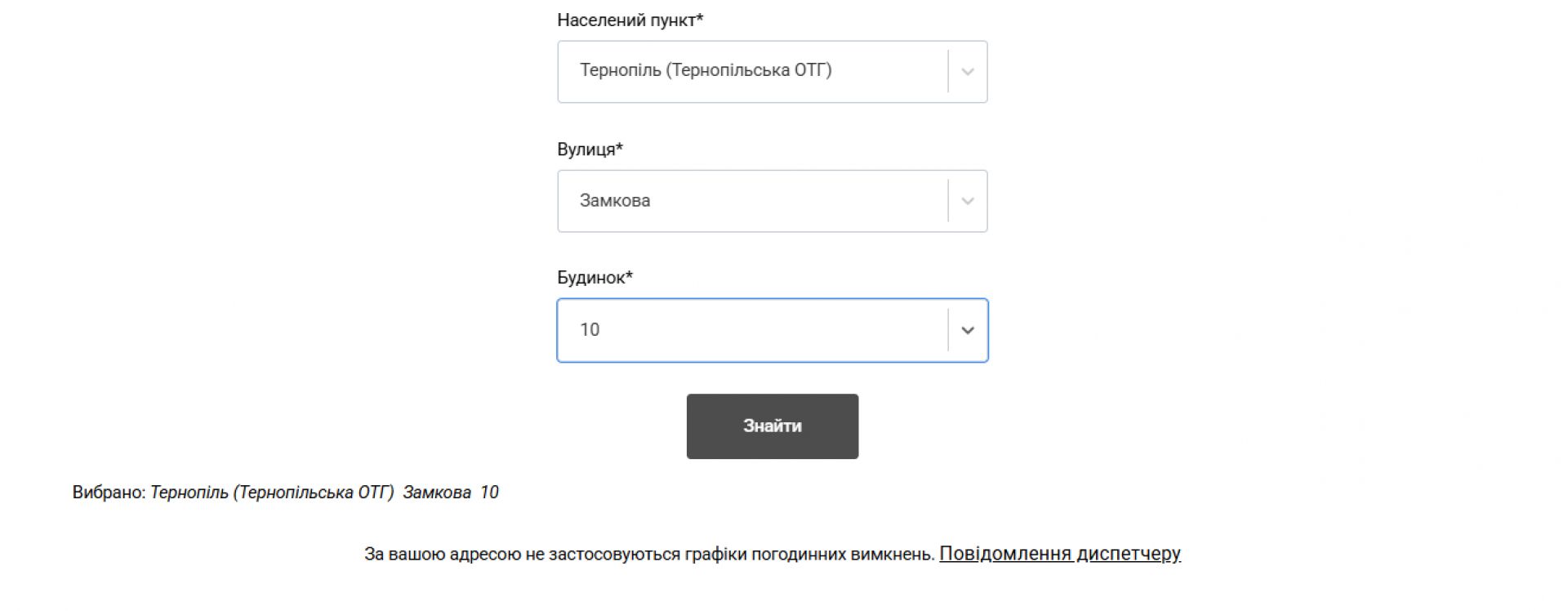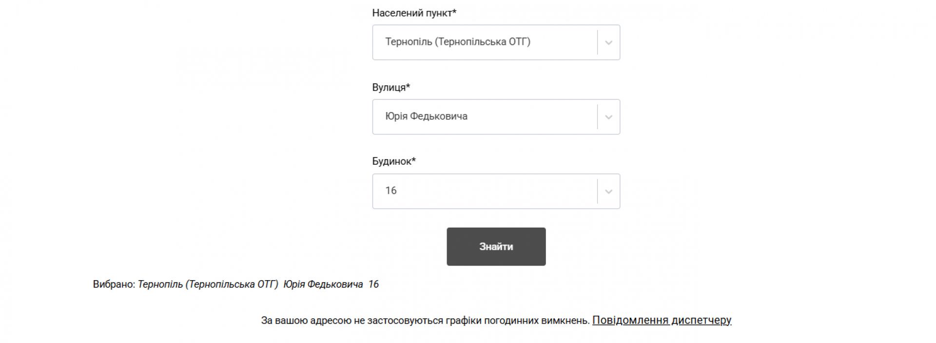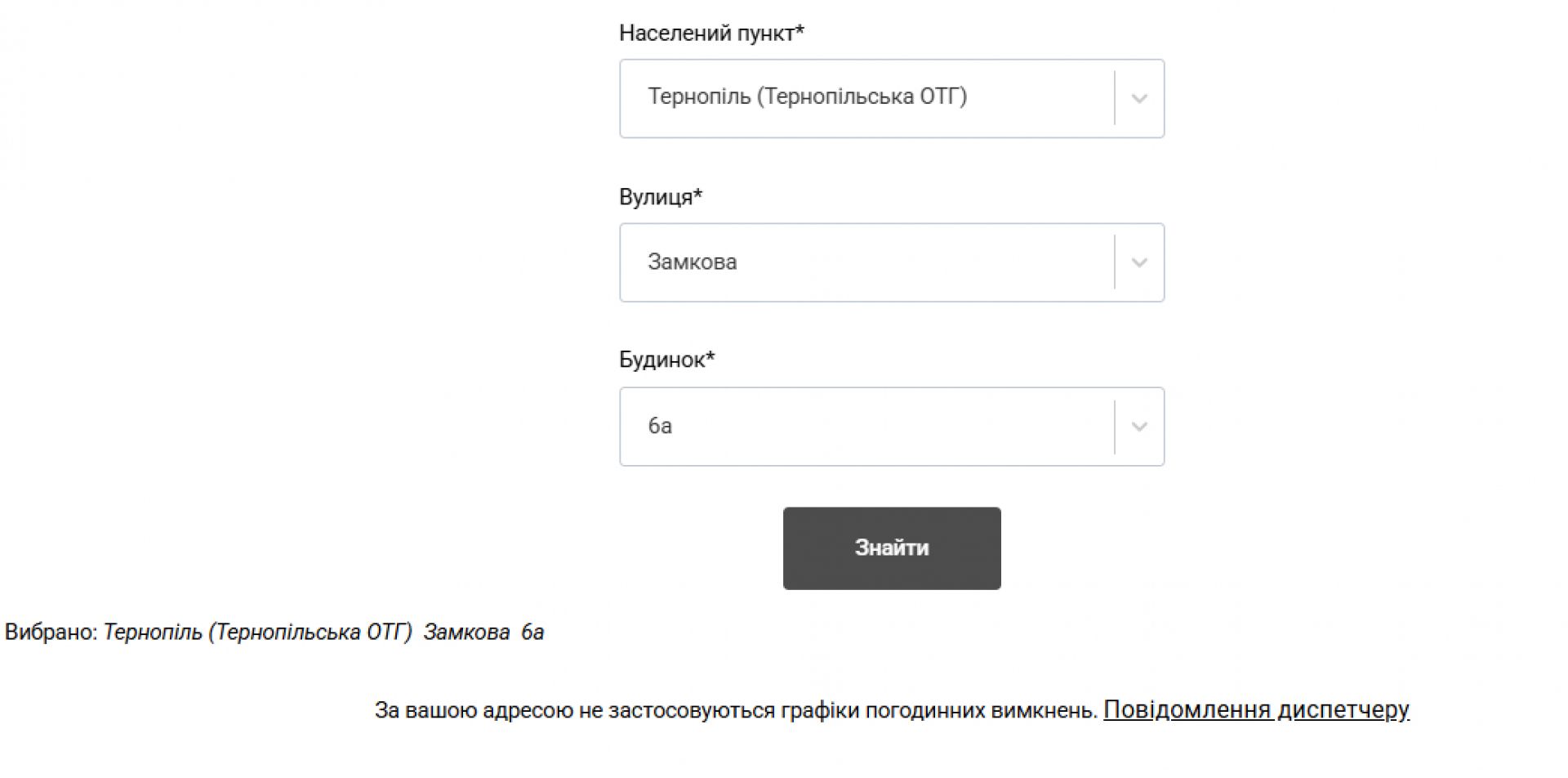 Водночас у міській лікарні швидкої допомоги, міській дитячій поліклініці, обласній психоневрологічній лікарні та обласному клінічному перинатальному центрі «Мати і дитина» електропостачання не вимикають. Судячи з сайту АТ «Тернопільобленерго»: «За вашою адресою не застосовуються графіки погодинних відключень». На підтвердження цього нижче публікуємо скріншоти.