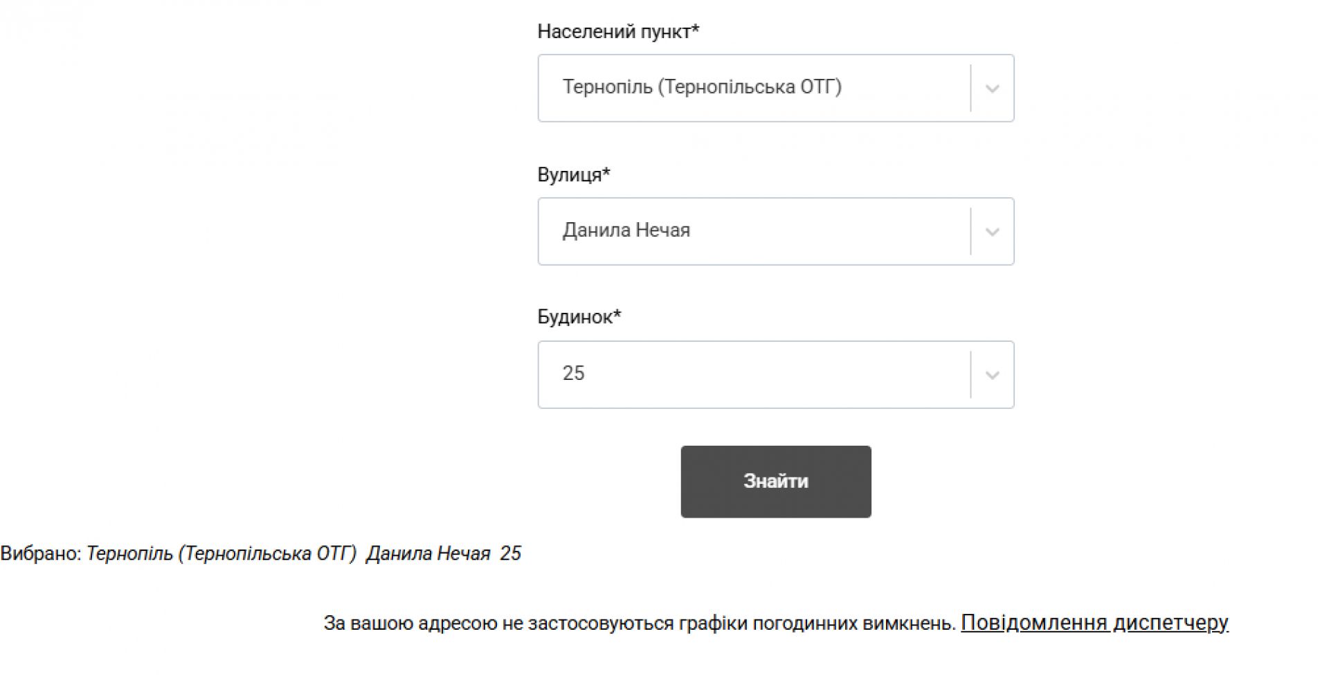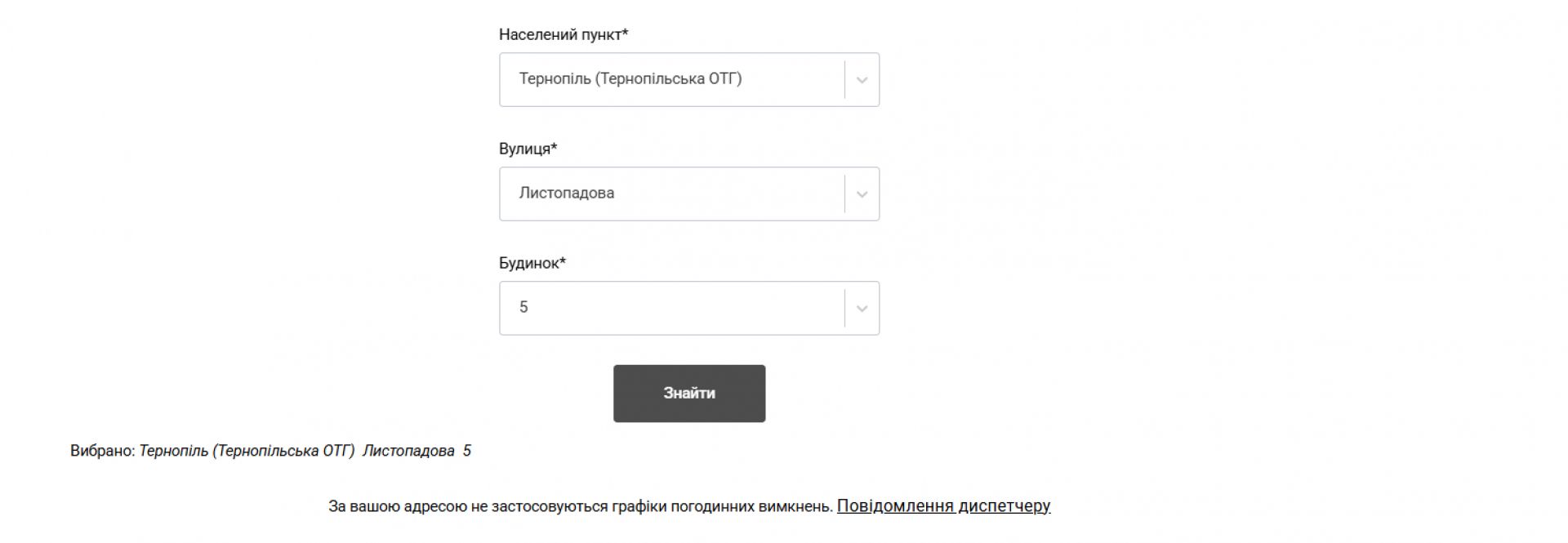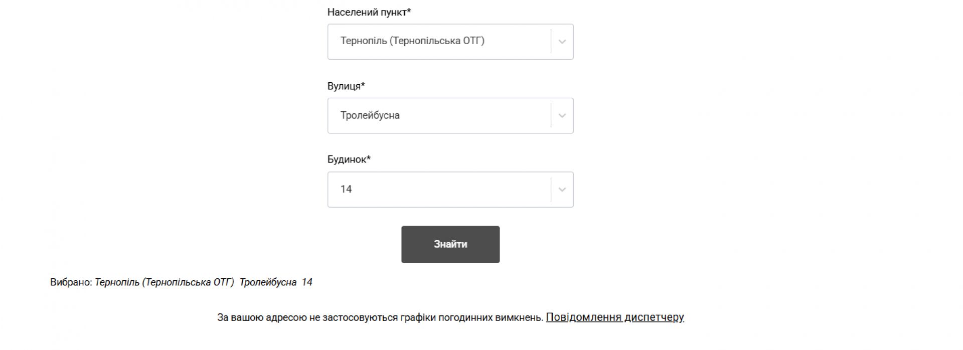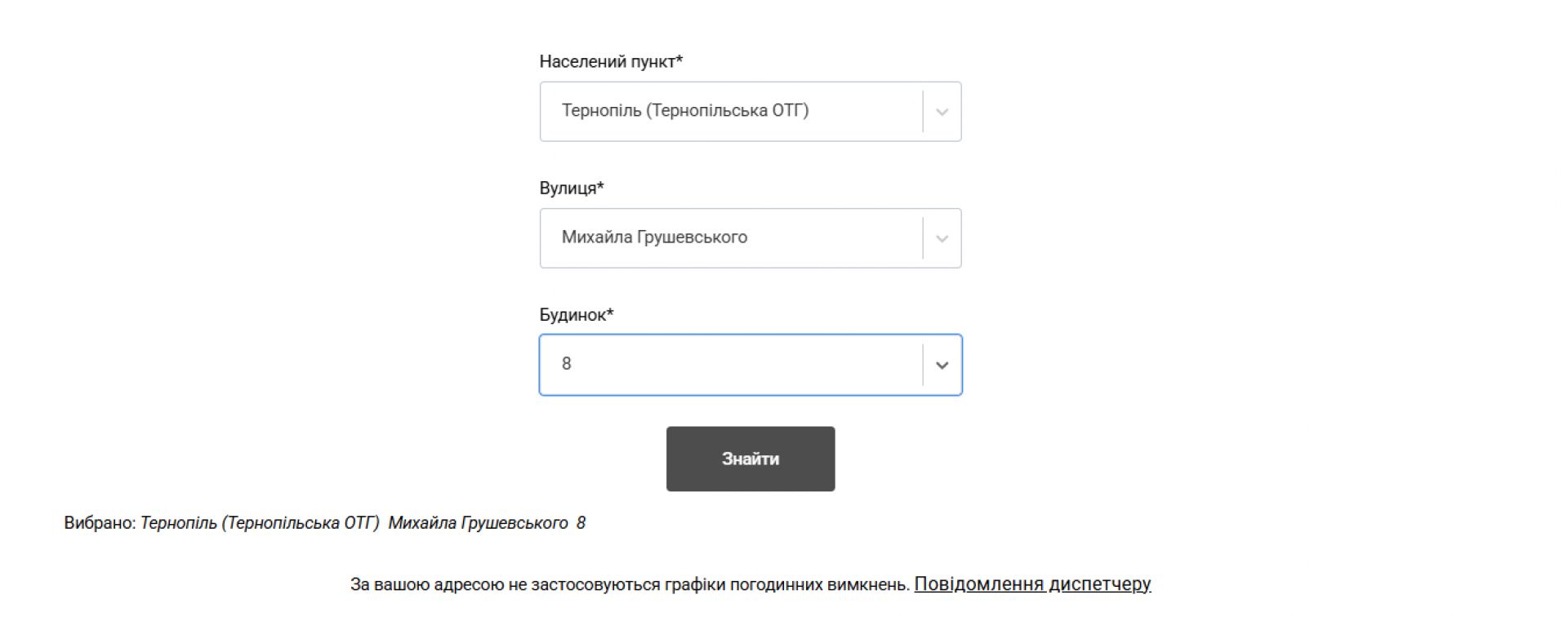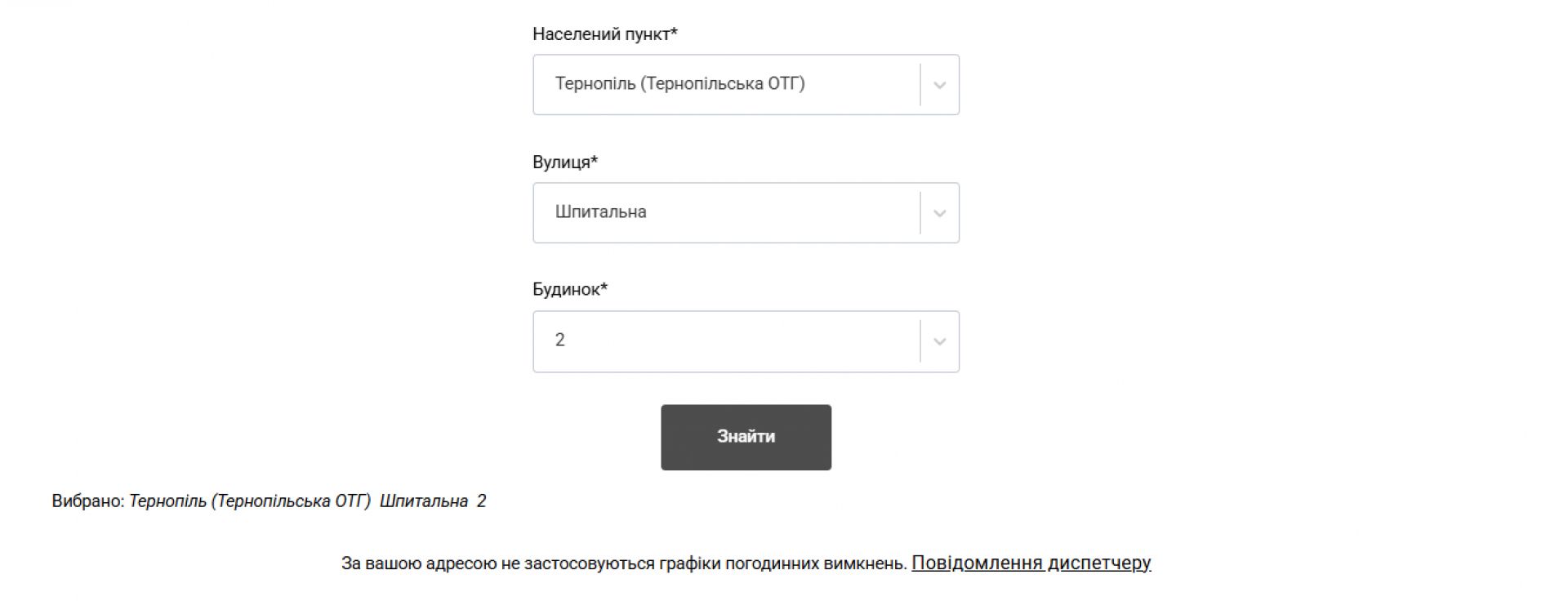 Водночас у міській лікарні швидкої допомоги, міській дитячій поліклініці, обласній психоневрологічній лікарні та обласному клінічному перинатальному центрі «Мати і дитина» електропостачання не вимикають. Судячи з сайту АТ «Тернопільобленерго»: «За вашою адресою не застосовуються графіки погодинних відключень». На підтвердження цього нижче публікуємо скріншоти.