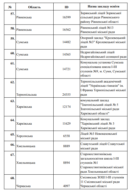 Зазначимо, що за номером 62 у переліку зазначений Тернопільський академічний ліцей "Українська гімназія" ім Франка.