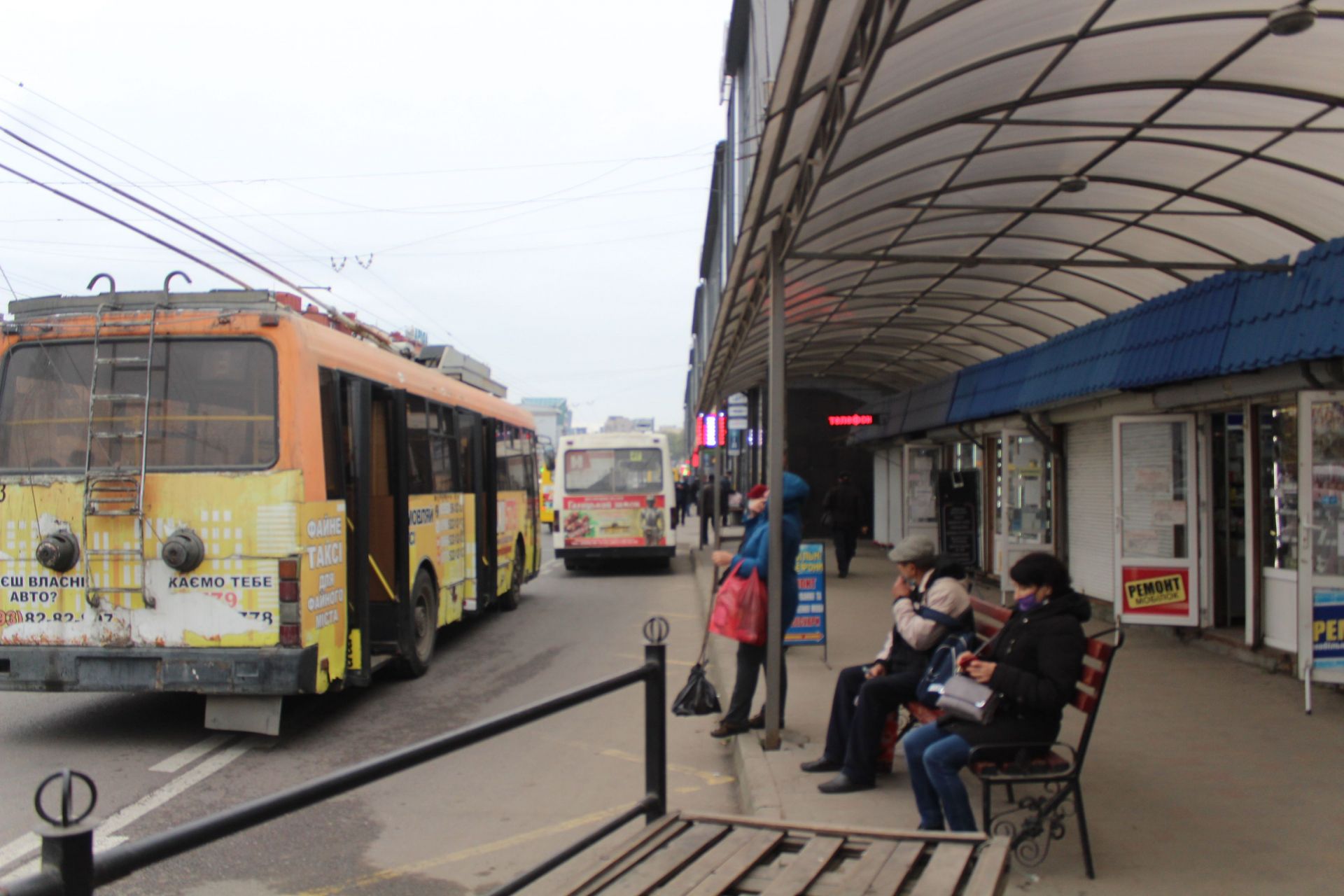 На зупинках громадського транспорту не всі люди в масках. Багато людей одягає їх перед входом до автобусу чи тролейбусу.