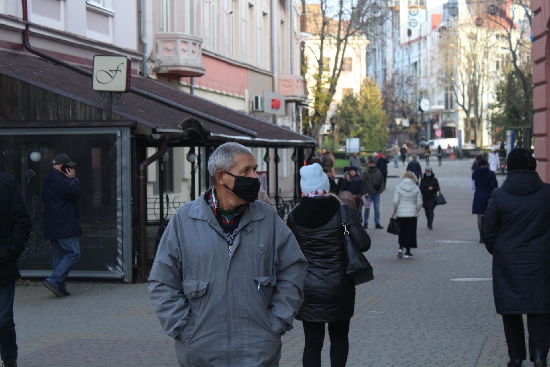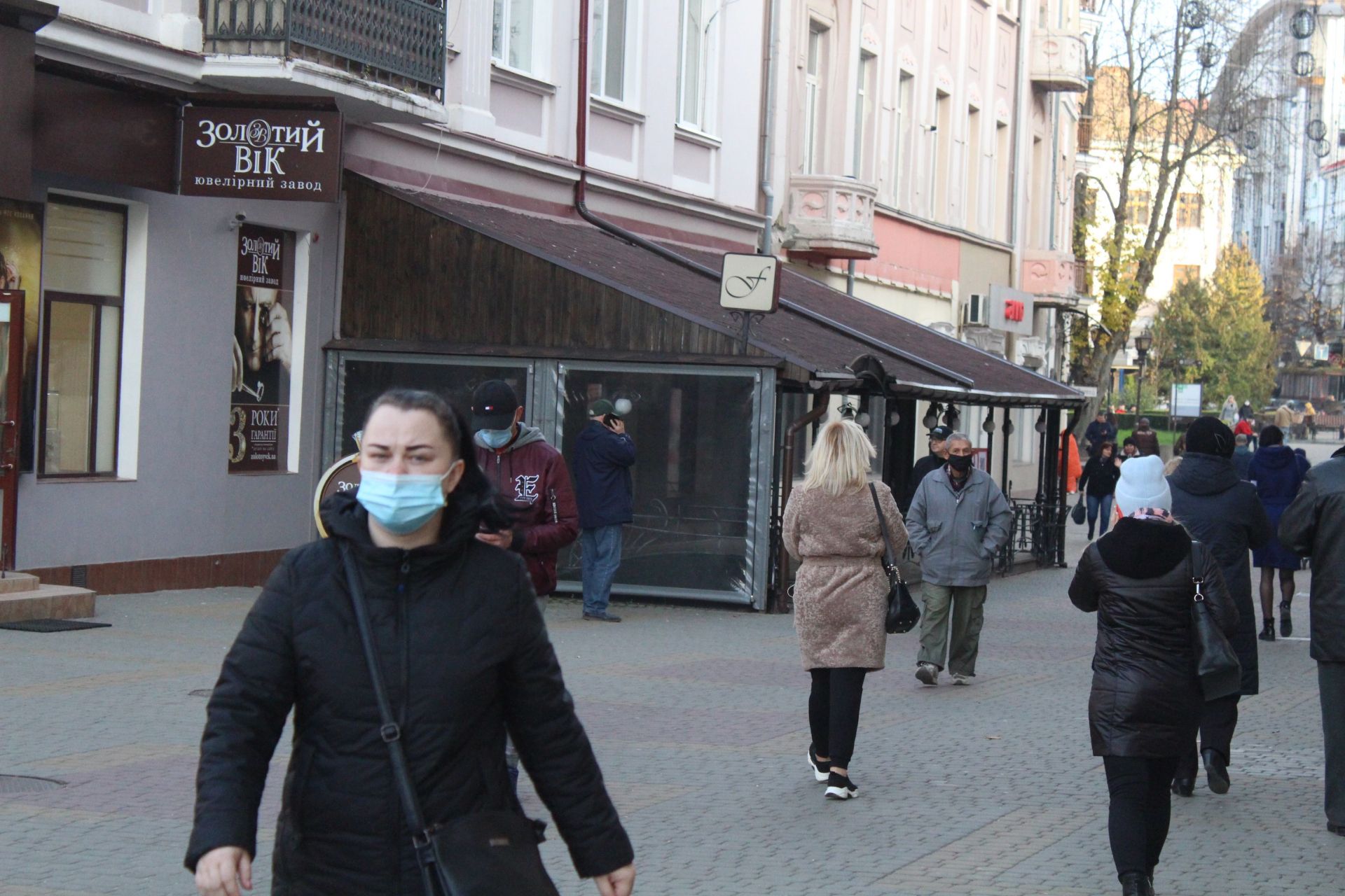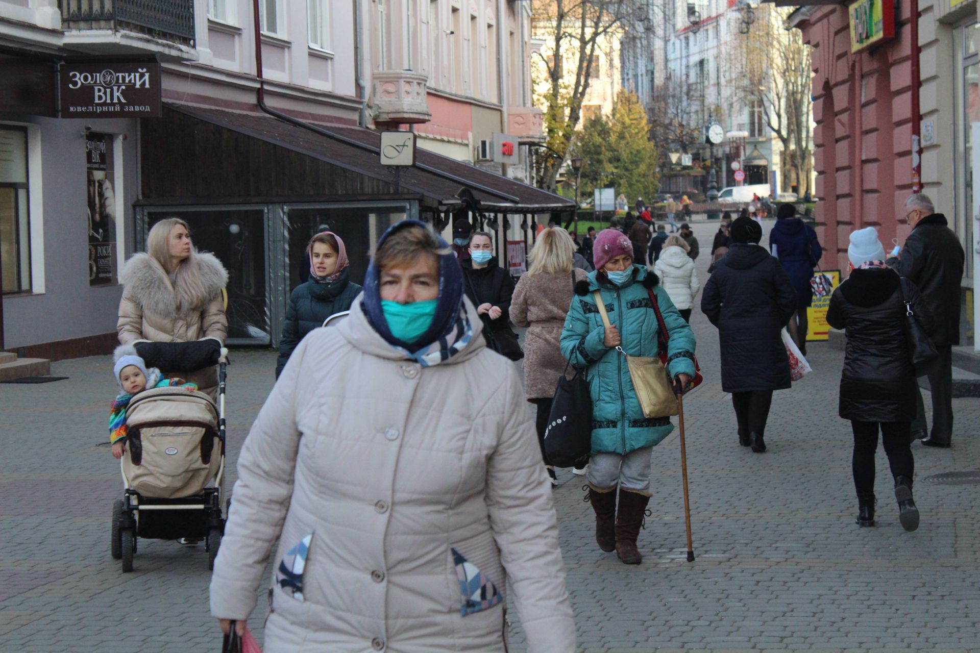 У Центрі міста багато людей гуляє в масках. Більшість одягає їх правильно.
