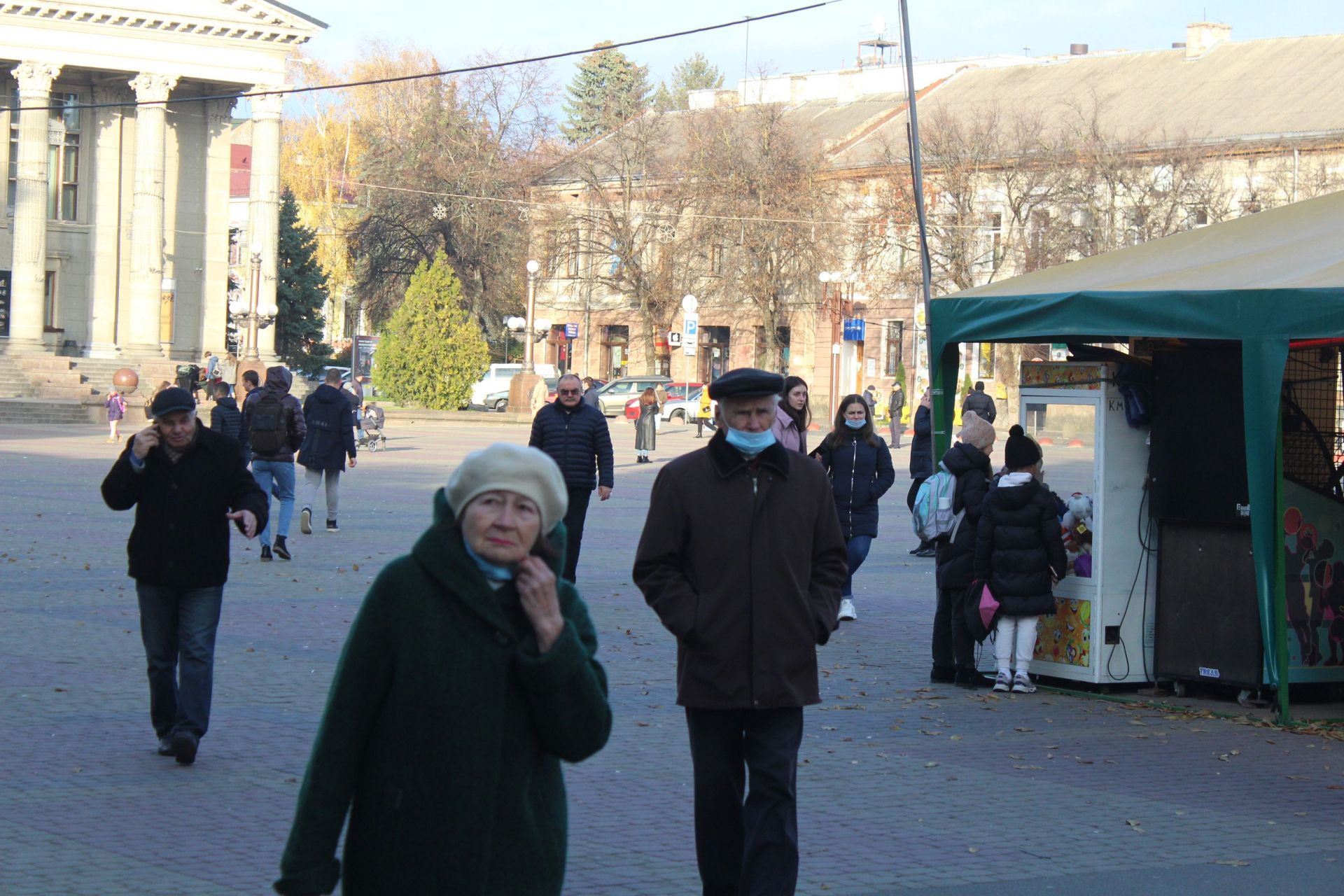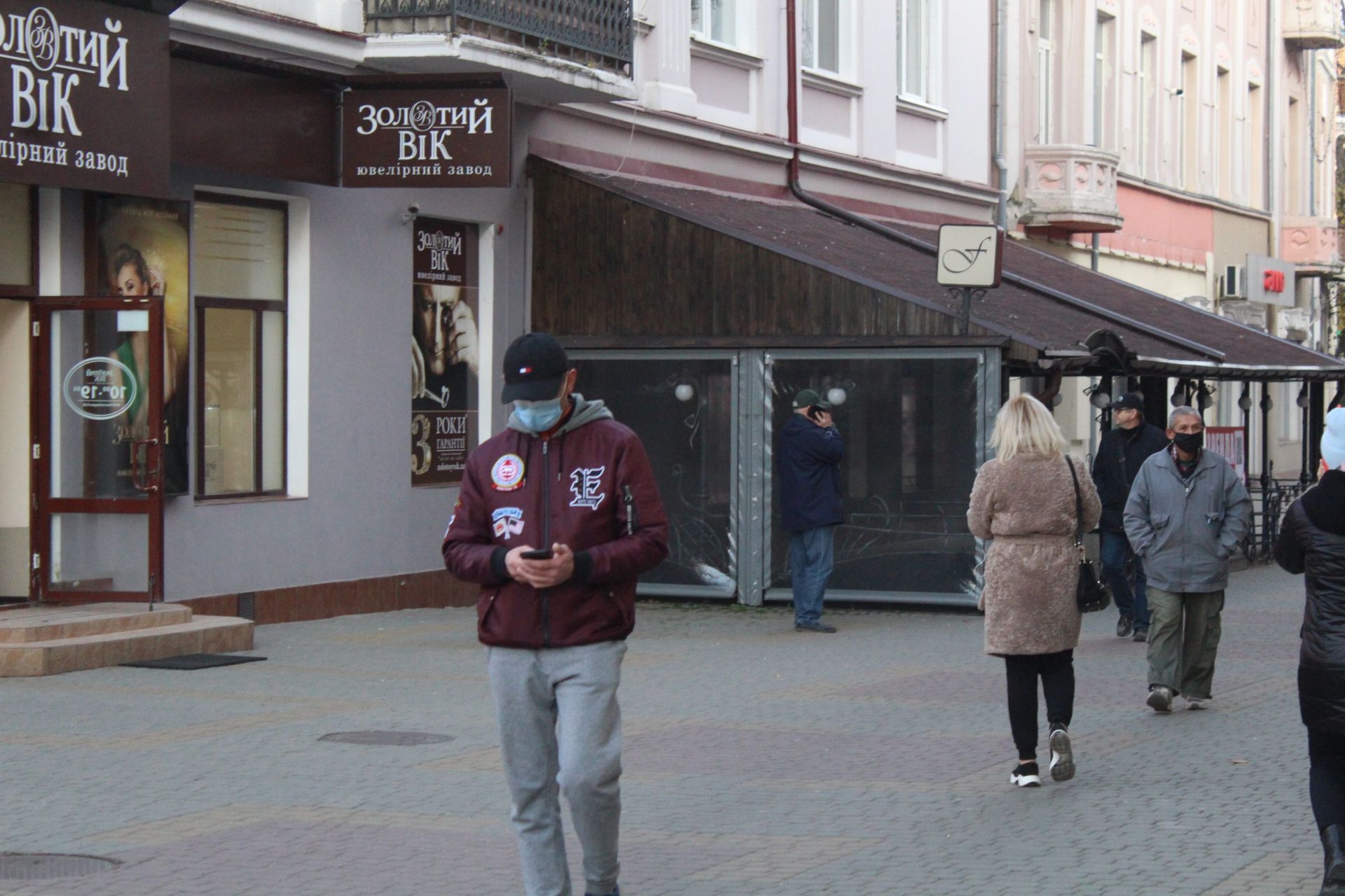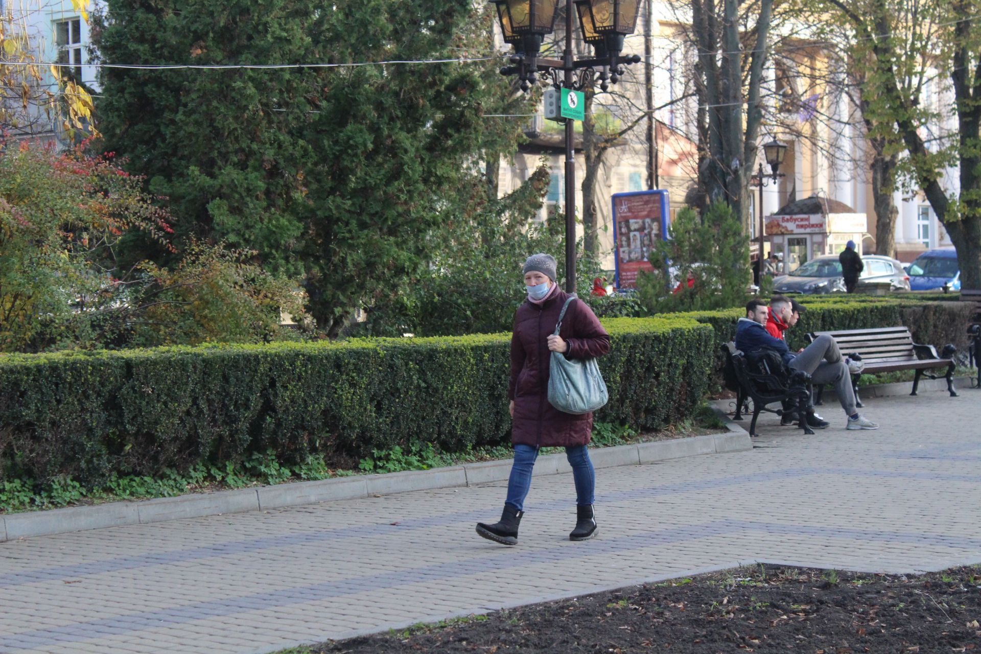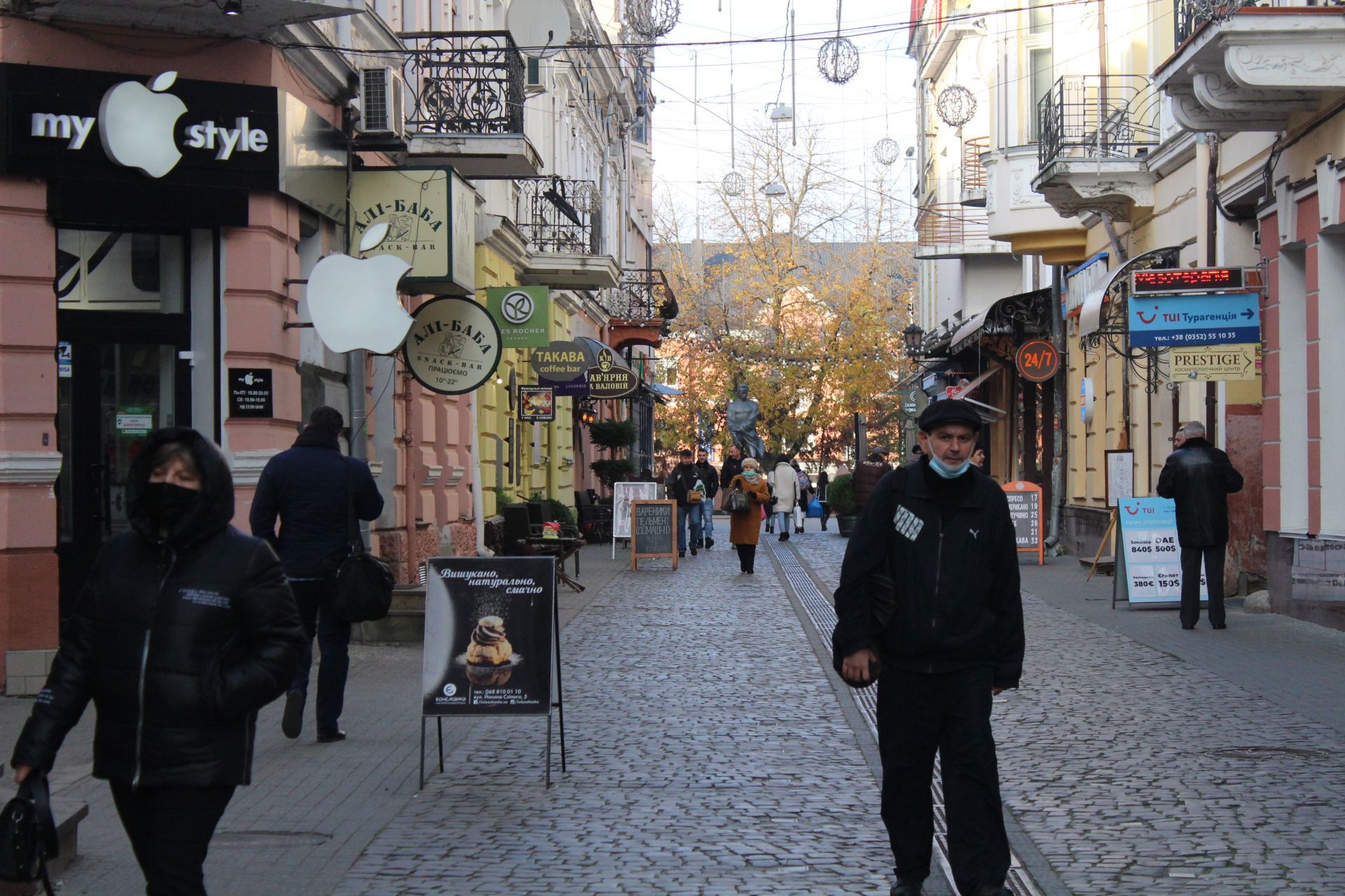 У Центрі міста багато людей гуляє в масках. Більшість одягає їх правильно.
