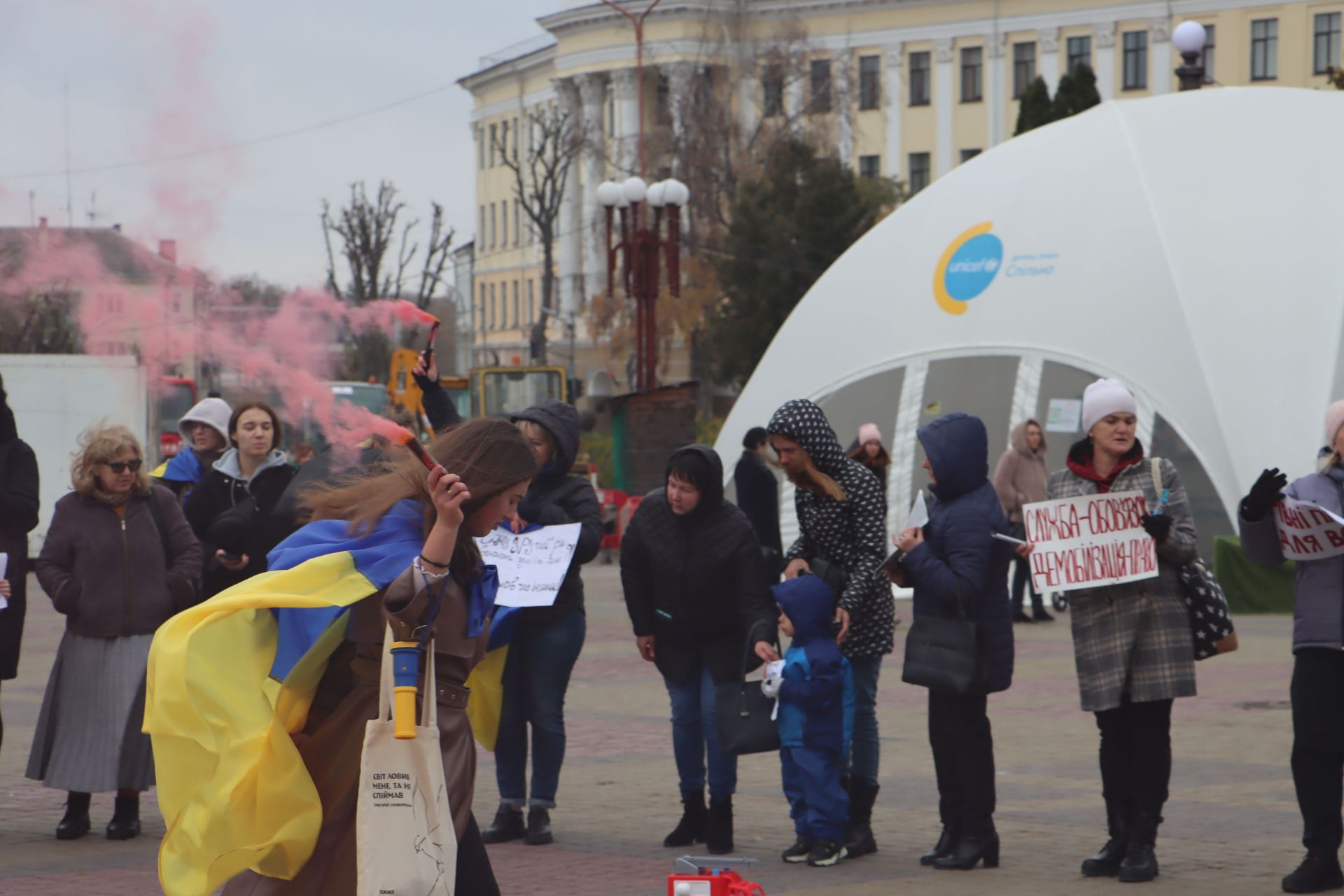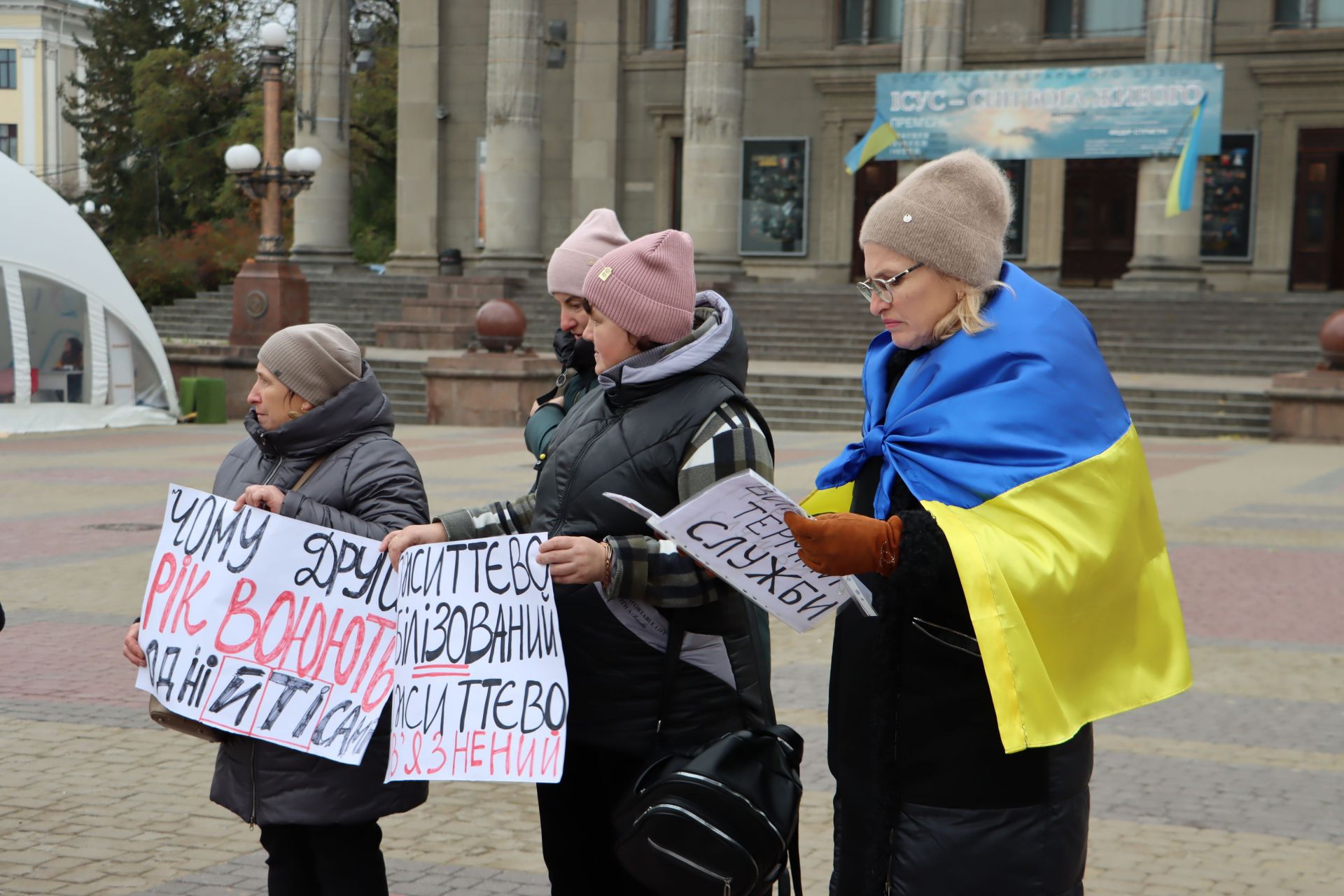 Координаторка акції та дружина військовослужбовця Вікторія Заєць розповідає, що такі мітинги 12 листопада відбуваються по всій Україні. Вона додає – жінки вимагають внормувати терміни служби для хлопців. Сьогодні на акцію, каже Вікторія, зібрались приблизно 35 учасників.