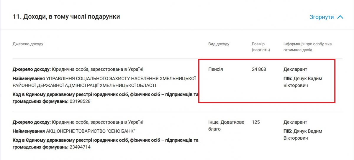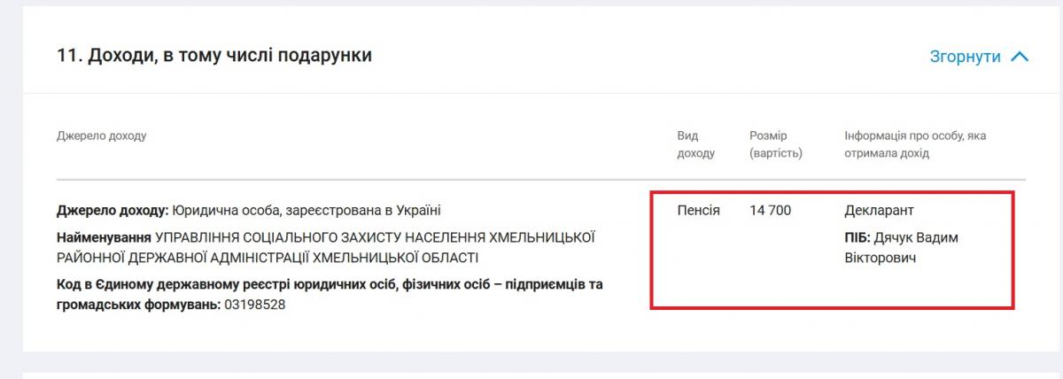 У декларації за 2022 рік, яку він подав в лютому 2023-го як поліцейський ГУ НП, у розділі про доходи йдеться, що за перший рік повномасштабної війни Вадим Дячук отримав понад 24,5 тисячі пенсії від управління соцзахисту Хмельницької РДА. Зважаючи на молодий вік, він не міг отримувати пенсію за віком. Тому можемо припустити, що це пенсійні виплати за інвалідністю. До речі, Дячук хвалився у соцмережах тим, що є майстром спорту з важкої атлетики.