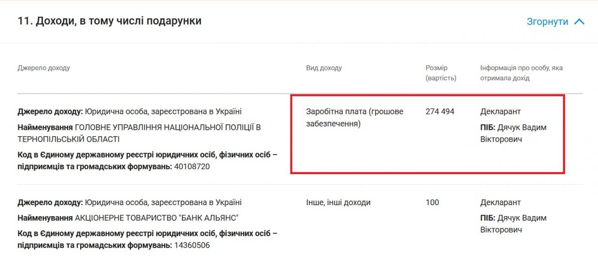 У декларації за 2024 рік інформації про пенсію немає. Лише зарплата поліцейського — 274 494 грн.