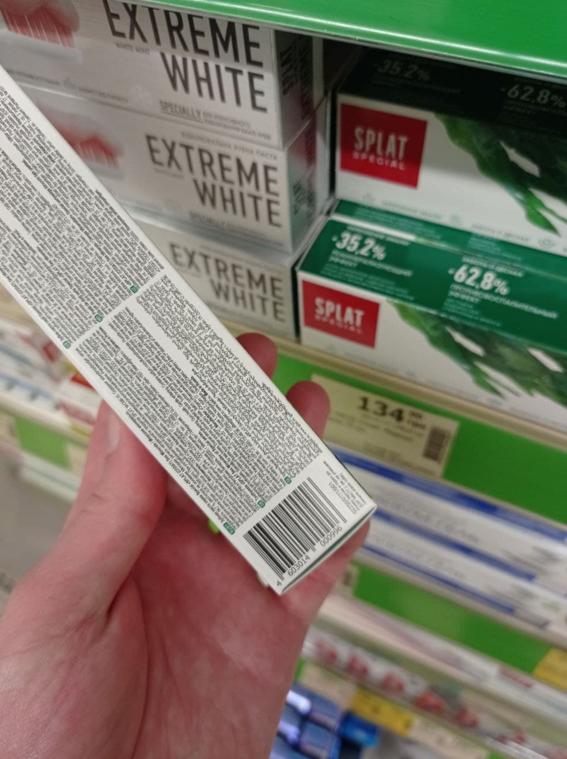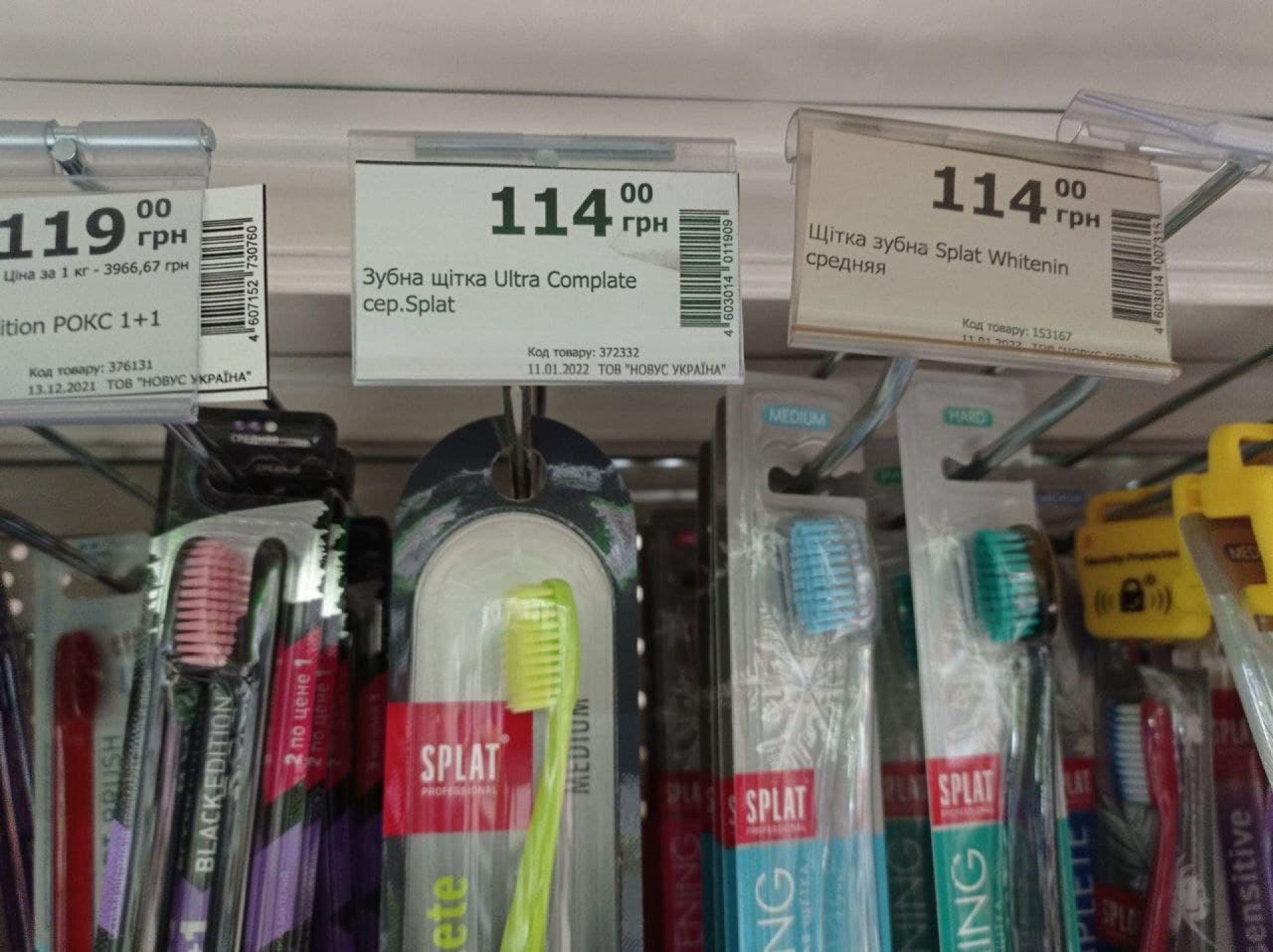 В супермаркеті NOVUS ми помітили зубну пасту Splat Special. Деякі види виготовлені в Швейцарії, а деякі – в Росії. Поруч – зубна паста R.O.C.S. – теж з РФ. Також є зубні щітки Splat з Росії. Знайшли воскові смужки для епіляції з Росії Veet. На полиці кілька видів смужок від українських та іноземних виробників з нижчими цінами. Тож знати альтернативу таким товарам не проблема – вона є на полицях.
