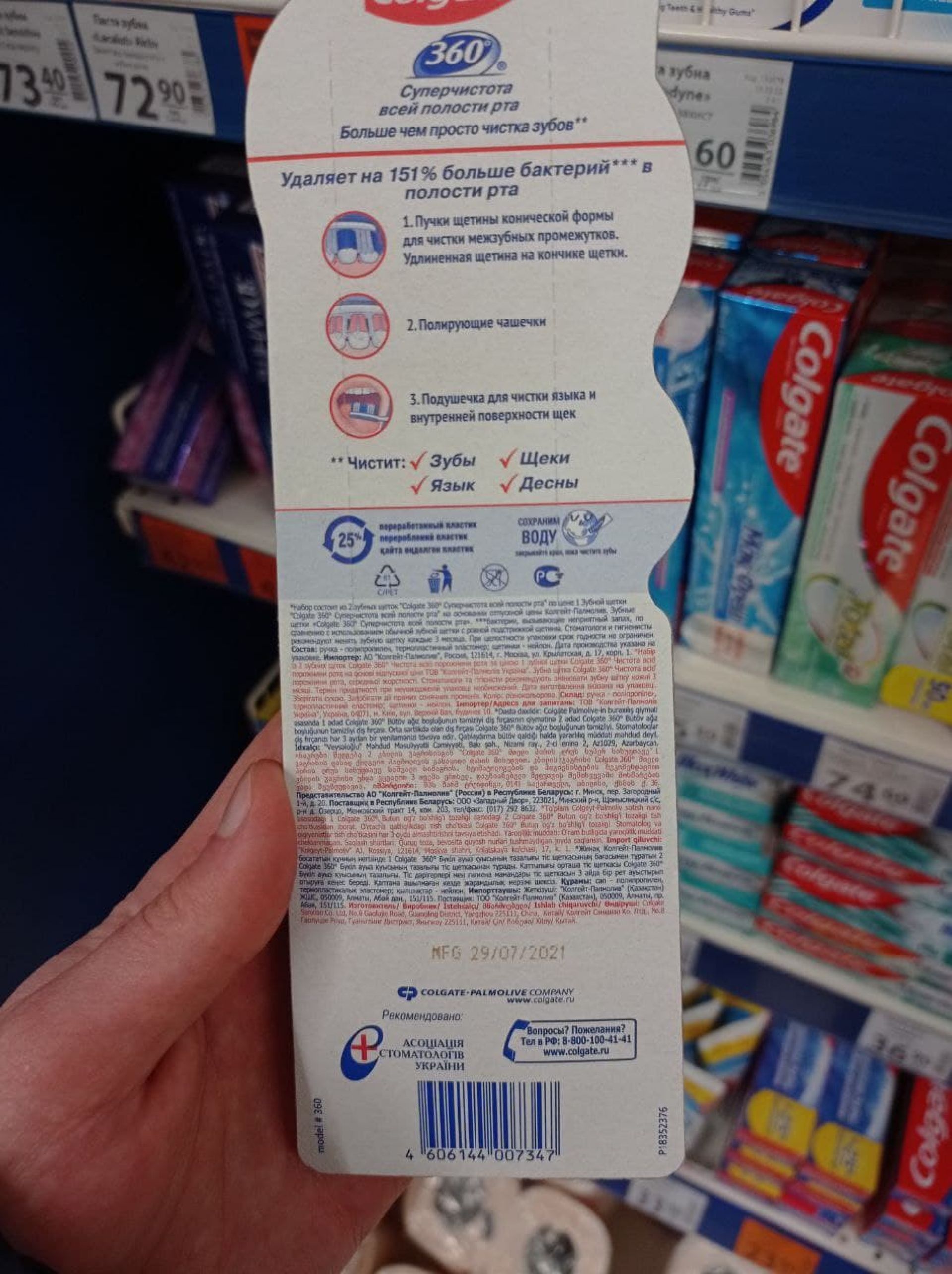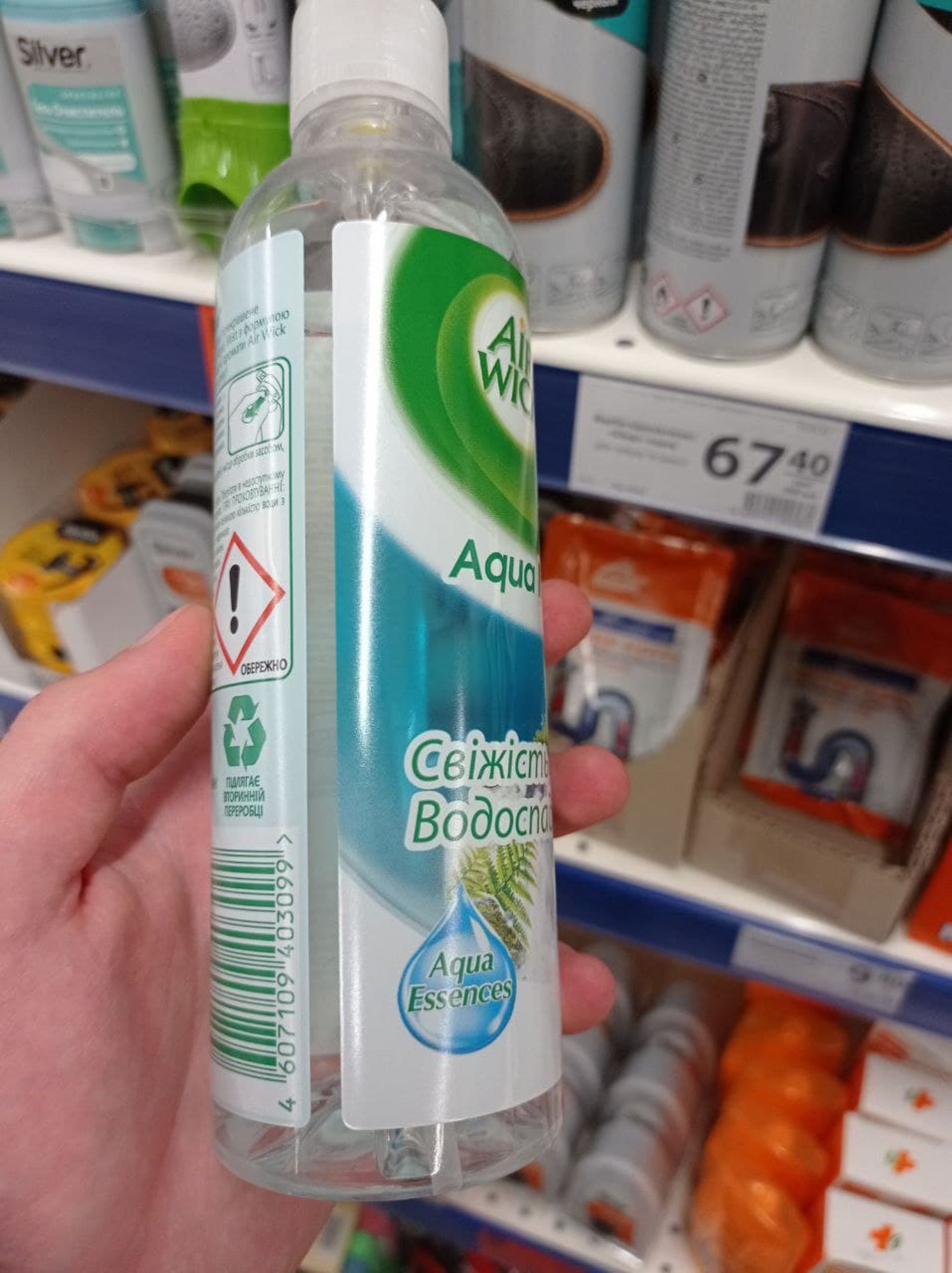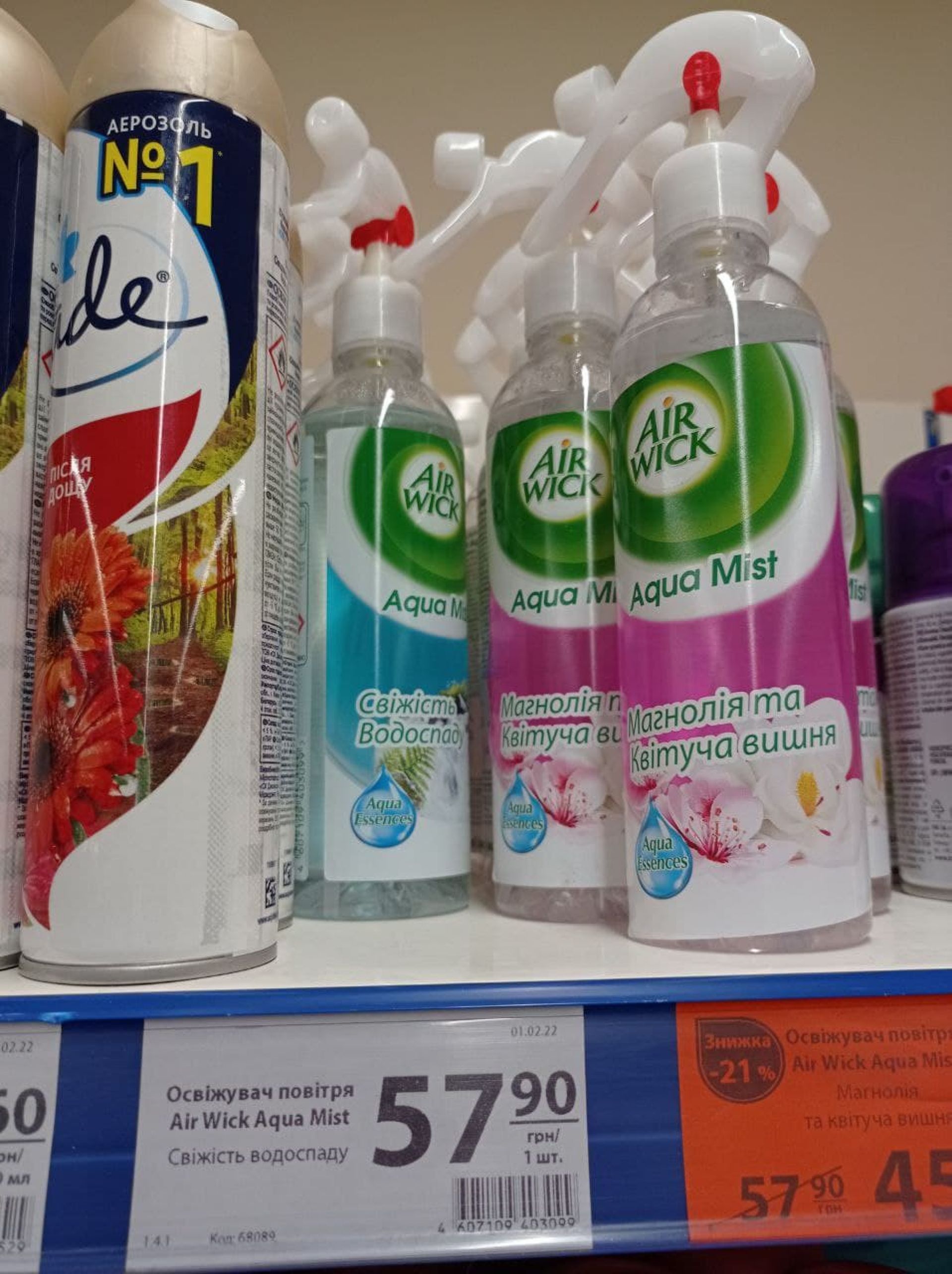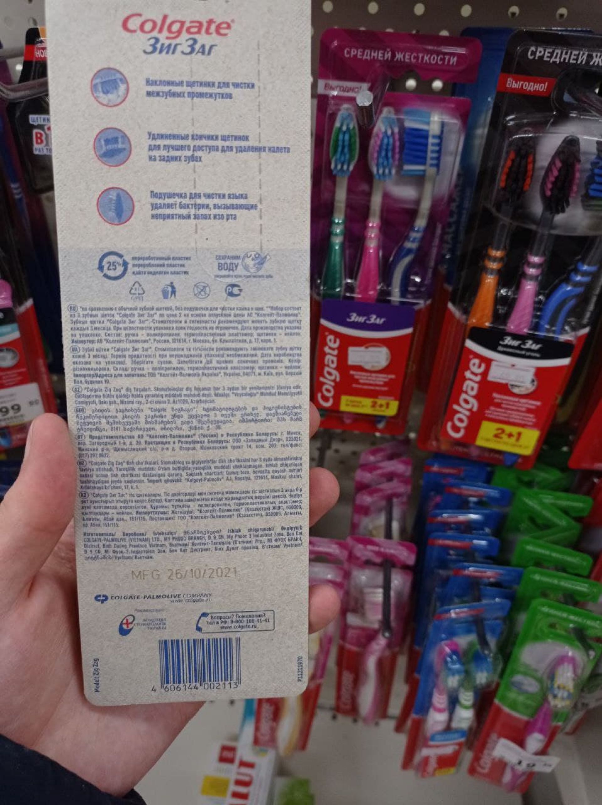У супермаркеті «АТБ» ми знайшли освіжувач повітря Air Wick. На етикетці назва українською мовою, однак штрих-код вказує на походження товару з Росії. Були зубні щітки Colgate з РФ, хоча поруч є такі ж комплекти, але виготовлені в Нідерландах. До слова, коштують останні дешевше.