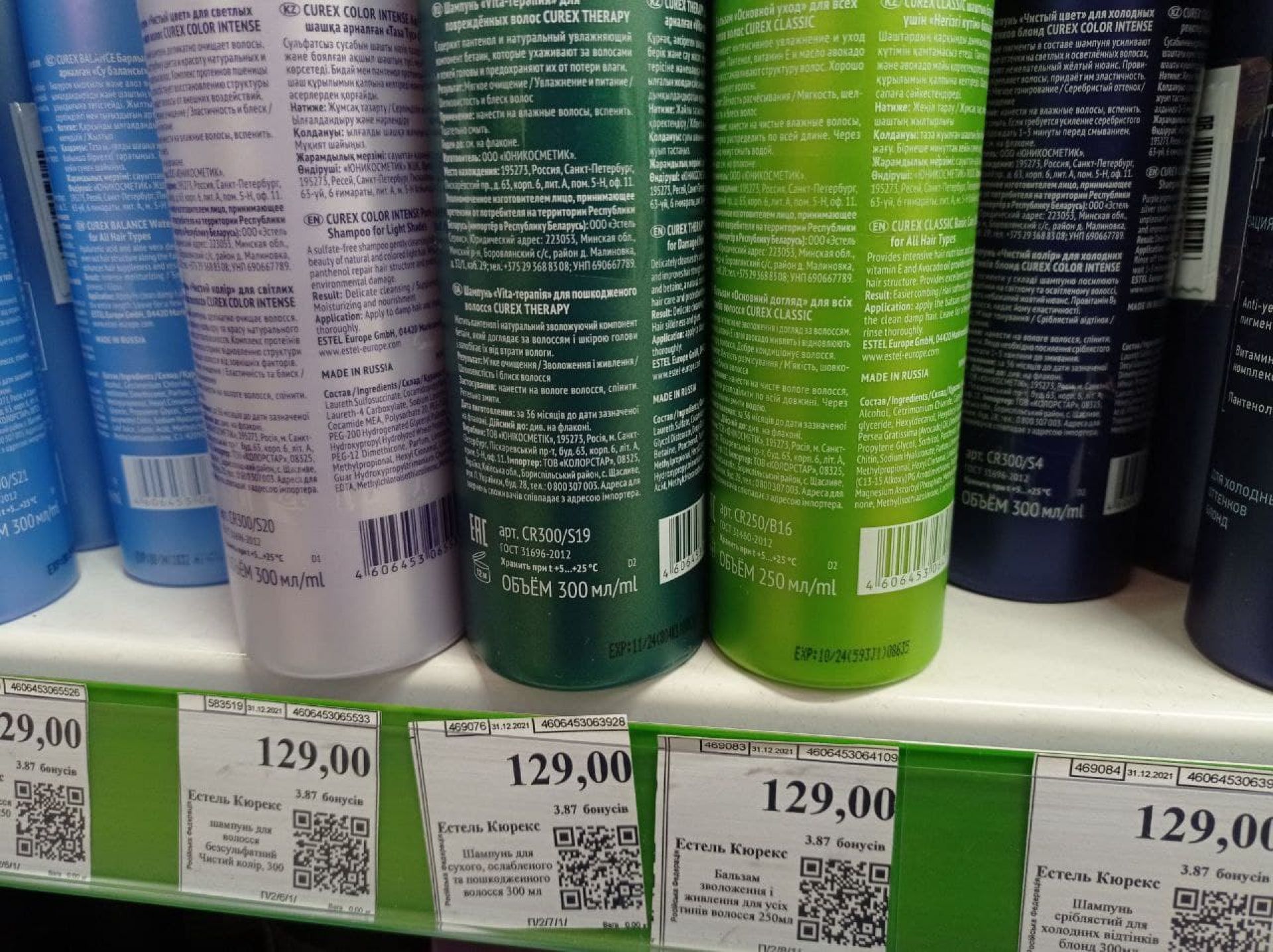 А от з товарами гігієни та побутовою хімією справи інакші. В кожному магазині ми знаходили російські товари. Засоби гігієни від відомих брендів, як ми помітили, можуть імпортувати з різних країн, включно і Росії. Так поруч може стояти зубна паста, дезодоранти чи засоби для догляду зі шкіри від однієї торгової марки. Однак один вид продуктів виготовлено, до прикладу, у Швейцарії, а інший – в Російській Федерації.