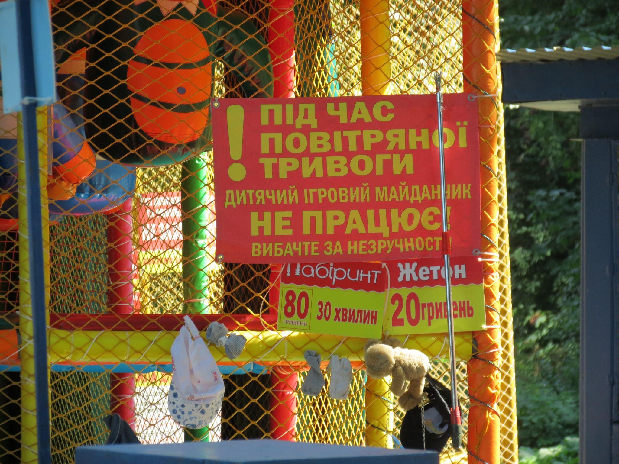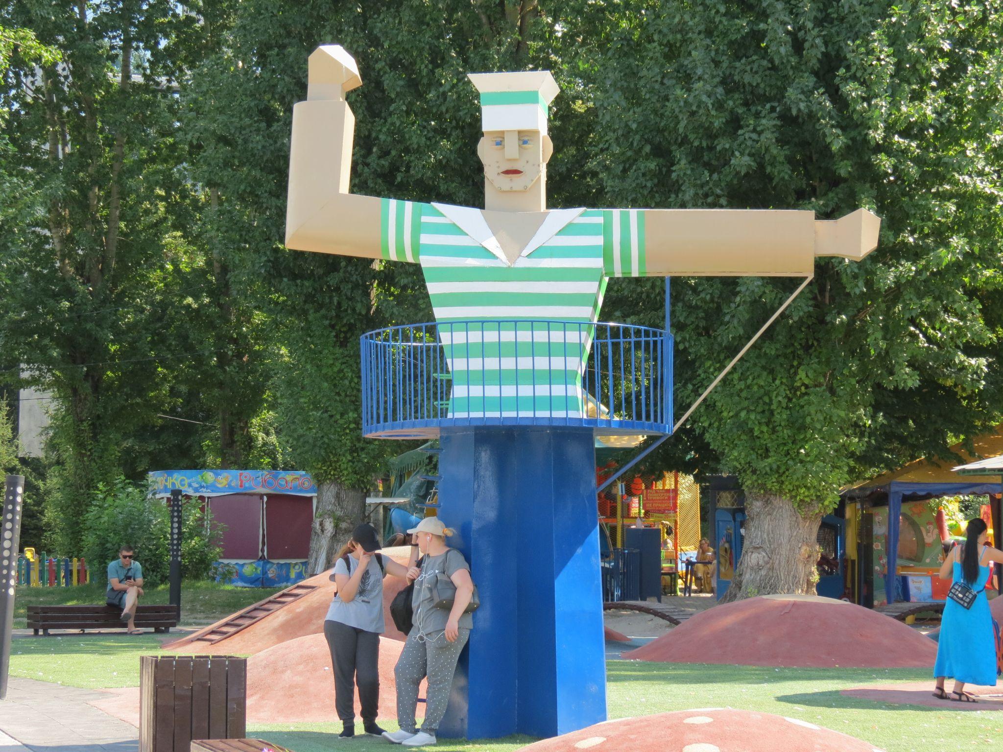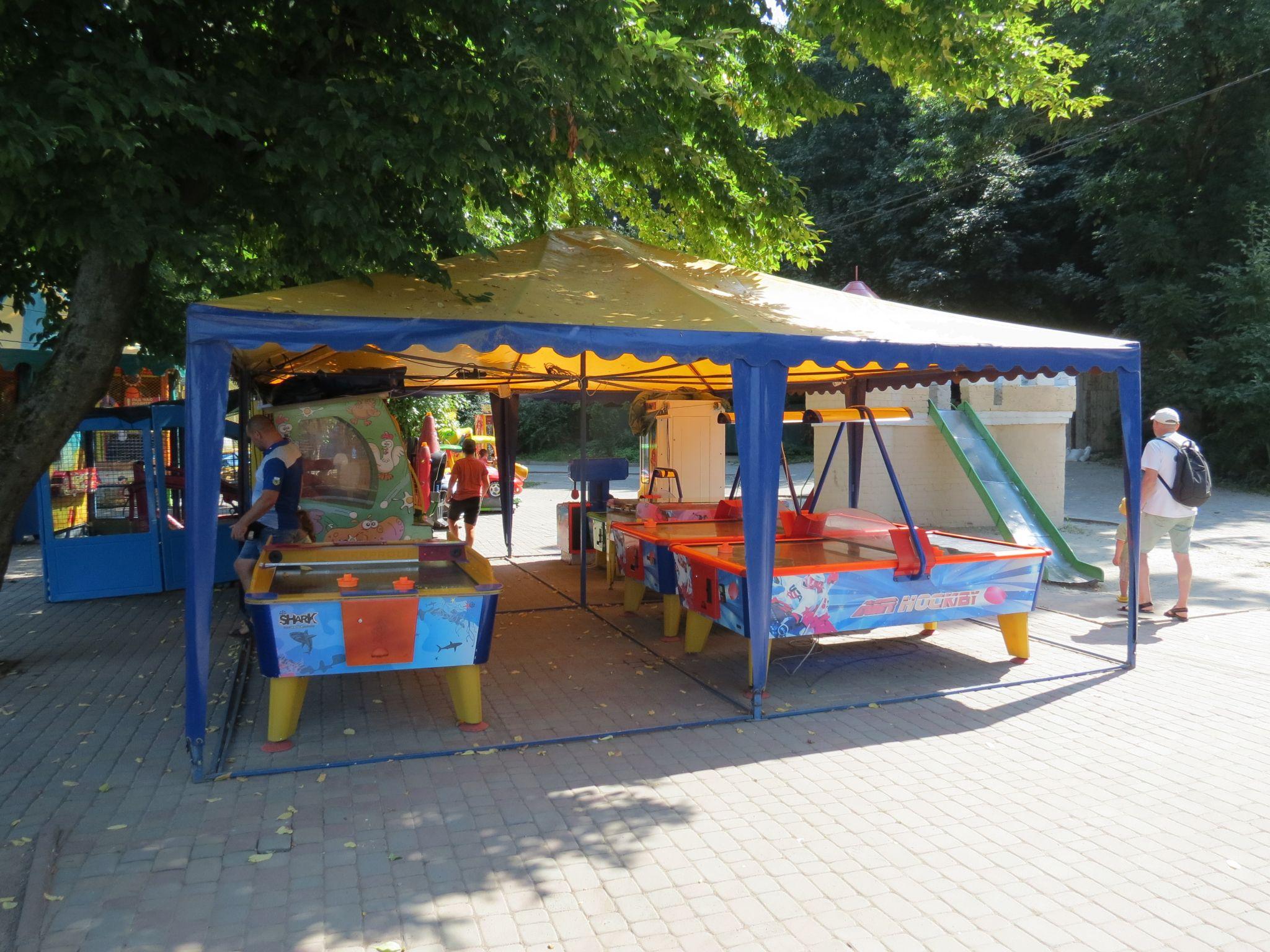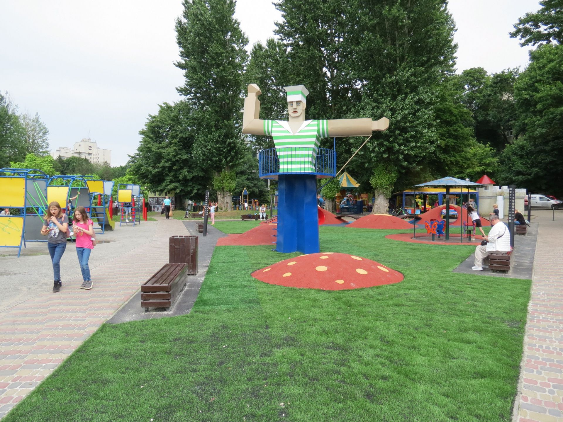 У цьому парку є кілька дитячих майданчиків. Майданчик біля «Дяді Стьопи» відремонтували. Там замінили частину покриття. Стару штучну траву замінили на нову зі спеціальним гумовим прошарком. Атракціони були у хорошому стані. На дитячій «лазанці» ми побачили нові канати. Гойдалки та каруселі були справні.