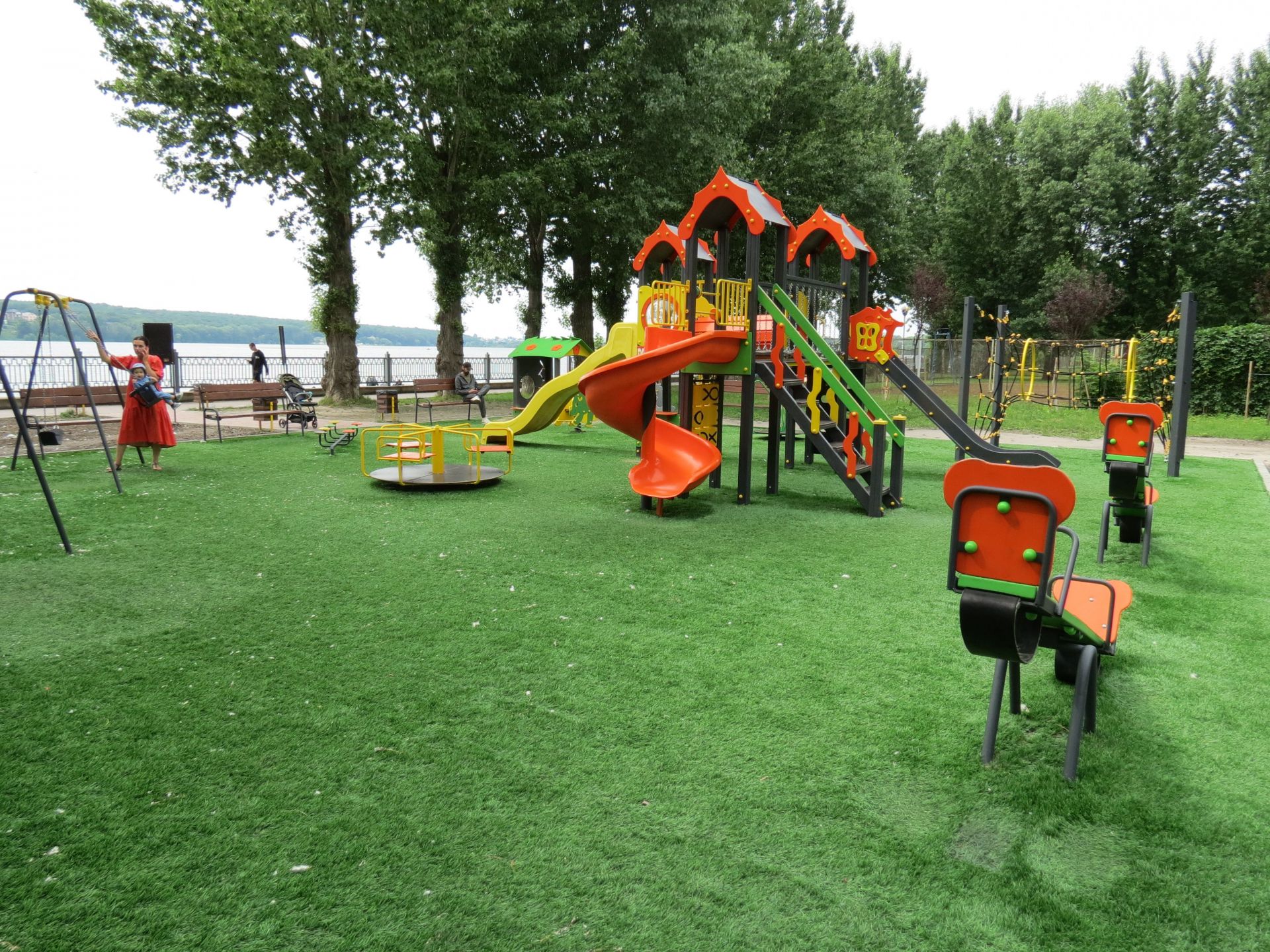 Біля причалу є дитячий майданчик з ігровим комплексом, гойдалками. Дерев’яні елементи пофарбовані. Ми не побачили зламаних конструкцій. Поверхня майданчика покрита шаром піску, але він заростає травою. Поруч є лавки. Однак майданчик знаходиться на сонці і затінку фактично немає, тож у спекотні дні там рідко граються діти з батьками.