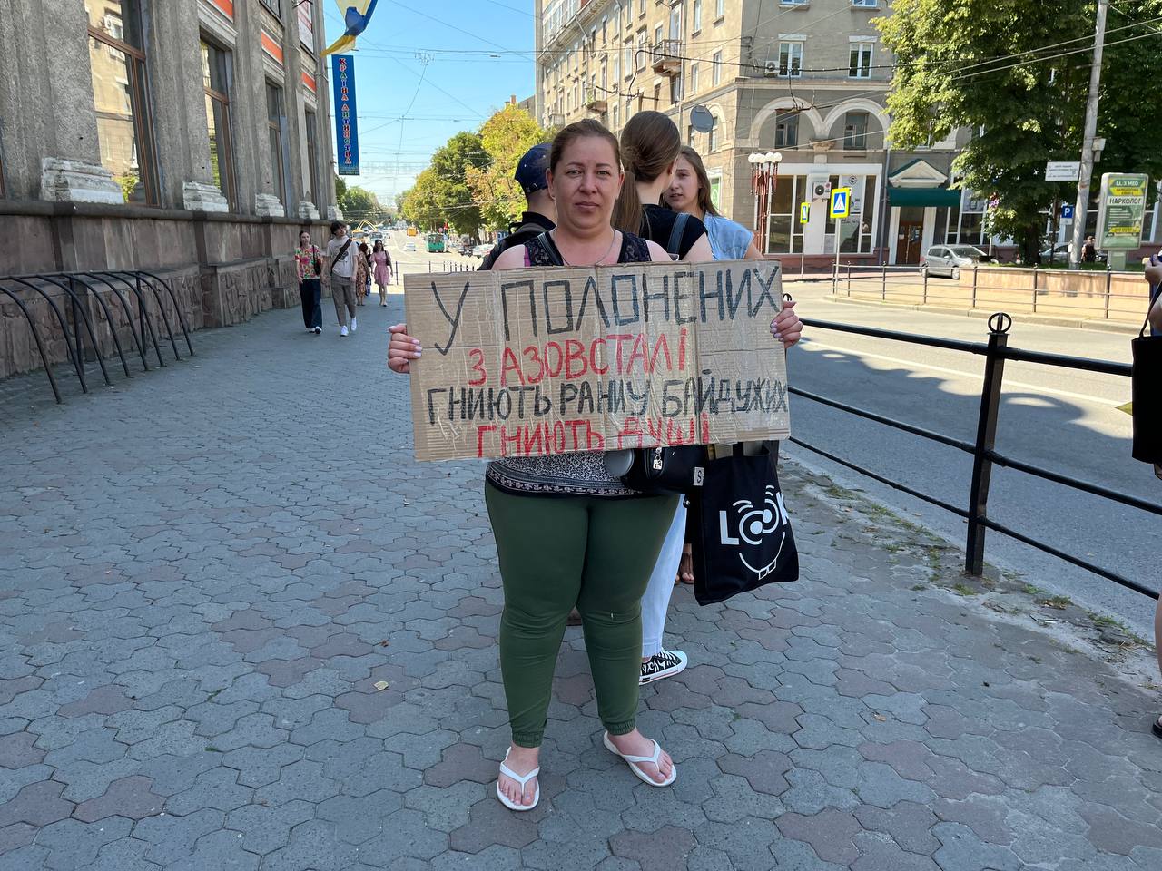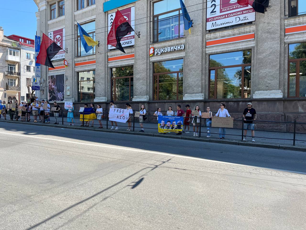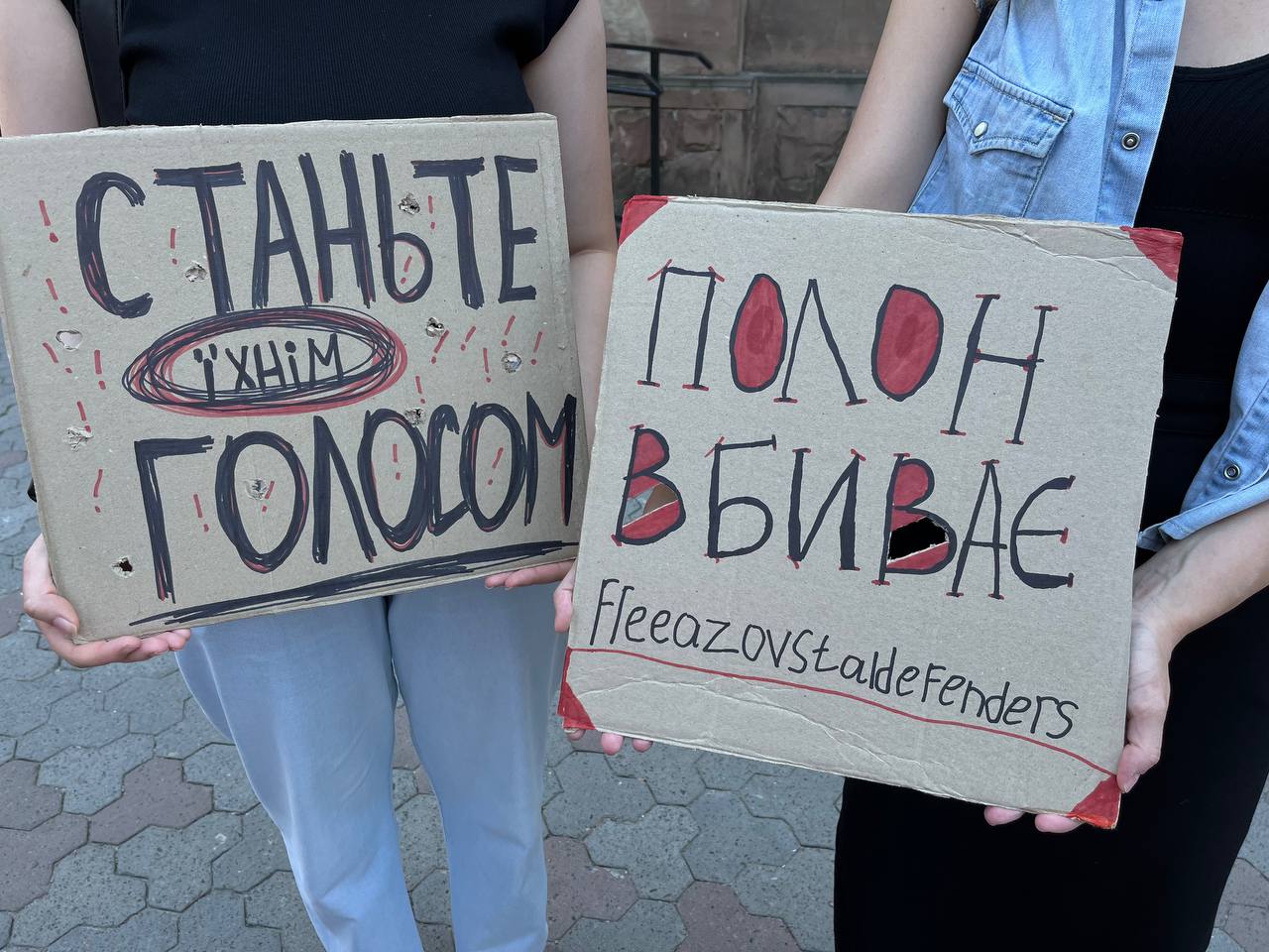 Учасники акції принесли із собою українські прапори та плакати з написом: «Полон вбиває», «Моє серце два роки в пеклі», «Коли мій брат і тато будуть вдома», «Азов колись збираються звільняти?» та інші.