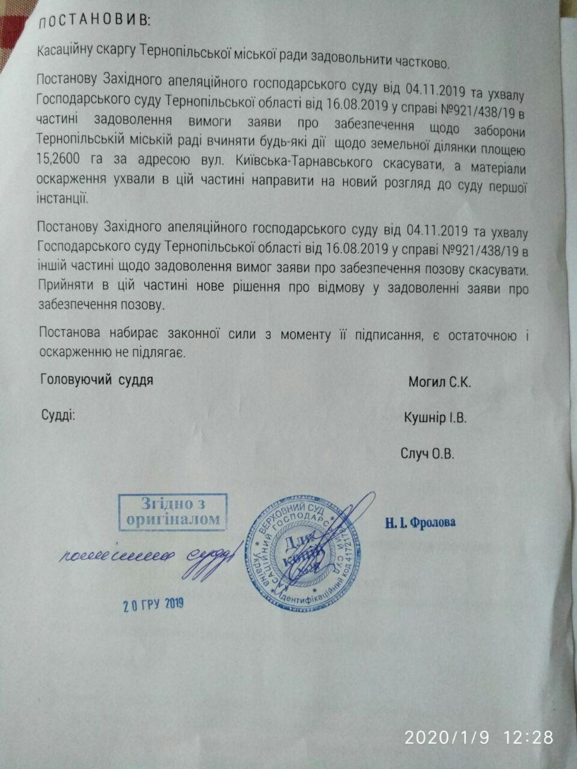- Колегія суддів погоджується з висновками місцевого та апеляційного господарських судів про те, що виправданим, адекватним та співмірним заходом забезпечення позову є заборона відповідачу (міській раді) вчиняти будь-які дії щодо земельної ділянки площею 15,2600 га за адресою вул. Київська- Тарнавського, – пояснює адвокат Павло Варода. – Однак, як правильно зазначає Тернопільська міська рада у своїй касаційній скарзі, саме лише визначення заборони на вчинення будь-яких дій щодо земельної ділянки площею 15,2600 га без зазначення її кадастрового номеру та/або без визначення меж та конфігурації, суміжних землекористувачів тощо, тобто без чіткого встановлення щодо якої ж конкретної земельної ділянки заборонено відповідачу вчиняти будь-які дії, фактично призводить до блокування вирішення земельних питань щодо будь-якої ділянки відповідного розміру (15,2600 га), а тому в цій частині ухвала місцевого господарського суду підлягає скасуванню з переданням матеріалів оскарження ухвали щодо заяви про забезпечення позову в цій частині на новий розгляд до суду першої інстанції для визначення земельної ділянки, стосовно якої повинний бути вжитий такий захід забезпечення позову.