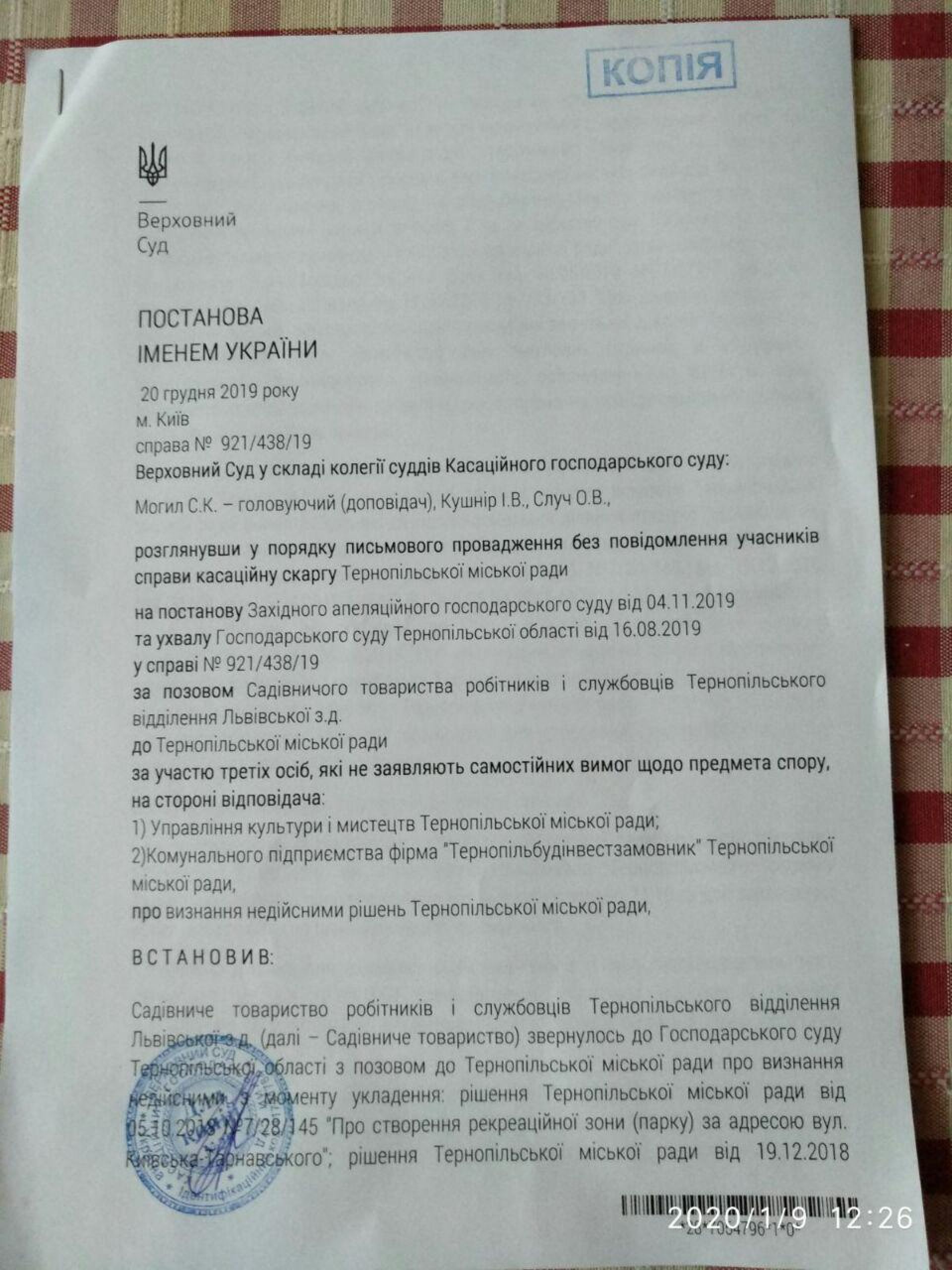 Виконком затвердив детальний план нового парку у Тернополі на вул. Київська – вул. Генерала Тарнавського у четвер, 9 січня. Хоча дачники виграли два суди, які визнали рішення міськради незаконними, в органі місцевого самоврядування повідомили, що 20 грудня Верховний суд України визнав рішення попередніх судів незаконними. А тому міська рада може облаштувати парк на місці дач.