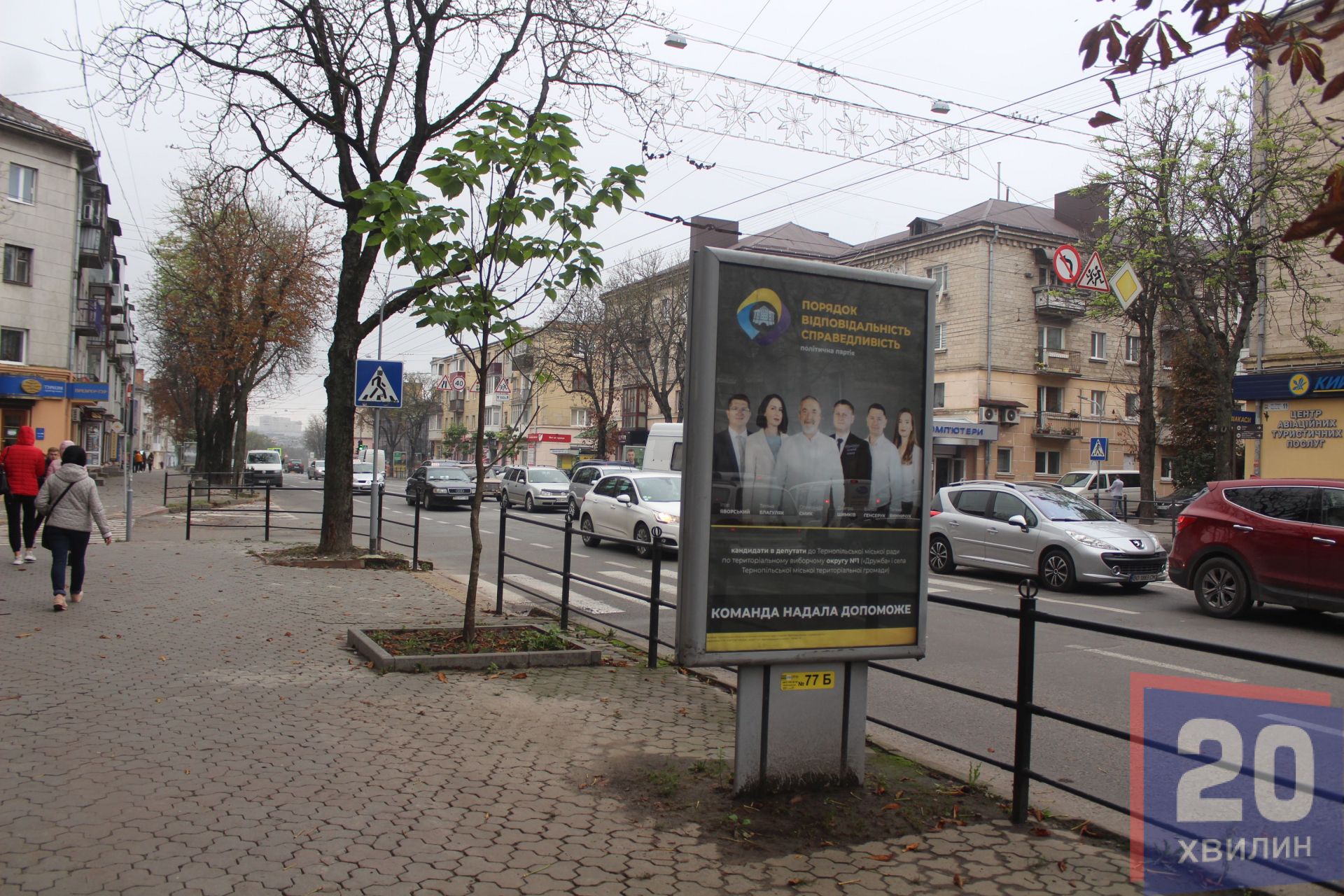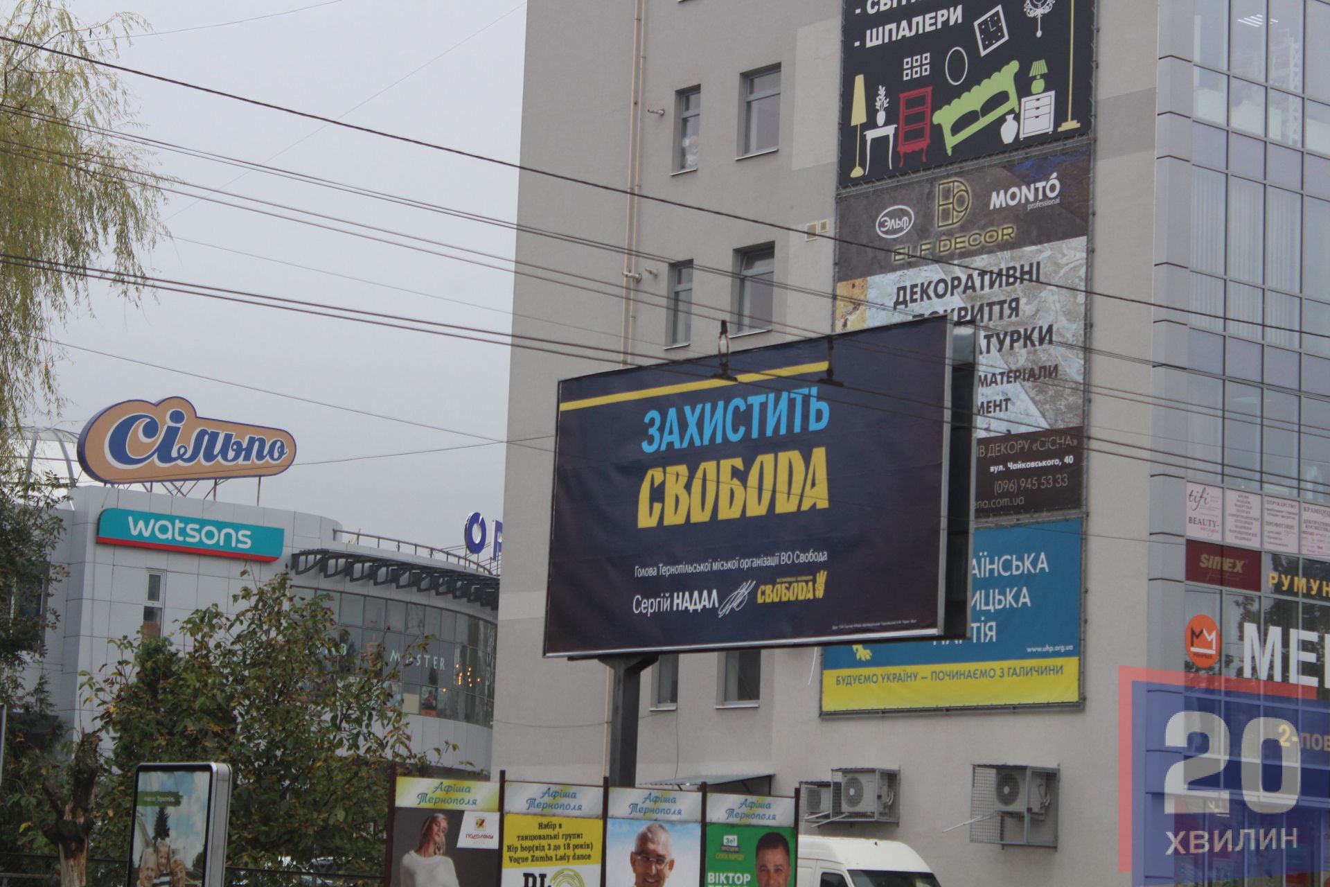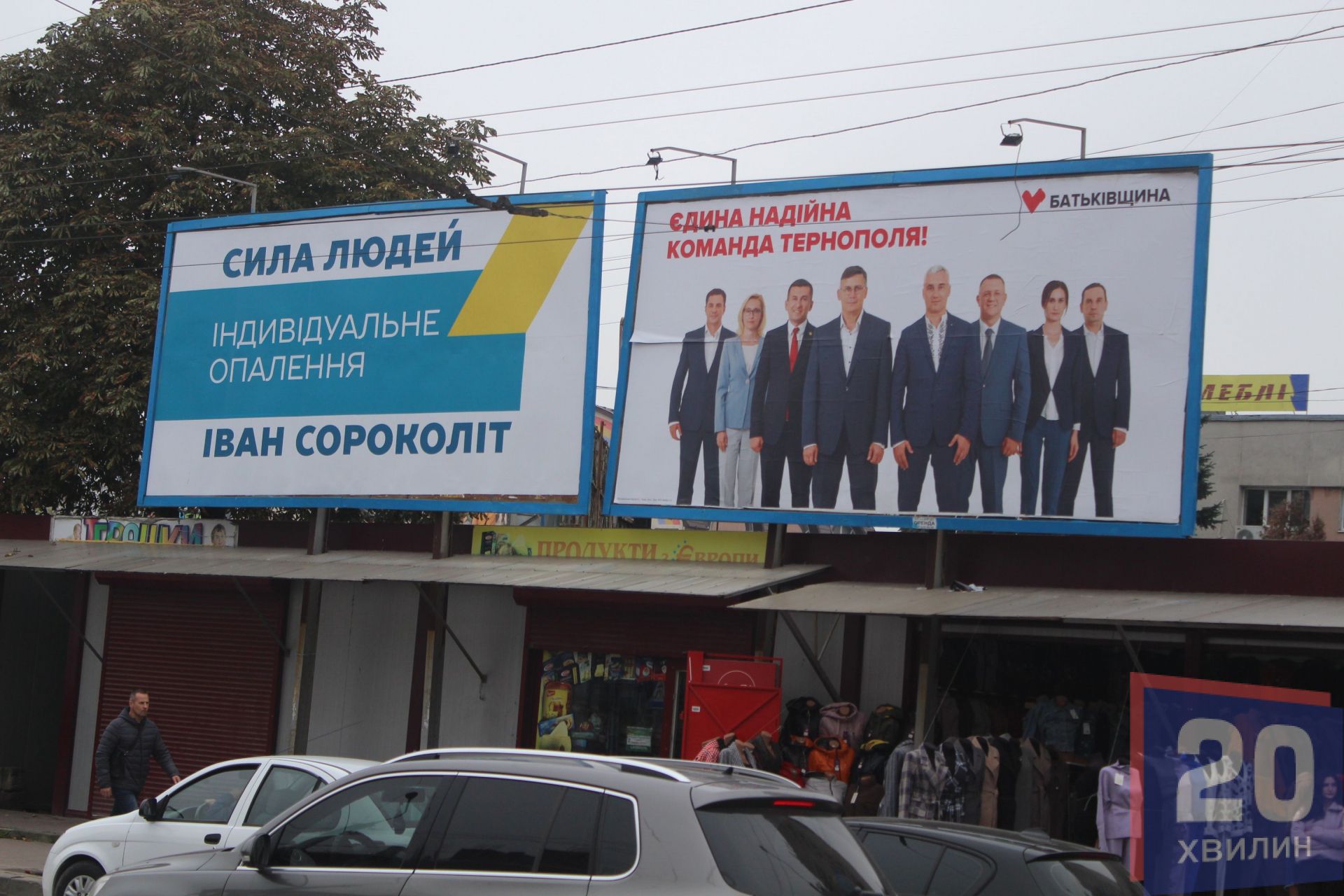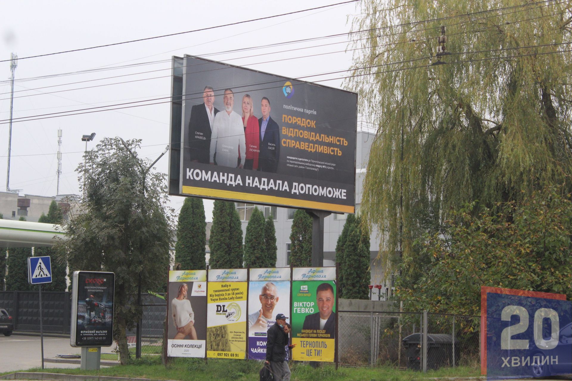 Вздовж набережної Тернопільського ставу встановлені лише сітілайти. Майже всі вони з політичною агітацією. На вулиці Руська великих білбордів також небагато. Там в основному звичайна реклама, але є і агітація за кандидатів та партії.