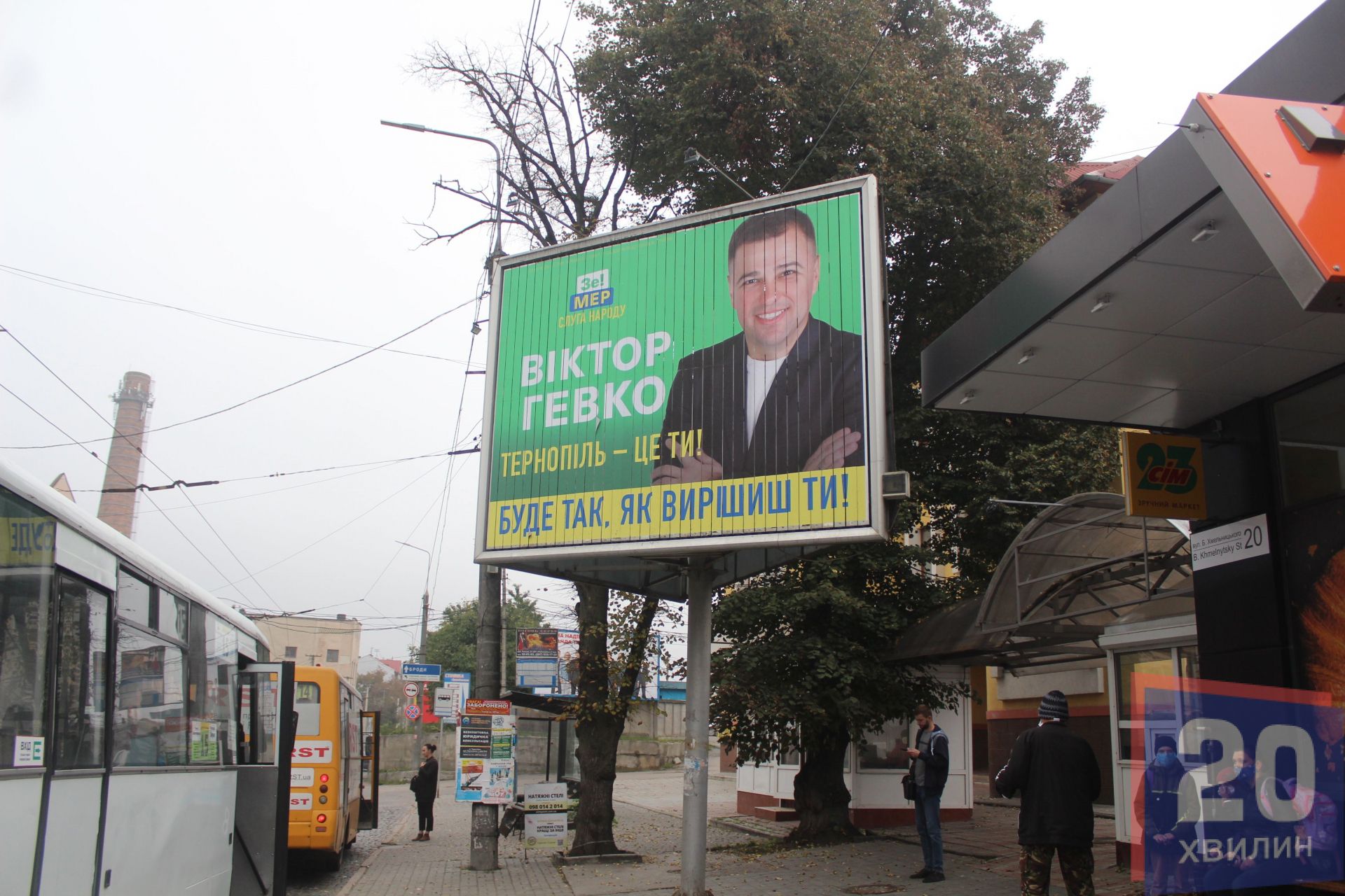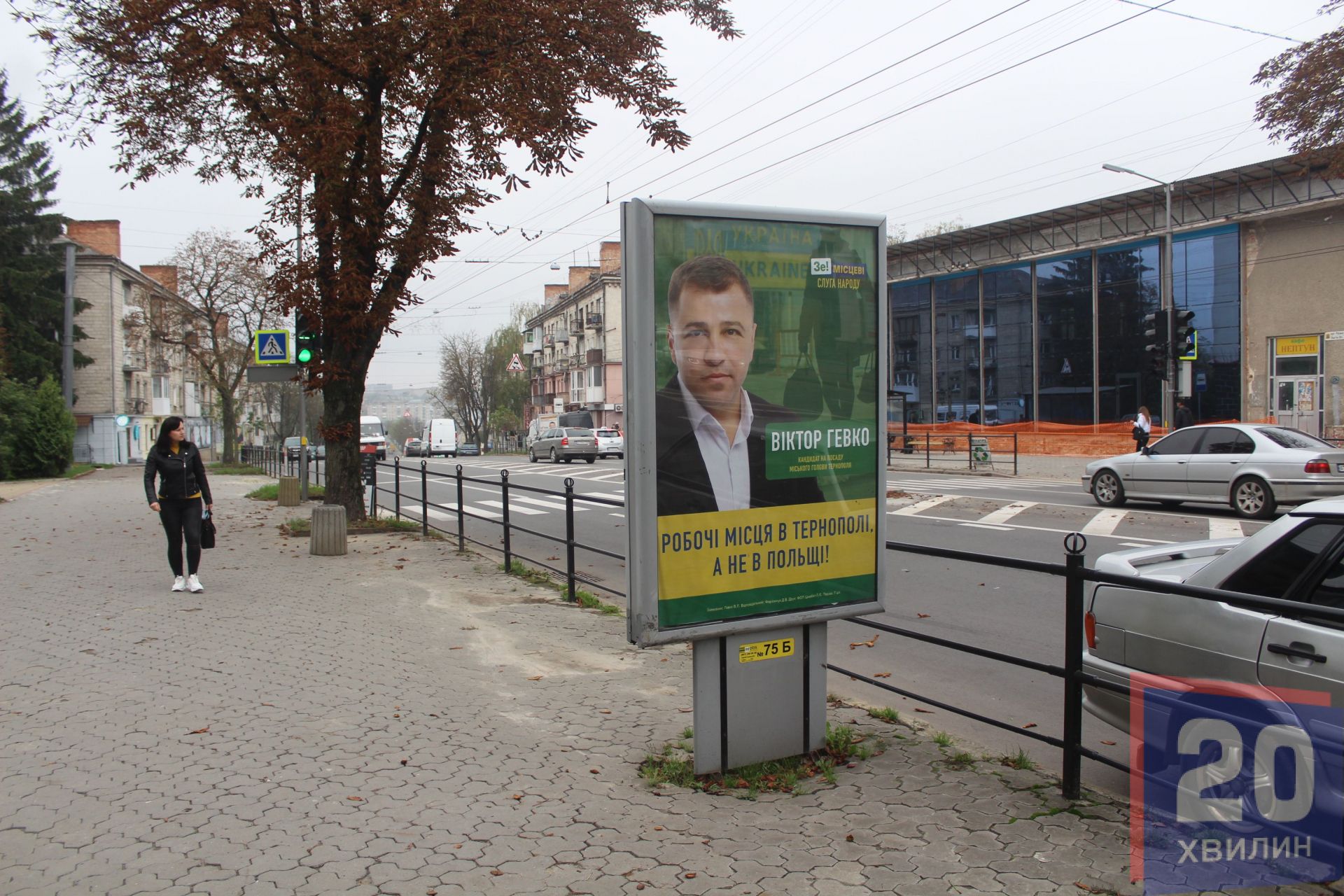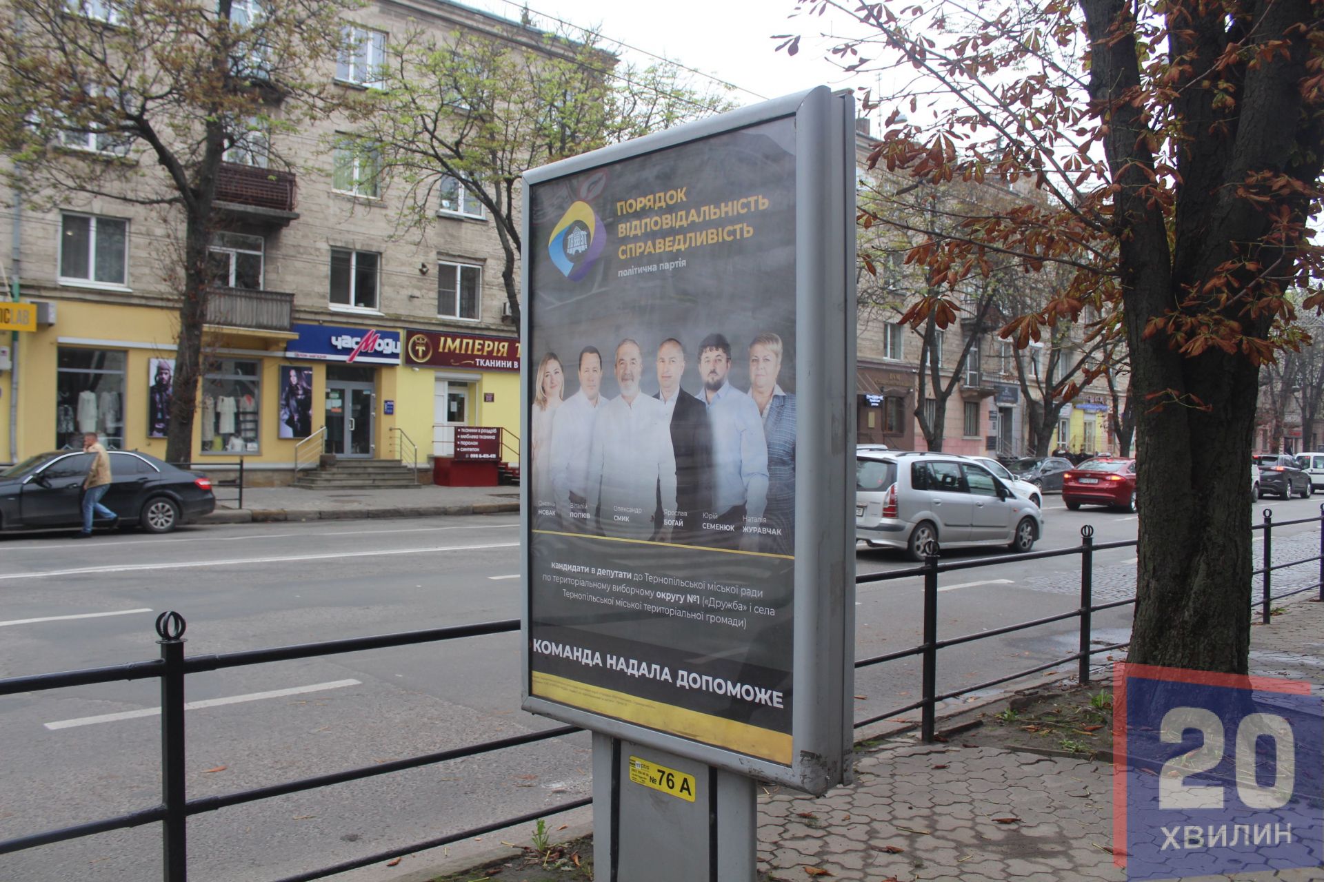 Вздовж набережної Тернопільського ставу встановлені лише сітілайти. Майже всі вони з політичною агітацією. На вулиці Руська великих білбордів також небагато. Там в основному звичайна реклама, але є і агітація за кандидатів та партії.