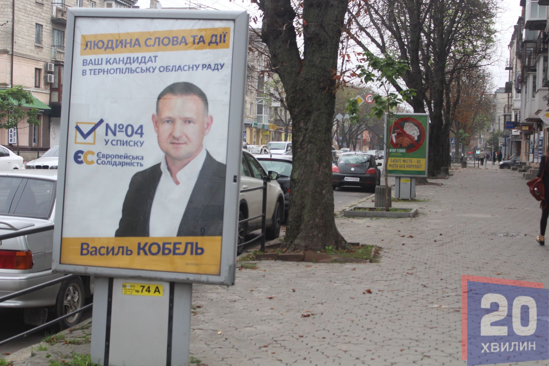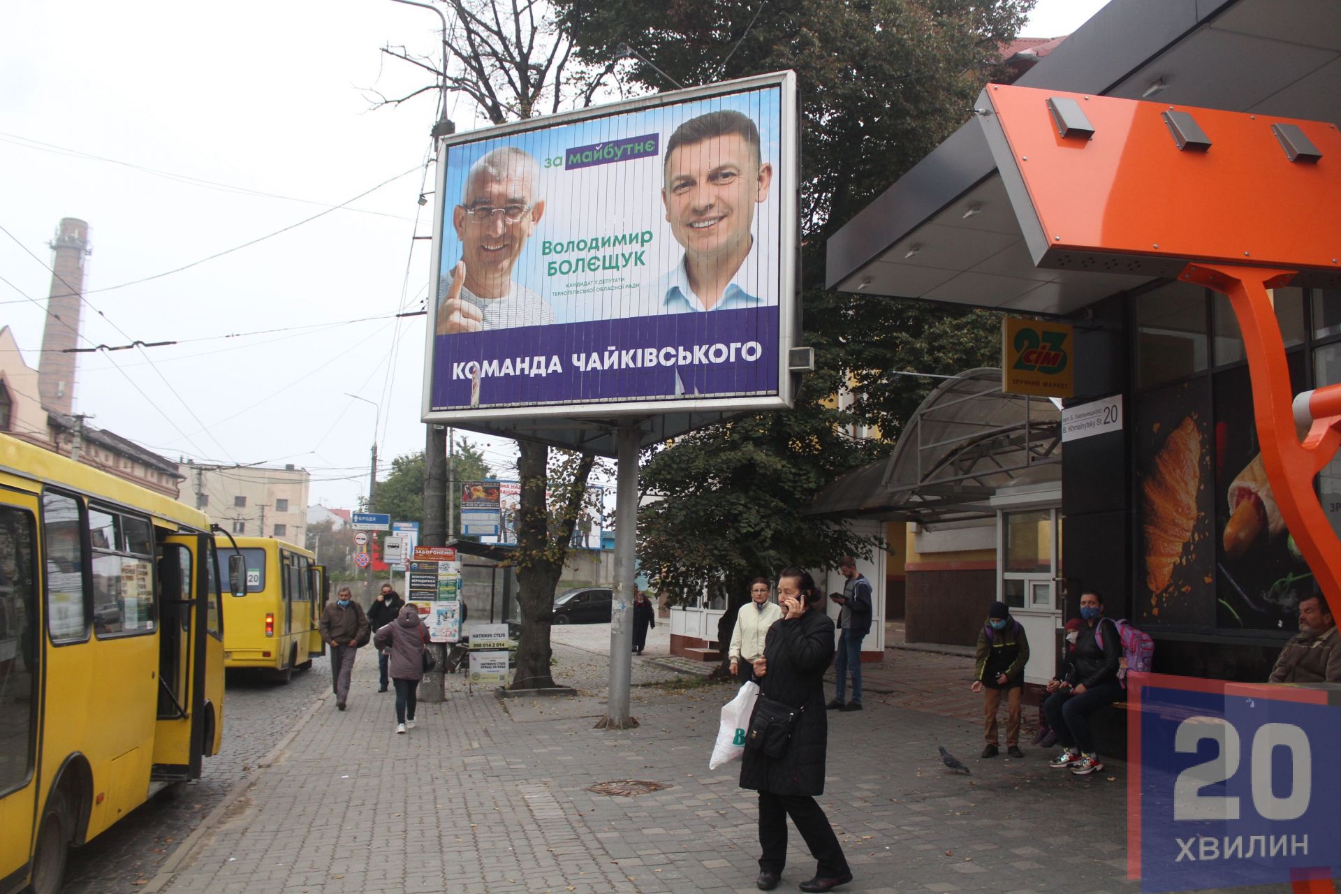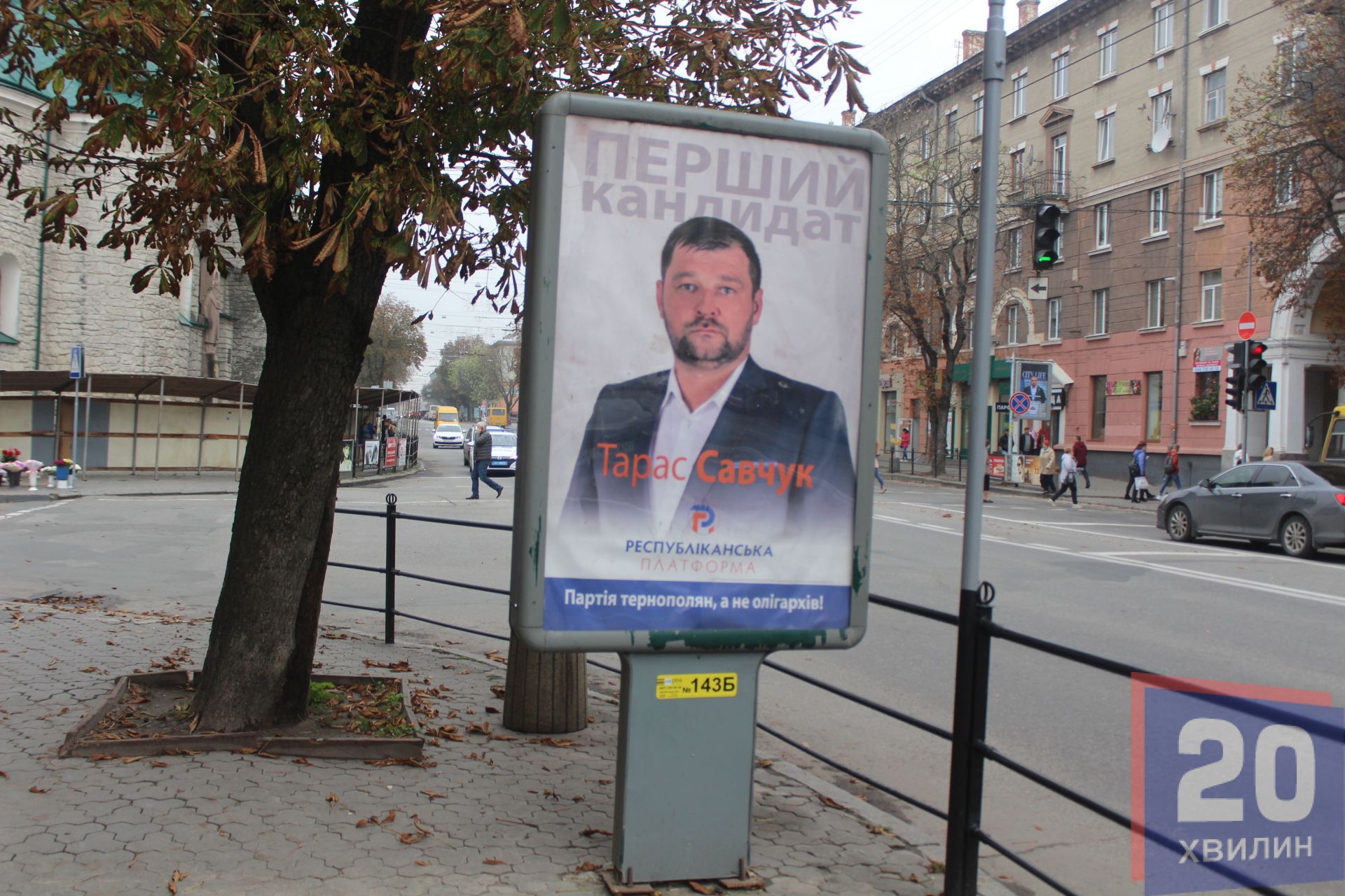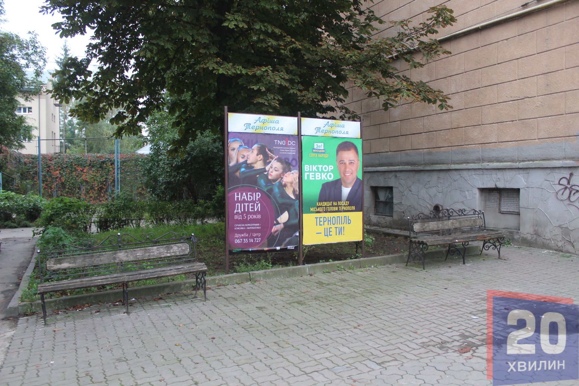 Вздовж набережної Тернопільського ставу встановлені лише сітілайти. Майже всі вони з політичною агітацією. На вулиці Руська великих білбордів також небагато. Там в основному звичайна реклама, але є і агітація за кандидатів та партії.