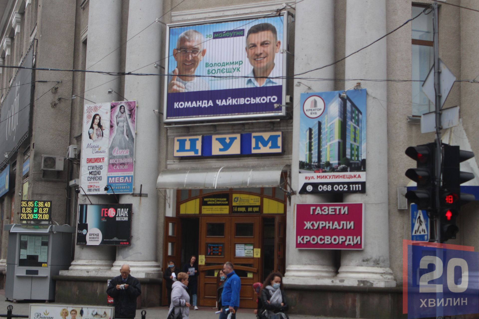 Приміщення ЦУМу також «прикрасила» агітація, однак там є і звичайна реклама. Рекламні банери майорять і на житлових будинках.