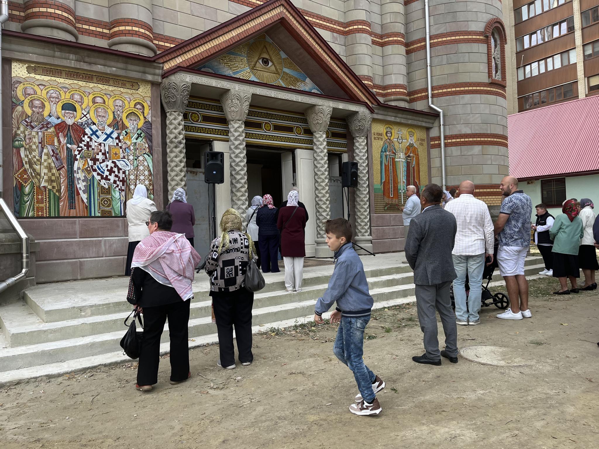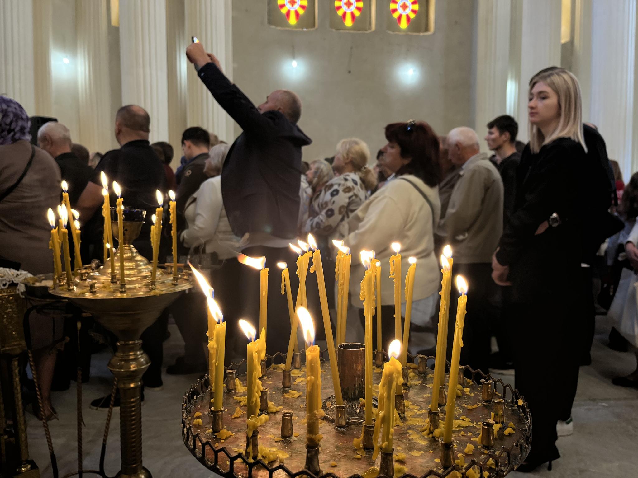 Люди молилися як у храмі, так і надворі. Серед присутніх були і дорослі, і діти — навіть у візочках. Віряни схиляли голови під час молитви та ставили свічки за здоров’я і спокій.
