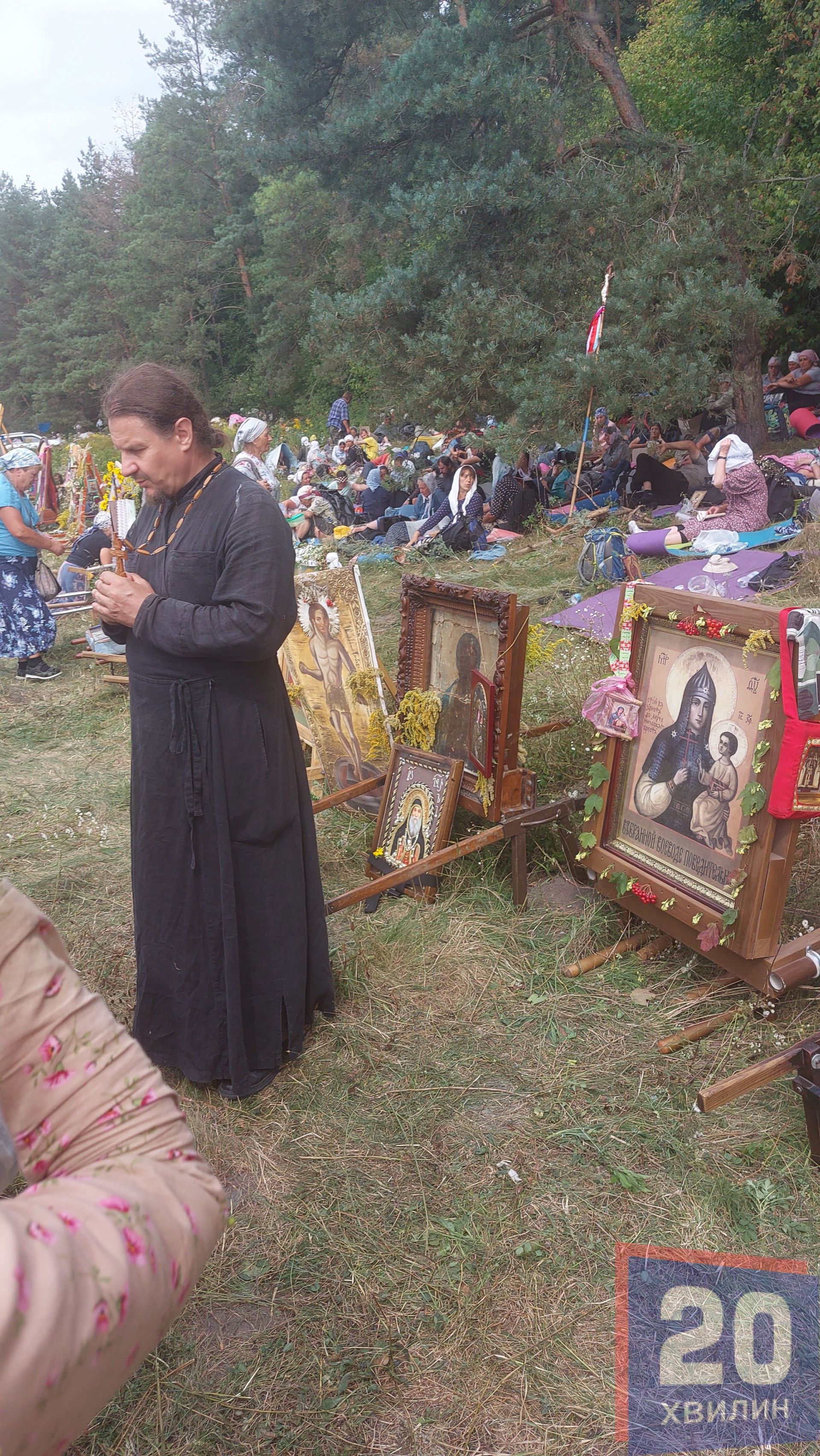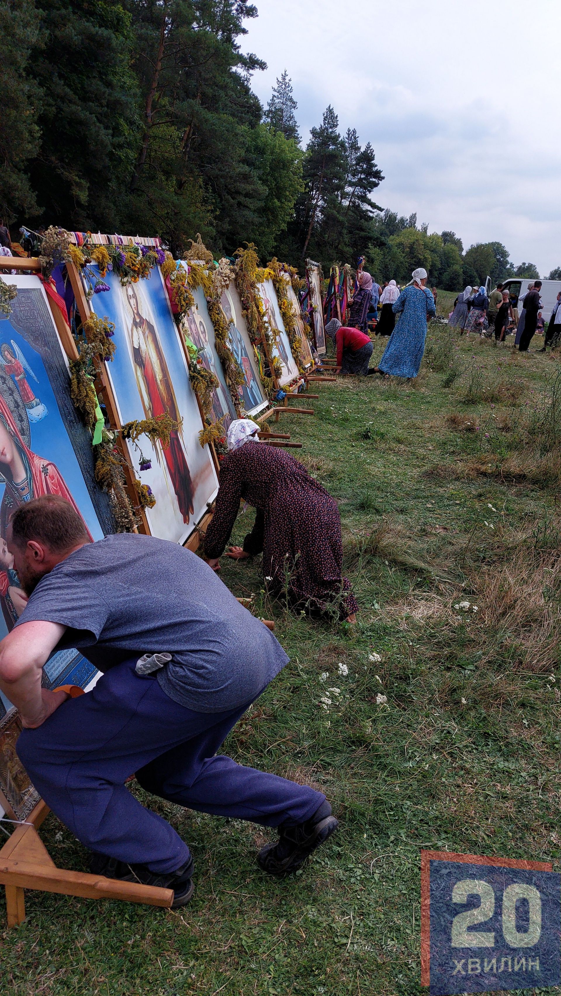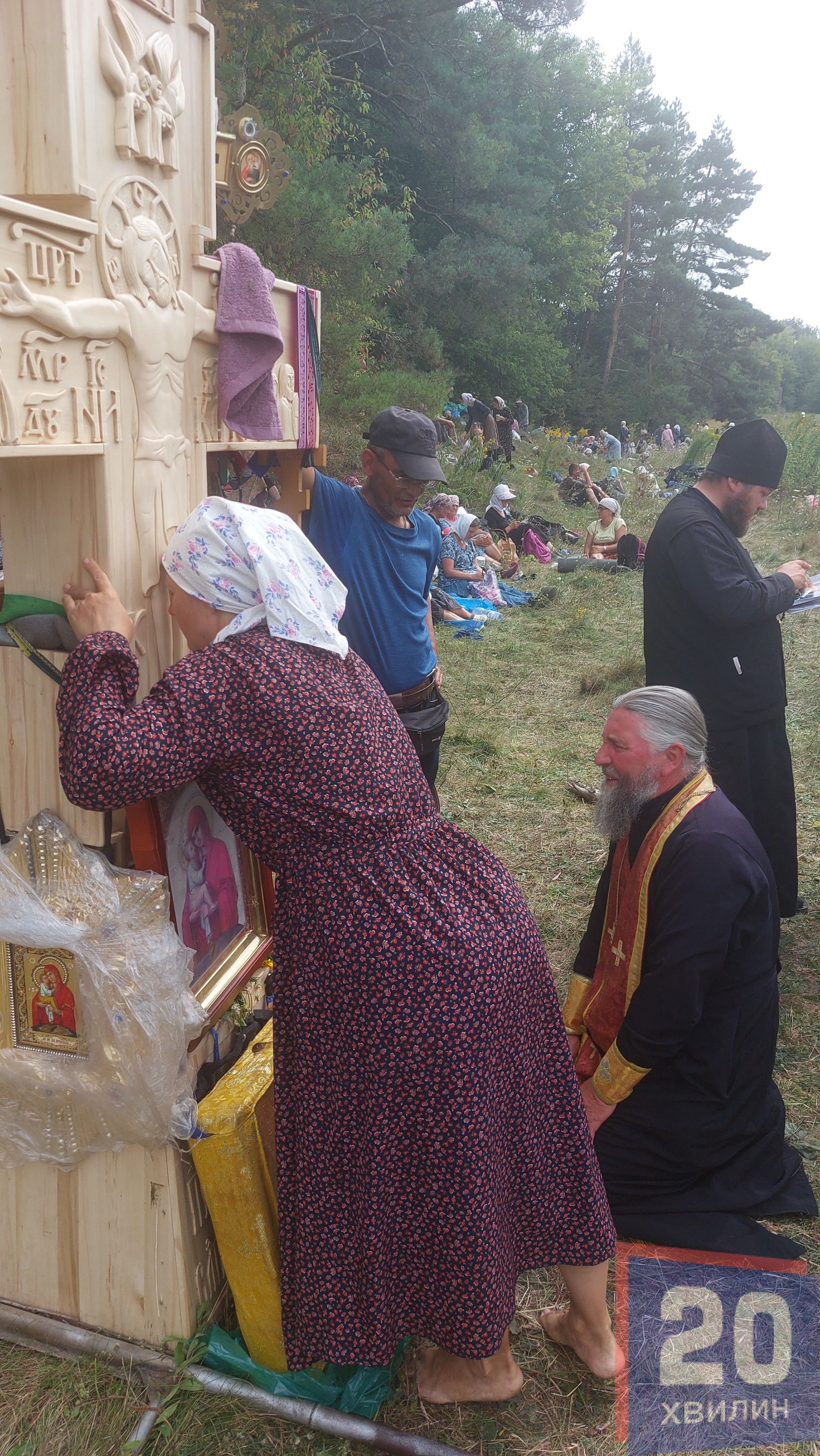 В цей час біля дерев’яного хреста, де ще кілька хвилин тому стояв священик в рясі і кілька жінок, почався молебень. І люди вервичкою потягнулись туди. За мить всі стали навколішки. «Ти, что єсі не нєбєсі…», — промовляв отець і прочани, а їх уже тут зійшлось під сотню, на колінах у колючій траві били поклони.