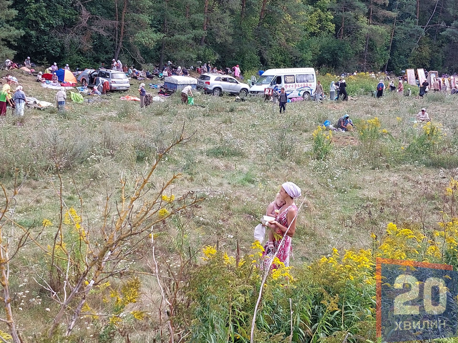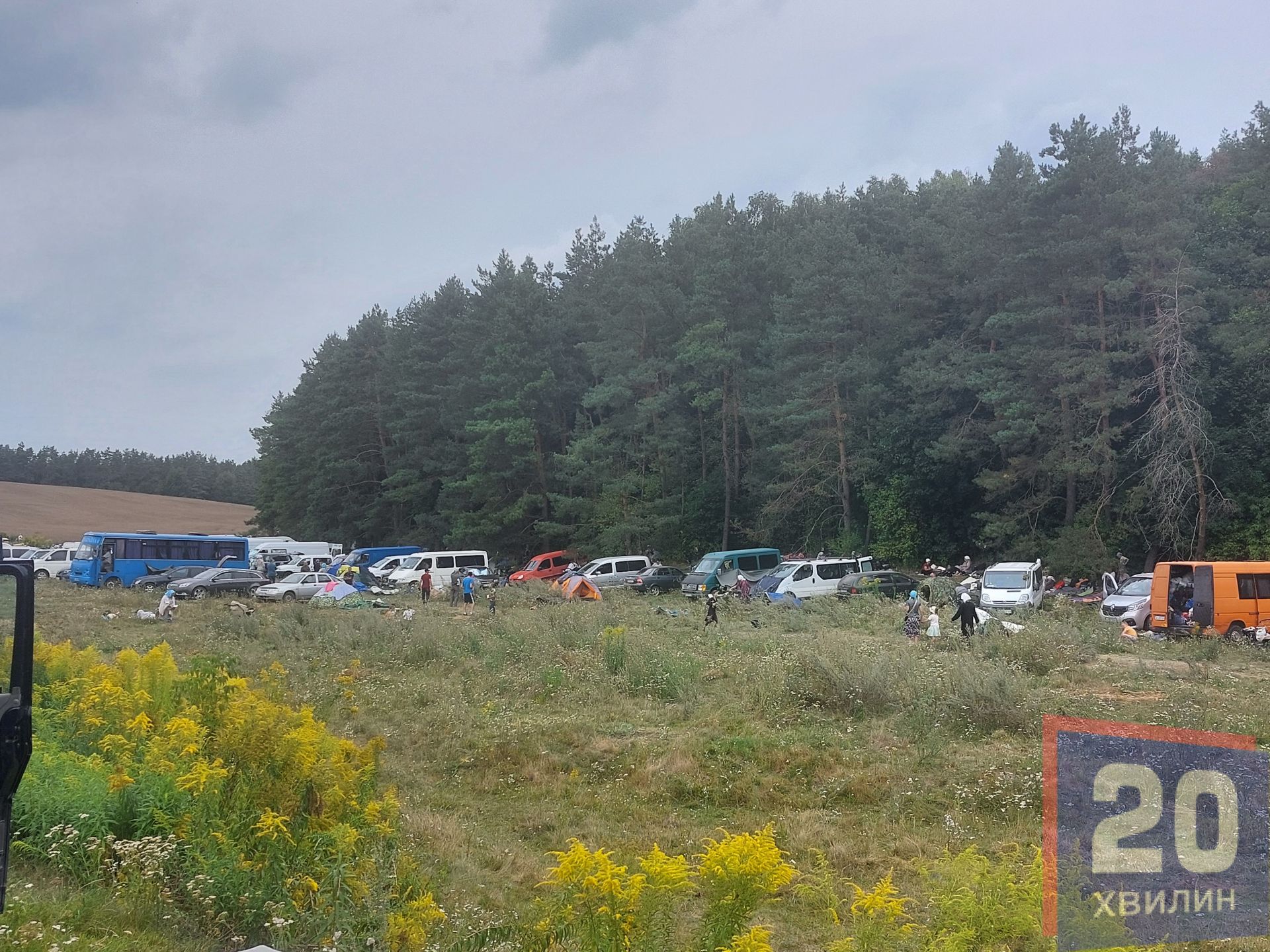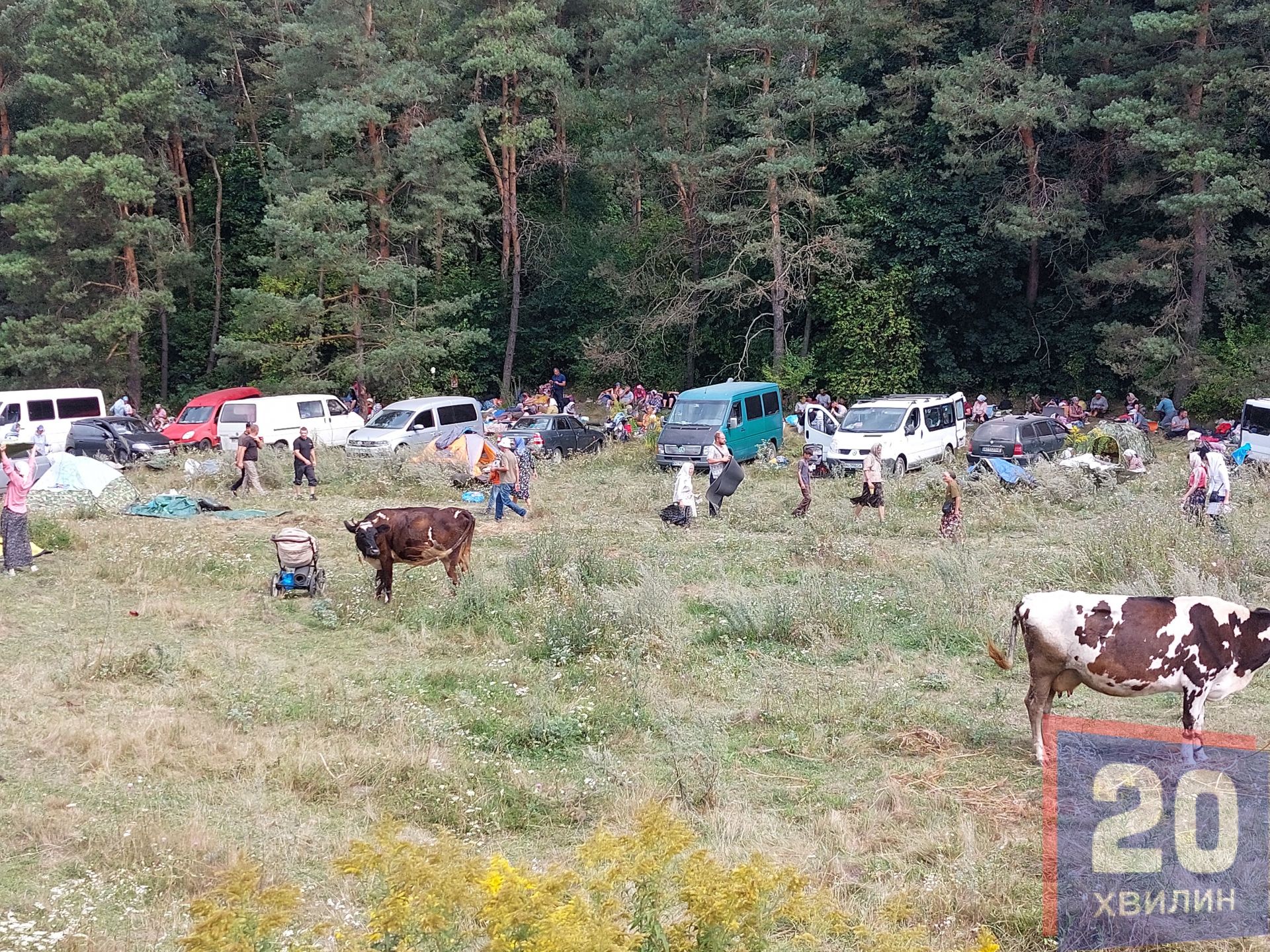 Ліворуч — велика галявина. На ній намети, чимало легкових автівок і бусів, а люди розмістились просто неба. А попереду, не звертаючи увагу ні на прочан, ані на транспорт, паслося кілька корів. Ця галявина, ймовірно, була місцем, де часто випасали худобу, принаймні про це свідчили коров’ячі «млинці», якими рясно всіяно траву.