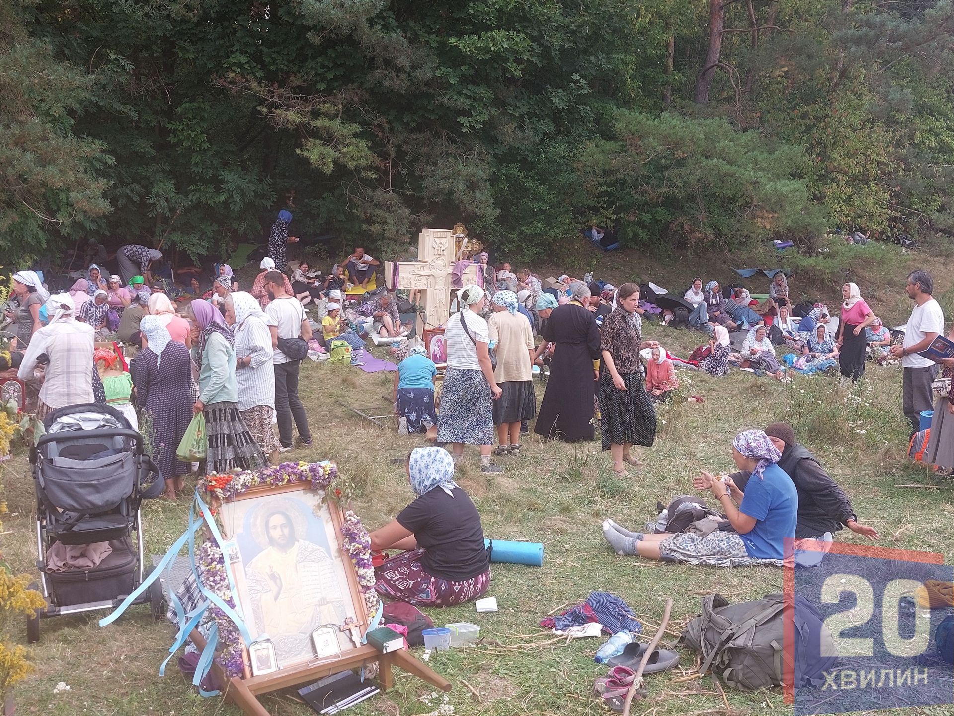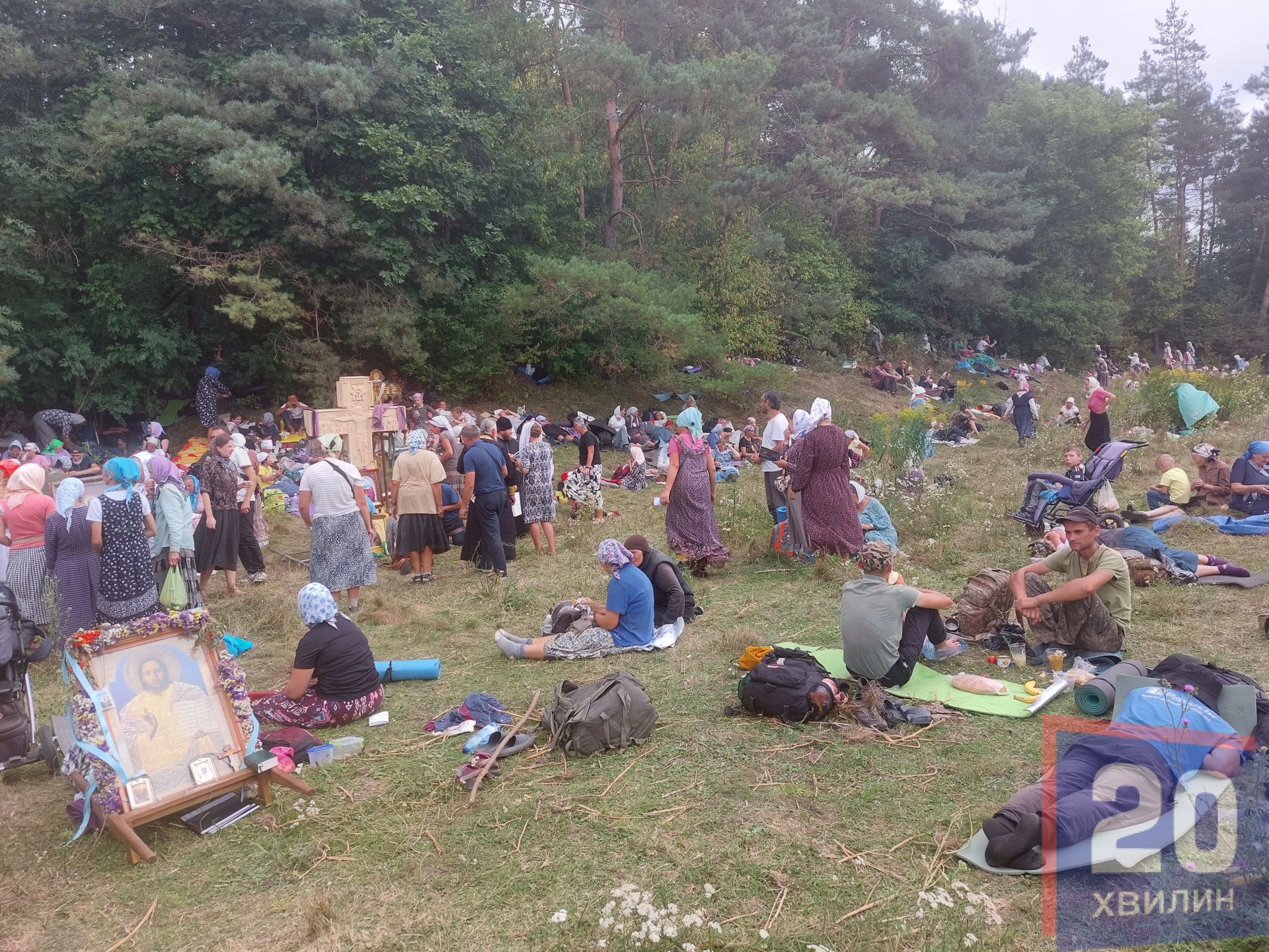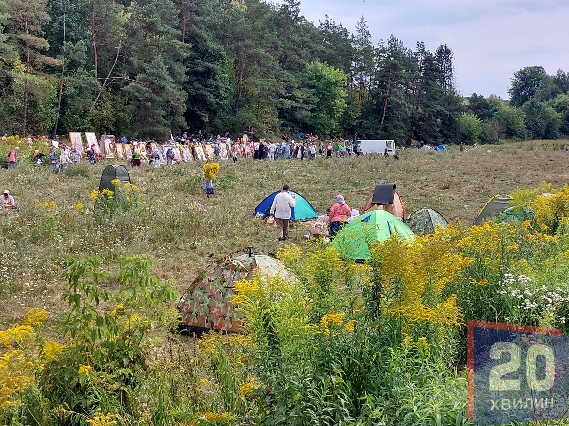 Ліворуч — велика галявина. На ній намети, чимало легкових автівок і бусів, а люди розмістились просто неба. А попереду, не звертаючи увагу ні на прочан, ані на транспорт, паслося кілька корів. Ця галявина, ймовірно, була місцем, де часто випасали худобу, принаймні про це свідчили коров’ячі «млинці», якими рясно всіяно траву.