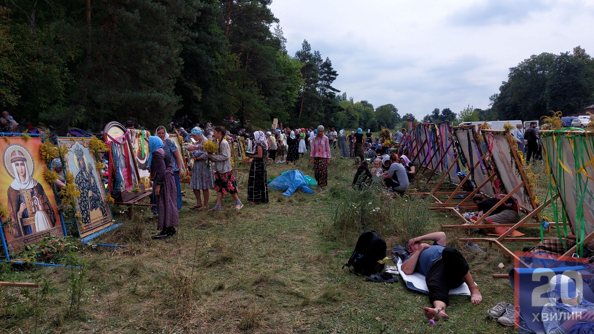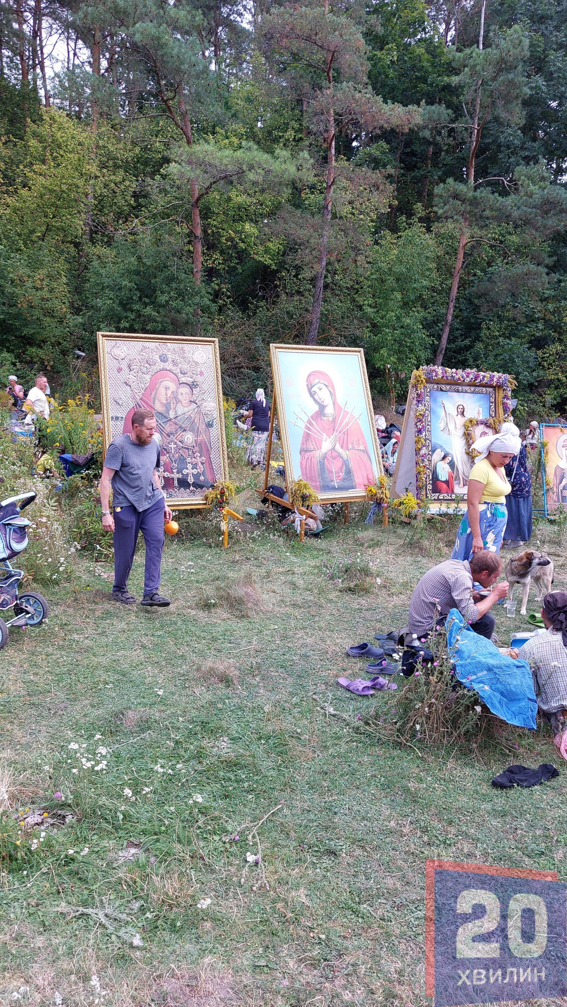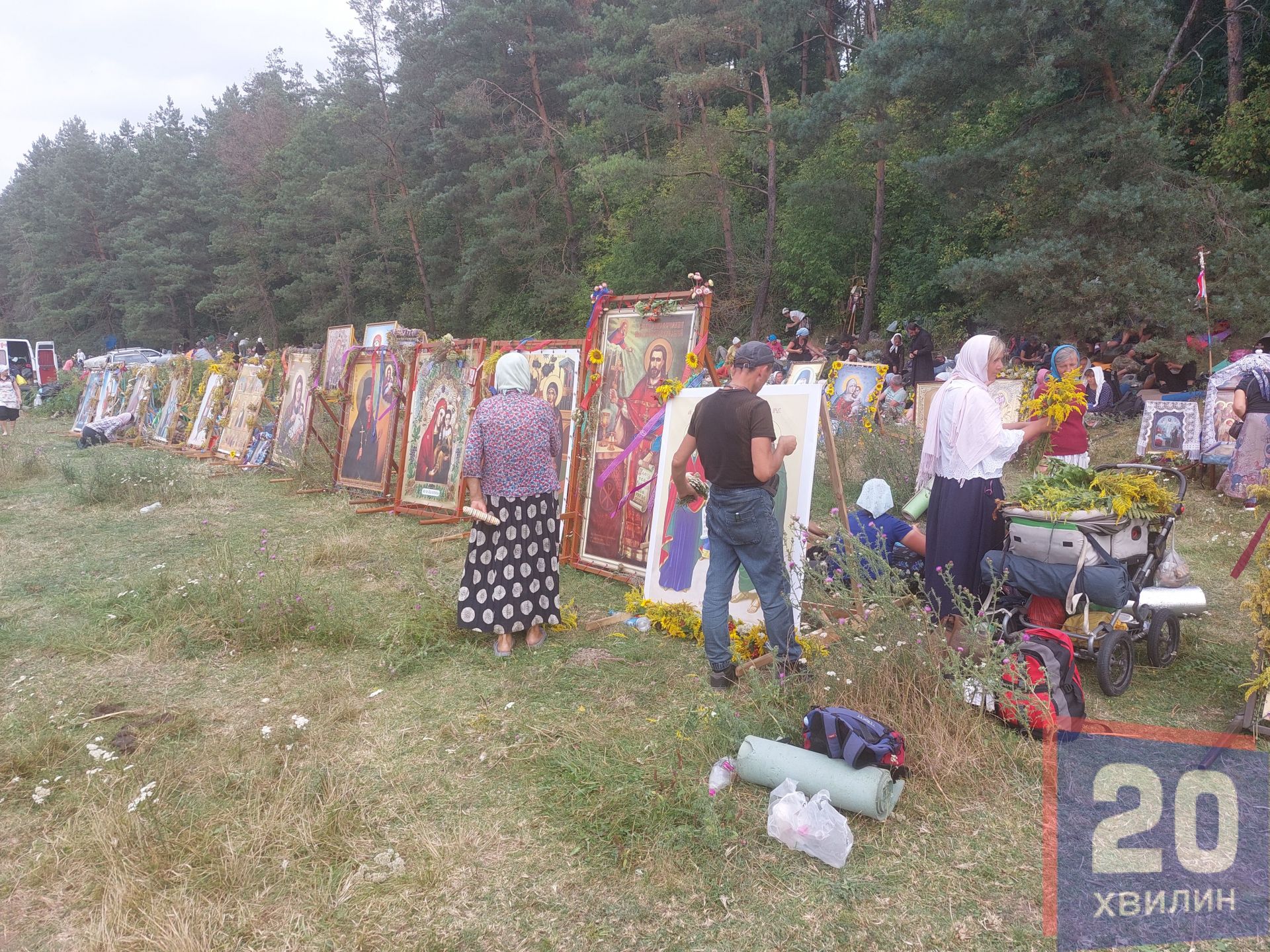 Спускаємось з горбочка, направляємось до людей, аби поспілкуватись. Колючки від будяків боляче впиваються у ноги. Їх тут дуже багато, але прочани, здається, не звертають на це ніякої уваги. Перед нами в два ряди ікон у людський зріст на дерев’яних підставках, жінки сортують польові квіти та прикрашають ними рами, вплітаючи до зілля стрічки. Деколи люди підходять до ікон, вклоняються або падають на коліна. Щось шепочуть, і, підіймаючись, цілують образи. Праворуч великий дерев’яний хрест. Ймовірно, той, про який нам казали місцеві, що його несли попереду колони.