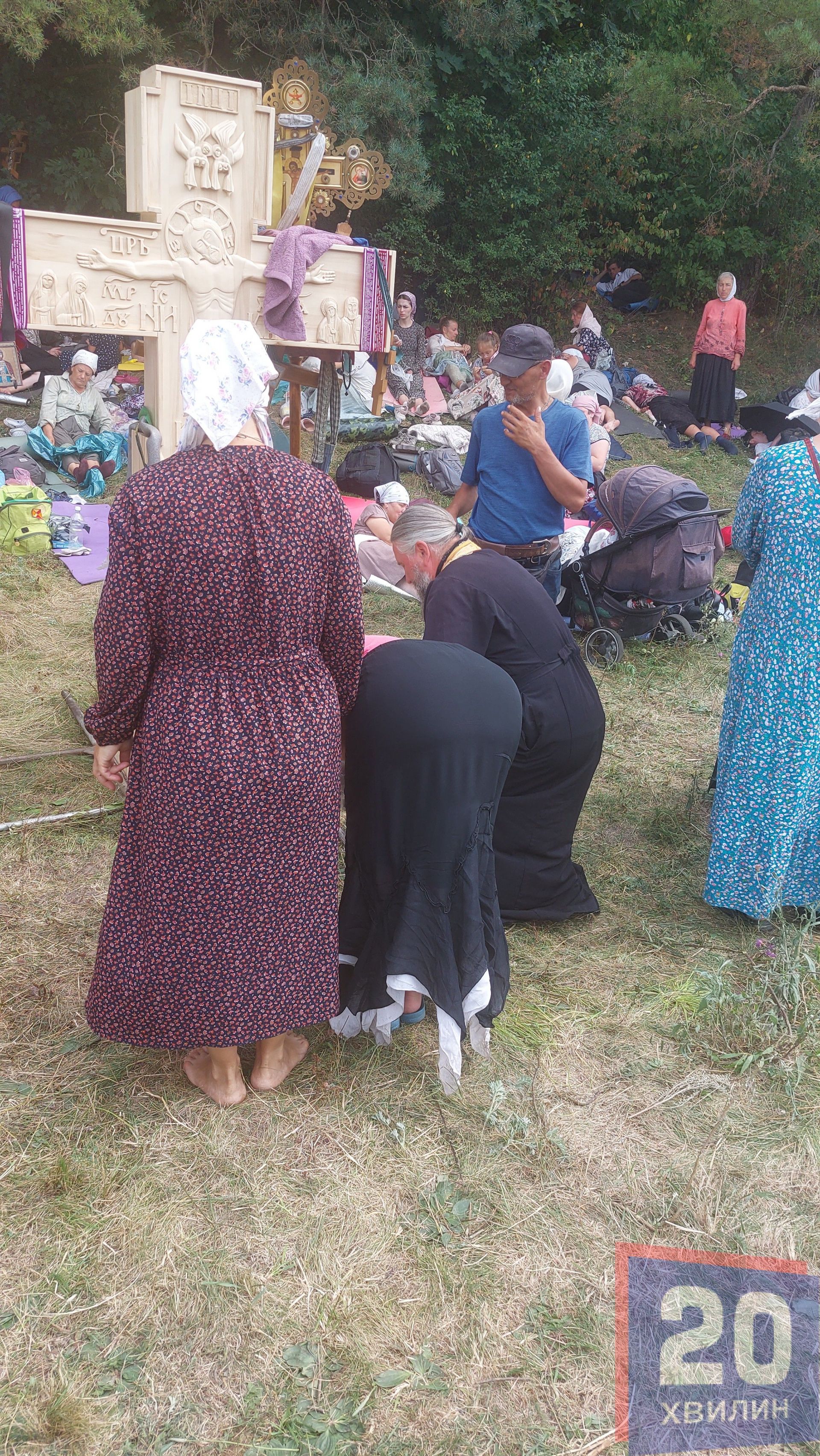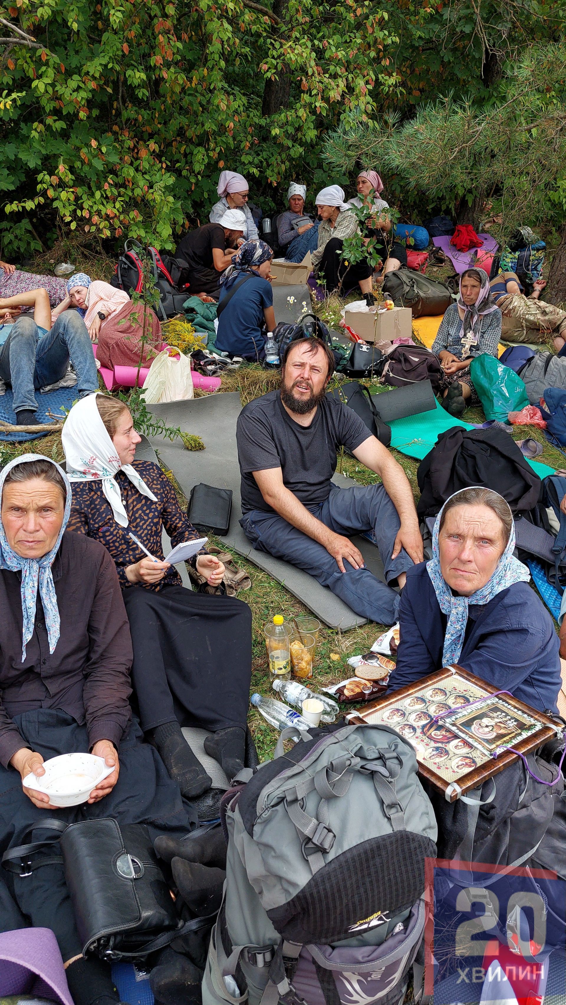 Зазначимо одразу, що на галявині, де відпочивали паломники, ми не бачили георгіївських стрічок, хоча і заглядали за ними, адже в однієї з прочанок на Хмельниччині таку помітили і оштрафували жінку. Не чули й російської, окрім як на молебні просто неба. Можливо, хтось нею і розмовляв, але принаймні ті, що спілкувались із журналісткою, докладали максимум зусиль, аби говорити без русизмів.