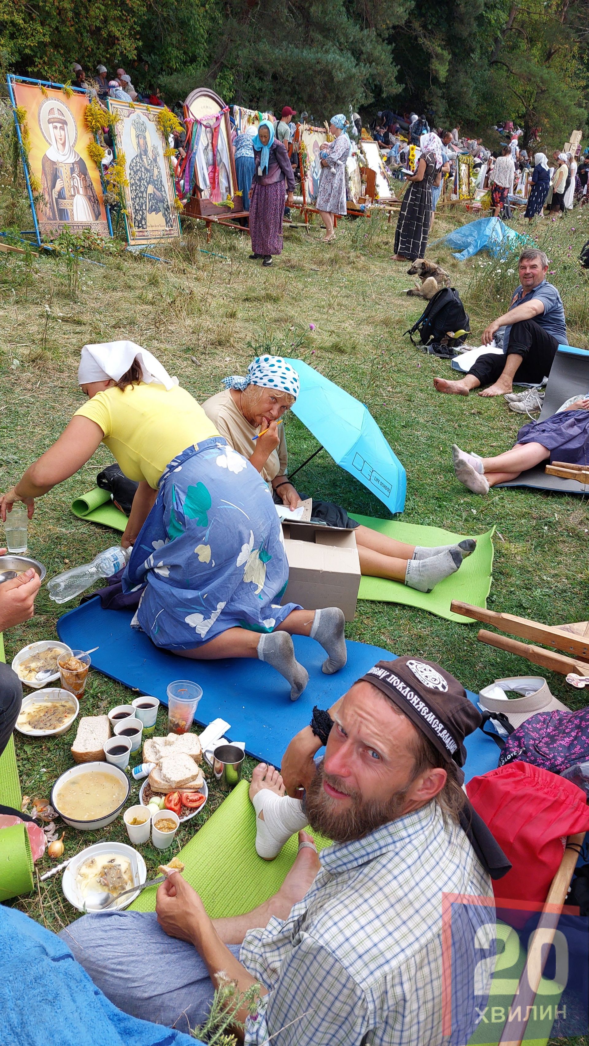 — Доброго дня, смачного, можна з вами поспілкуватись? — підходжу до людей. В цей час кілька десятків прочан, що сиділи за пару метрів, звернули на нас увагу. Дехто надто ретельно розглядав бейдж з посвідченням із написом преса, що висів на стрічці на шиї журналістки.
