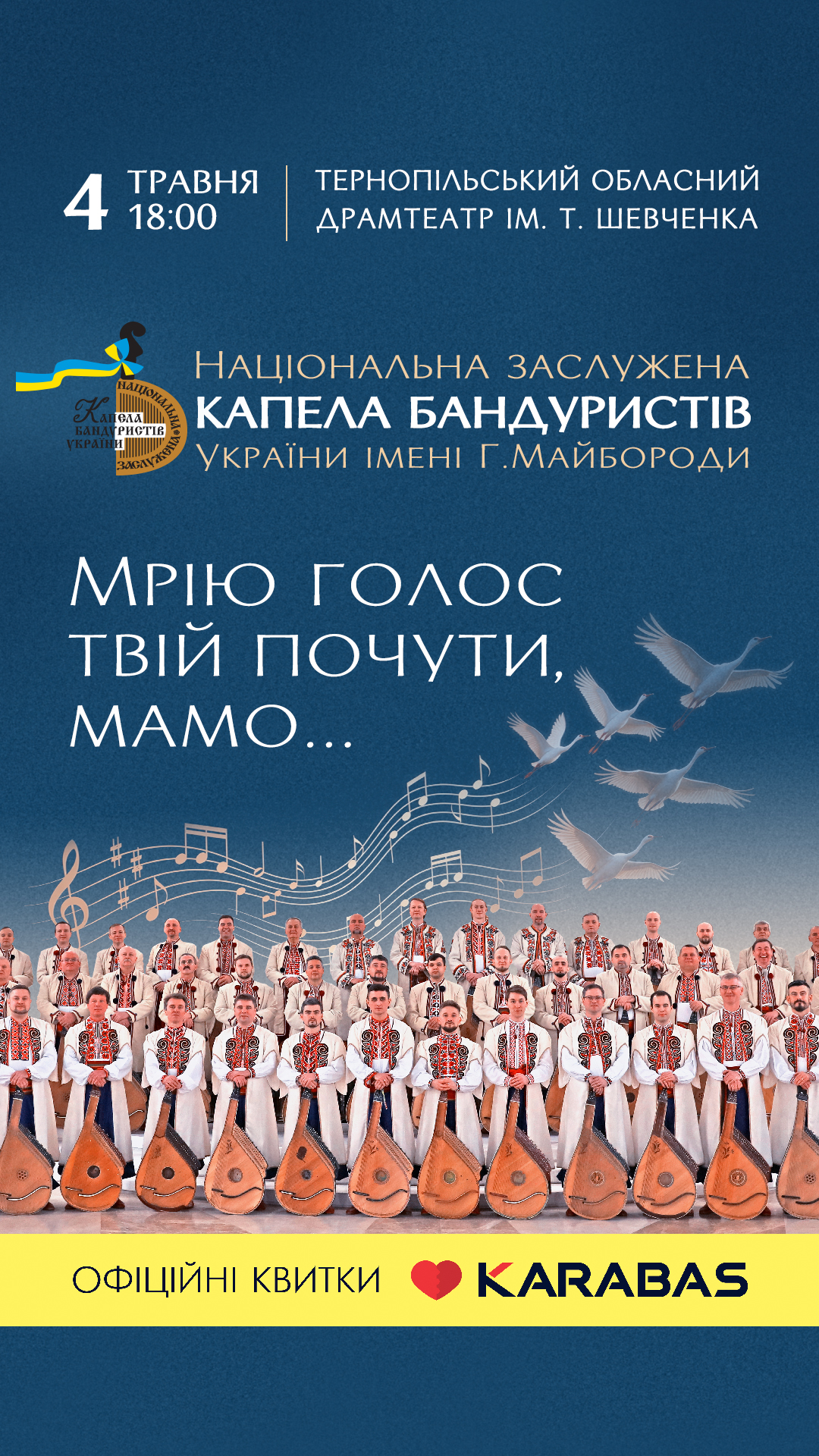 Квитки на подію можна придбати за посиланням: Капела Бандуристів ім. Г. Майбороди 04-05-2026 - Афіша Тернополя