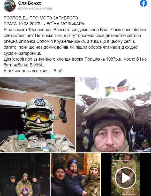 — Цієї історії про звичайного хлопця Ігорка Пришляка 1987р.н. могло б і не бути якби не ВІЙНА, — пише Ольга Божко. — А починалось все так: жив собі не тужив рижуватий хлопчина Ігорко. До Білецької школи він ходив, змалку різноманітних тварин досліджувати любив. Чого тоді він тільки додому не приносив (павуки, ящірки, тритони, саламандри, жаби, черепахи, акваріумні рибки, мишок, щурів, морських свинок, попугаїв, синичок, сороку, голубів та й яструба в додачу.