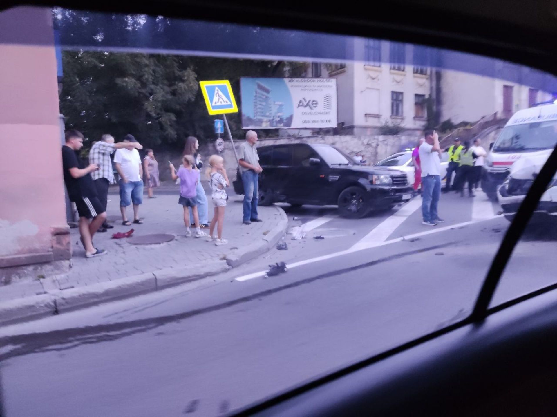 Зіштовхнулися дві автівки — «Рендж Ровер» та «Шкода». На місці аварії працюють всі спецслужби, зокрема, і медики.