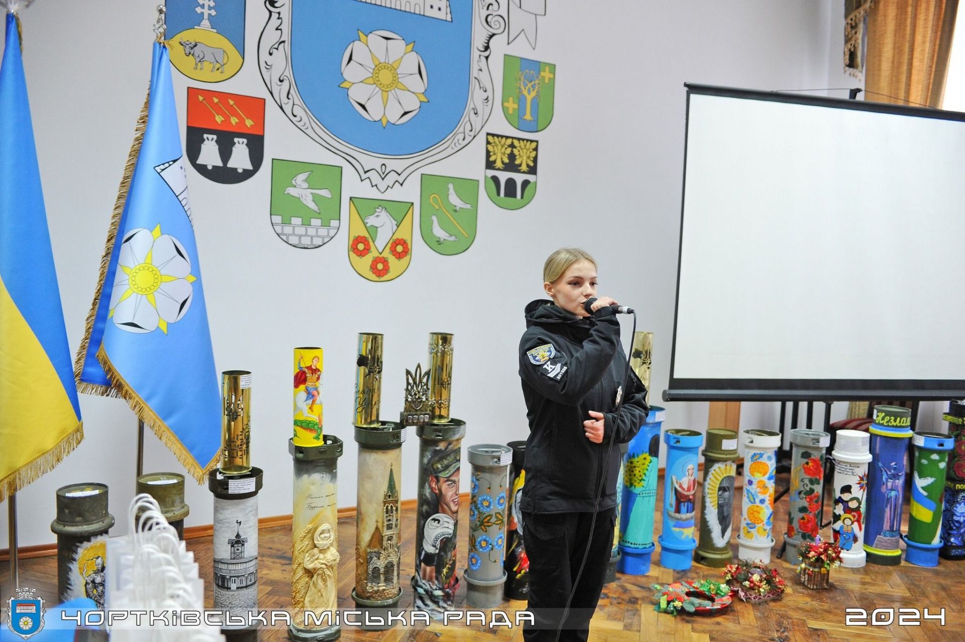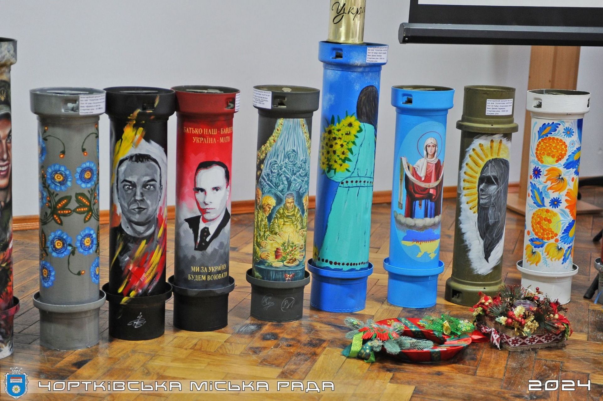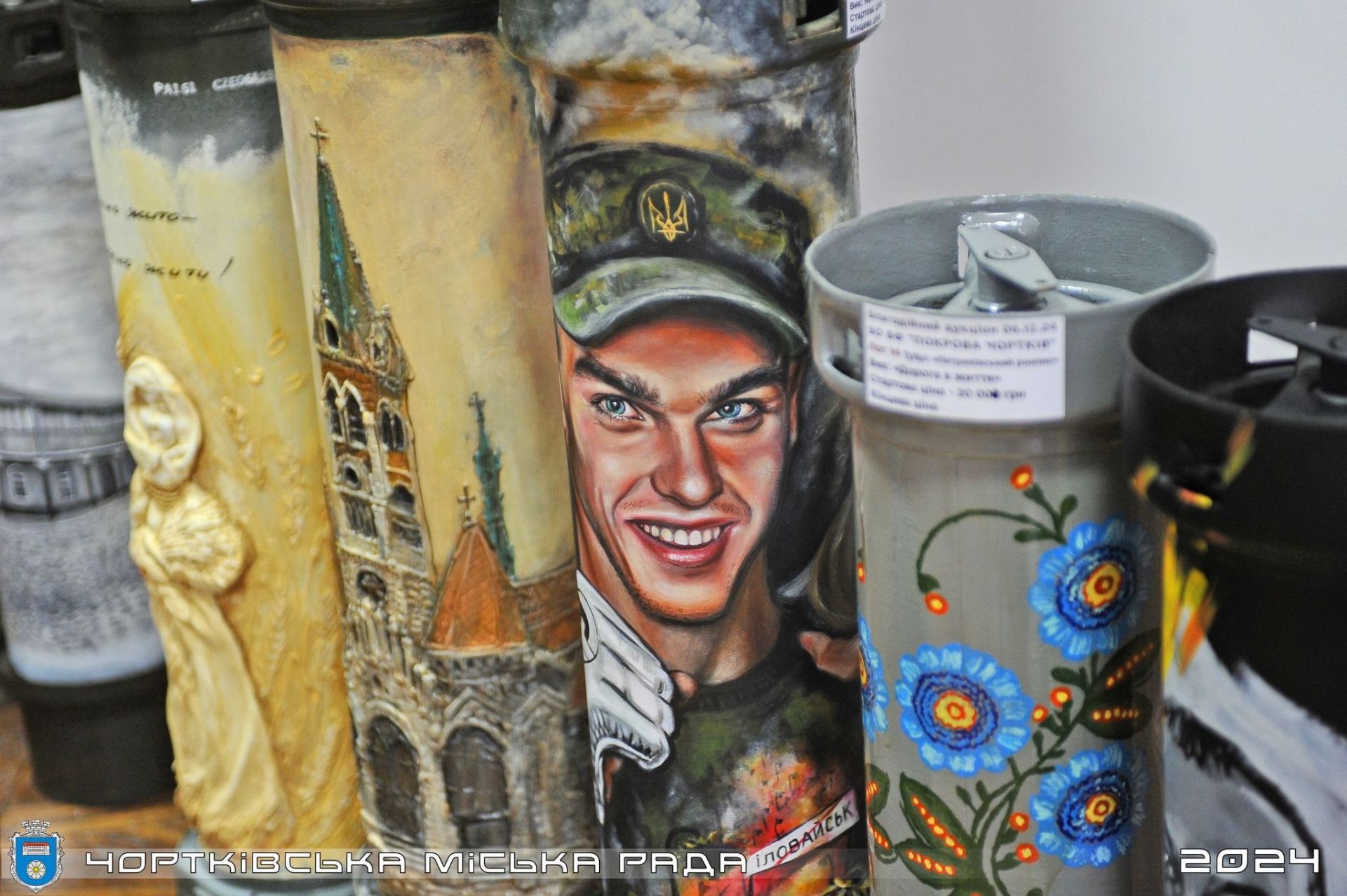 Серед лотів — розфарбовані артилерійські тубуси та гільзи із портретами полеглих Героїв Чортківської громади, Степана Бандери, архітектурою Чорткова тощо.