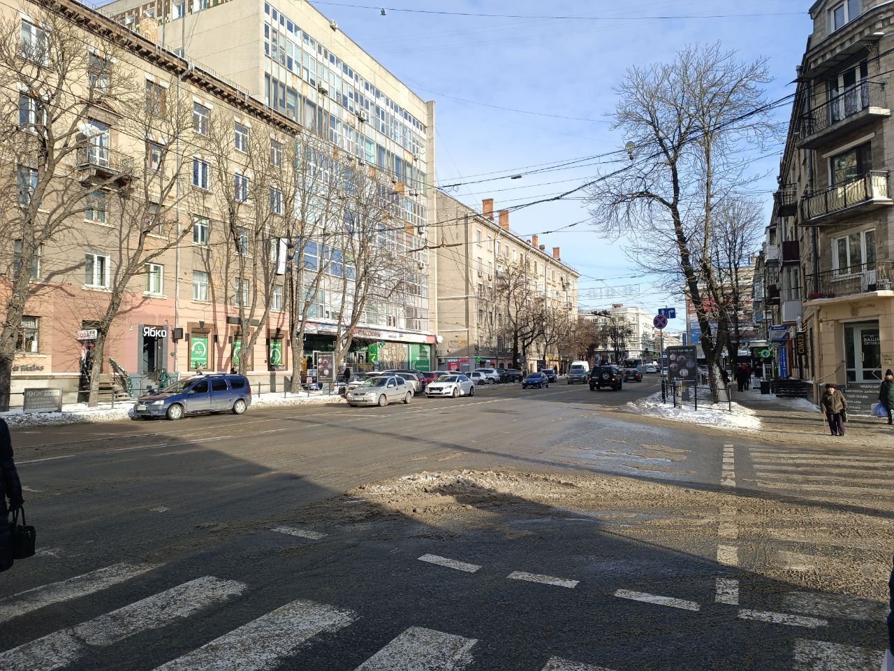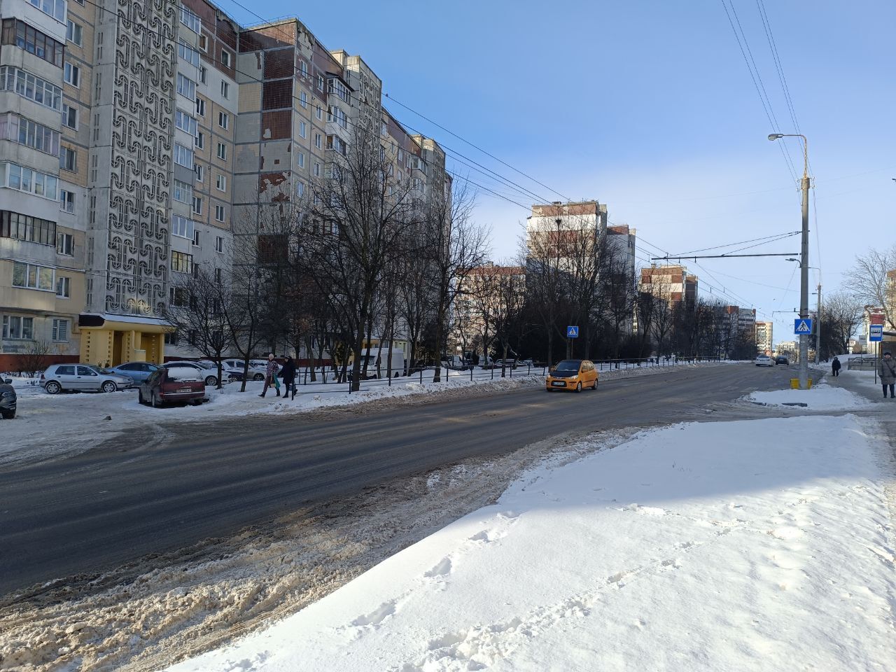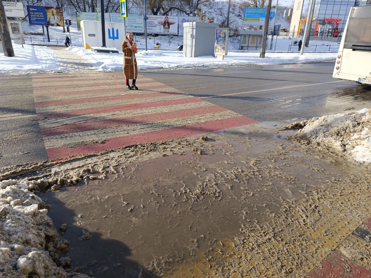 Дорогу на Бродівській почистили, однак на узбіччі тане сніг. На пішохідному переході - калюжі, тож обійти їх важко.