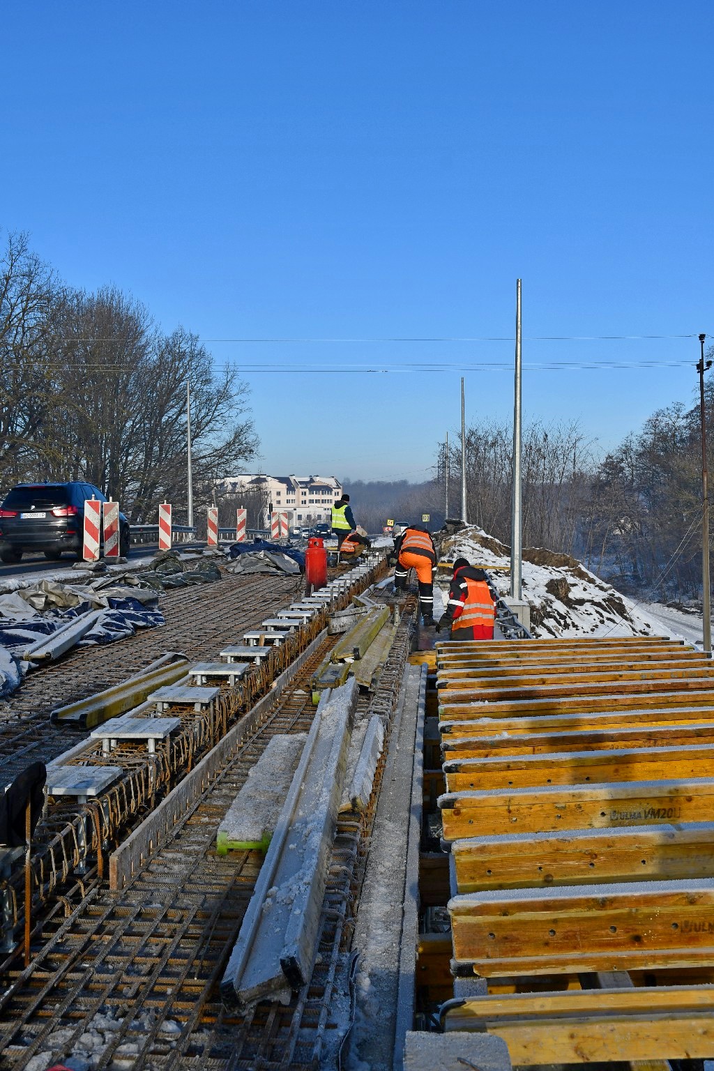 «Зараз підрядна організація Служби відновлення ремонтує правий проїзд. Нині мостобудівники готують монолітно-розподільчу плиту проїзду до бетонування, а саме зв’язують арматуру. Щойно погодні умови дозволять, влаштують бетон», — зазначають в службі.