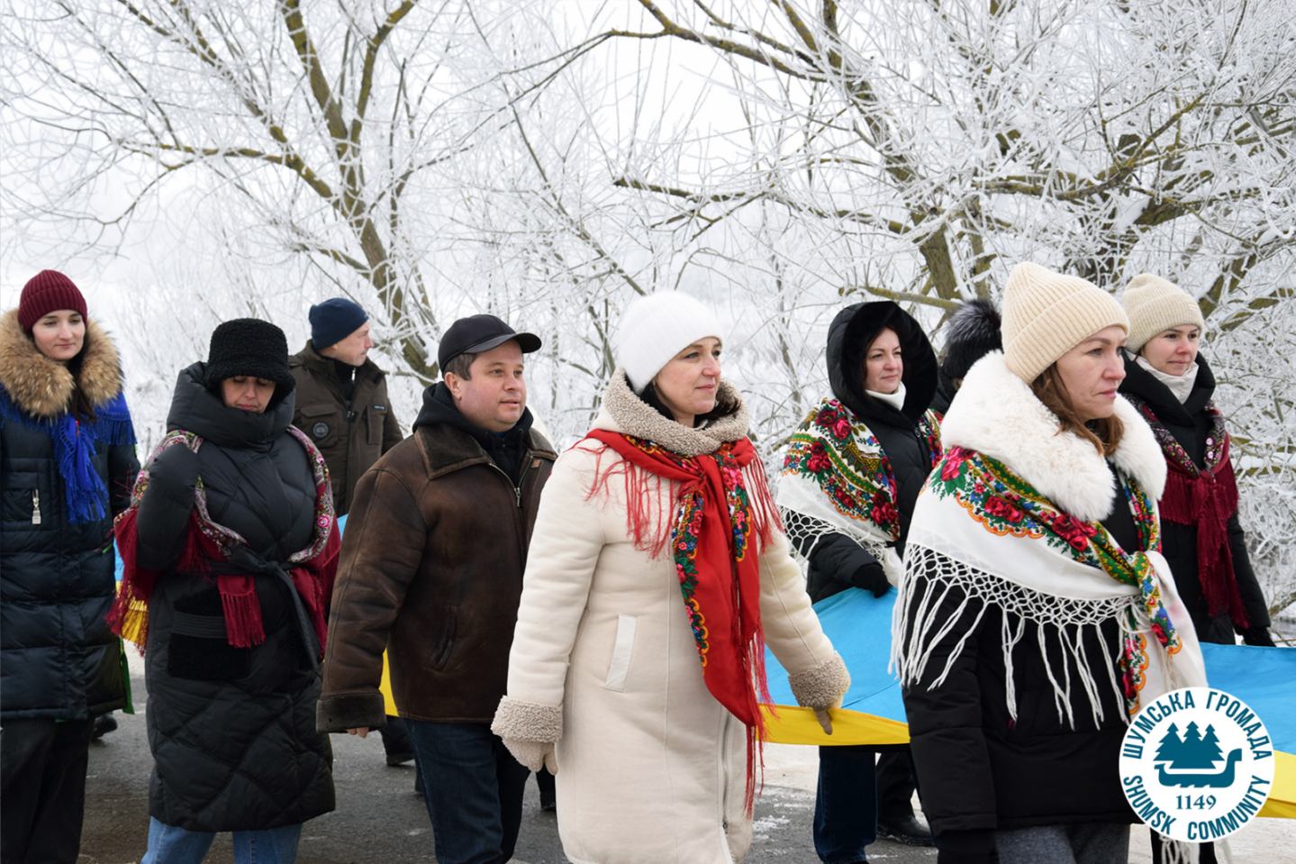 У День Соборності України, 22 січня, на межі Тернопільської та Хмельницької областей, між селами Сураж і Зіньки, відбулася зустріч представників двох сусідніх громад – Шумської та Білогірської. Вони спільно розгорнули національний прапор та обмінялися короваями на знак єдності й соборності України.